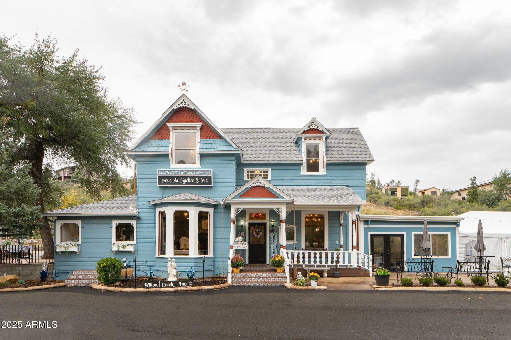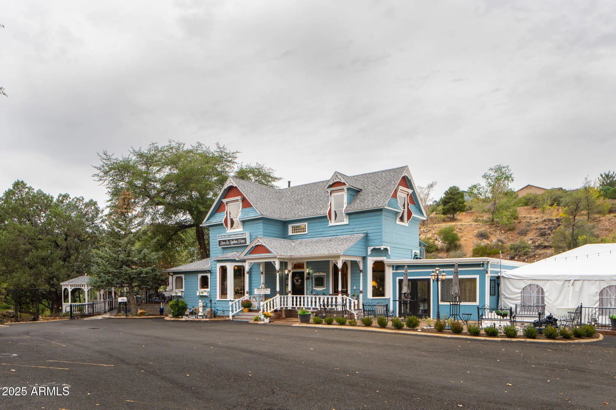 Step into Prescott's Willow Creek Inn, a storybook Victorian estate where history meets celebration. Nestled on 1.84 acres along a major Prescott corridor, this beloved venue features the 1887 Victorian Manor, beautifully relocated and reimagined for weddings, galas, and gatherings. Recent $487K in renovations include new electrical and plumbing, resurfaced parking, elegant interior and exterior updates, ADA-compliant restrooms, and stunning outdoor spaces with patios, gazebo, and lush artificial turf ceremony area. Fully operational and sold with the thriving event business, this timeless property offers charm, income, and endless possibilities for hosting life's most memorable moments. Sale includes parcel #116-01-112 and #116-01-109A