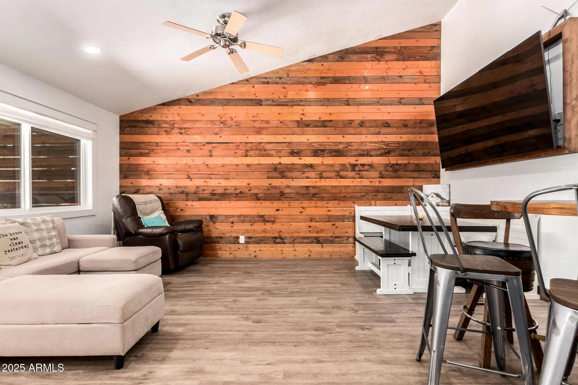 Stunning renovated home with modern upgrades, a resort-style yard, and no HOA! Inside, enjoy a bright open layout with raised soffits, upgraded flooring, vinyl dual-pane low E windows, custom trim, and a cozy wood burning fireplace. The kitchen was fully remodeled in 2019 with granite countertops, upgraded cabinetry, stainless steel appliances, and a farmhouse sink. The primary suite features a spa style walk-in shower, and the guest bath was updated in 2022. Outside, the backyard is designed for Arizona living with a 2020 pool, extended travertine deck, turf, wood privacy fencing, and a large covered patio. A detached flex space with a mini split offers the perfect home office, gym, or studio. Recent major improvements include a brand new HVAC and water heater (2025), updated windows and doors (2020), new flooring (2018), updated ducts (2017), remodeled bathrooms (2021 and 2022), along with a Tuff shed and water softener (2022). Additional highlights include an RV gate, two car garage, indoor laundry, and a spacious backyard. Perfectly situated near parks, schools, dining, and freeway access, this beautifully cared for home is an incredible find and a must see.