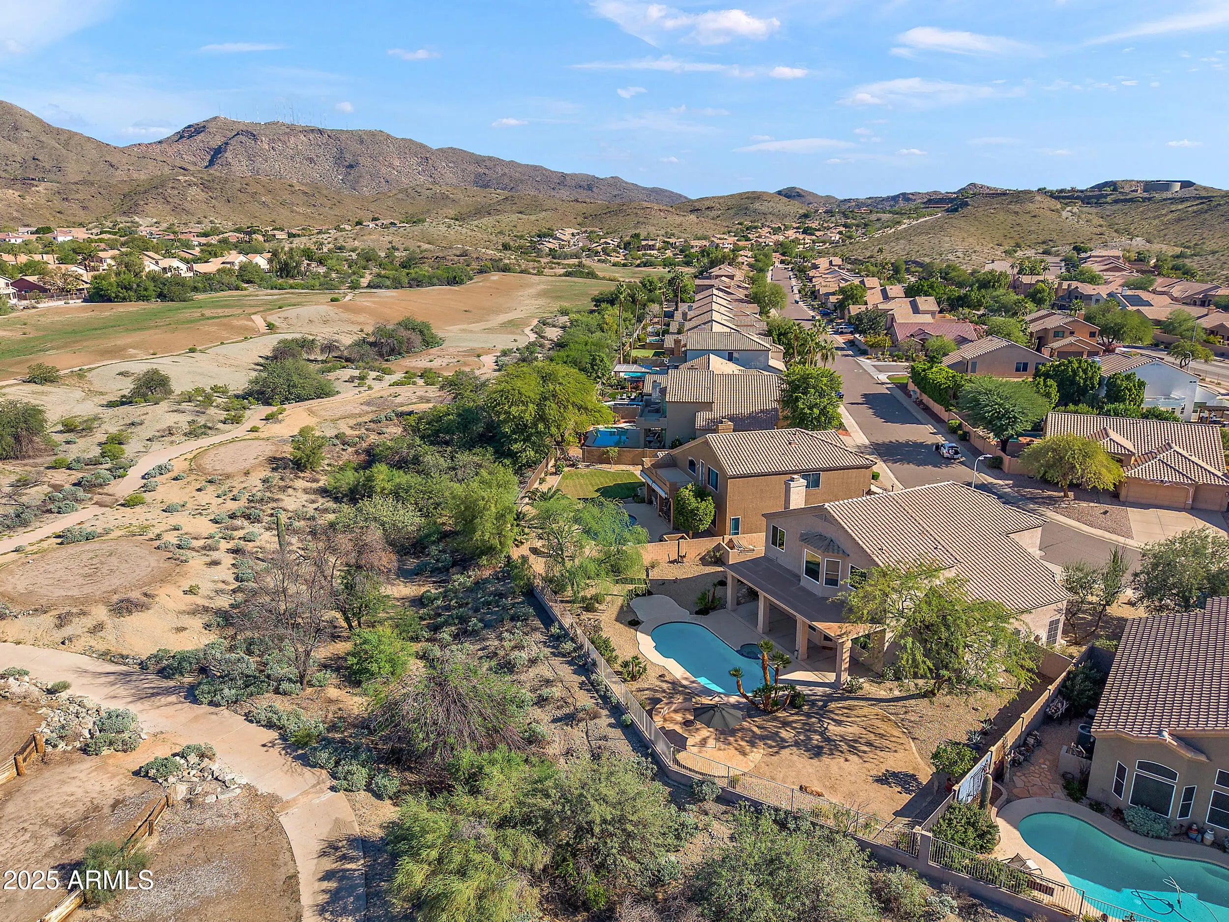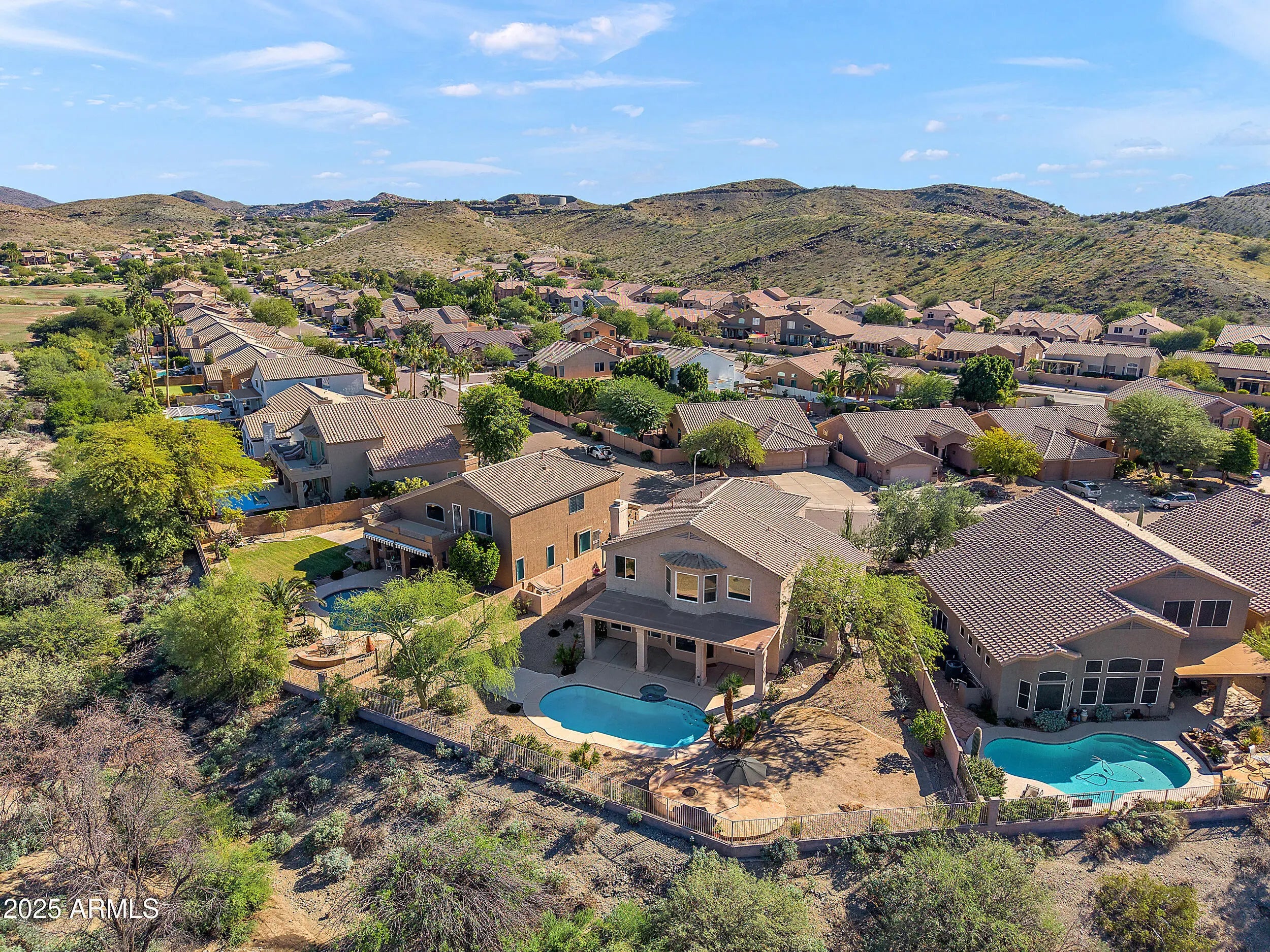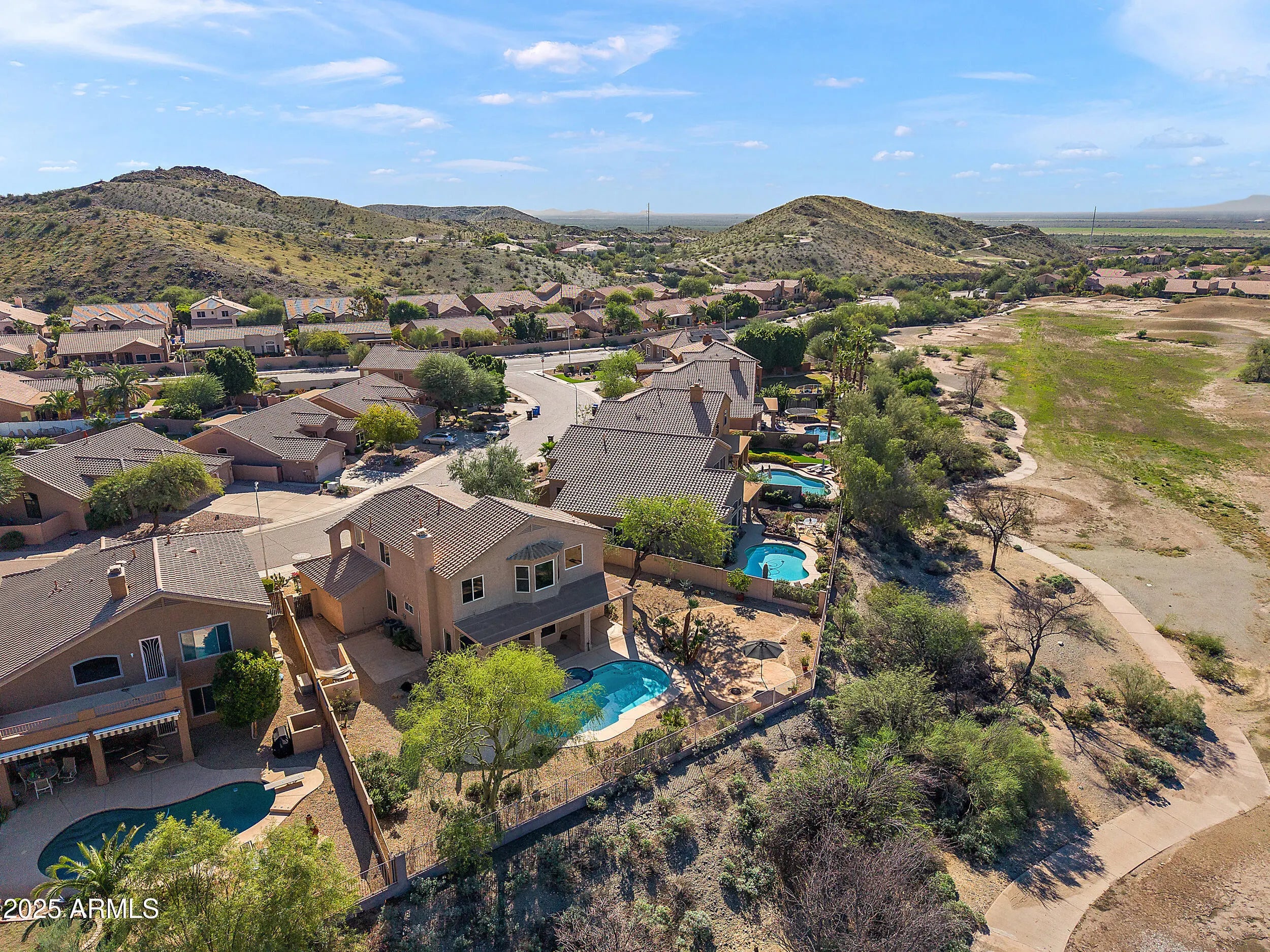 Welcome home to this beautifully maintained 5-bedroom, 3-bath residence, perfectly positioned on a premium 10,420 sq. ft. 180° view lot -one of the most breathtaking in the community! Enjoy a rare blend of privacy and serenity with unobstructed panoramic vistas of the majestic South Mountain and Estrella Mountain ranges from nearly every room. Golden sunrises, fiery sunsets, and dazzling star-lit evenings await! Step inside to a bright, turnkey floor plan featuring a desirable main-level bedroom and full bath, ideal for guests, multigenerational living, or a quiet home office retreat. The main level guest bedroom is currently setup as an office & can easily be relocated to the upstairs bedroom w/the wood flooring. The heart of the home is the beautifully open kitchen featuring a gas range for the cooking enthusiast and a large walk-in pantry. Notice the expansive kitchen window that perfectly frames the extraordinary mountain backdrop. Another added kitchen and dining room benefit is the bay window at the dining nook. Gather in the adjoining family room for everyday living or effortless entertaining that flows seamlessly outdoors through the French door. Upstairs the luxurious primary suite captivates with its double-door entry, elevated ceiling, and sweeping 180° South mountain Preserve views-a peaceful space designed to recharge and inspire. Three additional generously sized bedrooms complete the upper level, including a jack-and-jill suite perfect for family and visitors. This home has been thoughtfully updated with new floor tile in both upstairs bathrooms & all new carpet throughout (Spring/2025). The home has new interior paint and new interior paint in the garage (Oct/2025). In 2010, 6 upgraded Milgard double-glazed low-E windows were installed upstairs for added energy efficiency, and a newer roof(June/2020). Enjoy the comfort of Trane HVAC systems for efficiency and peace of mind. Designed for true Arizona living, the expansive backyard invites you to unwind or host in style-enjoy the sparkling private pool, low maintenance landscaping, and endless skies. A 3 car-garage provides the space every homeowner craves for vehicles, gear, and hobbies. This is mountain-view living at its finest -space, privacy, fresh updates, and turn-key comfort in one of Ahwatukee's most sought-after locations. This home also has ready access to the new 202 biking trail system and extensive South Mountain Preserve hiking and mountain-biking trails. A rare opportunity not to be missed!