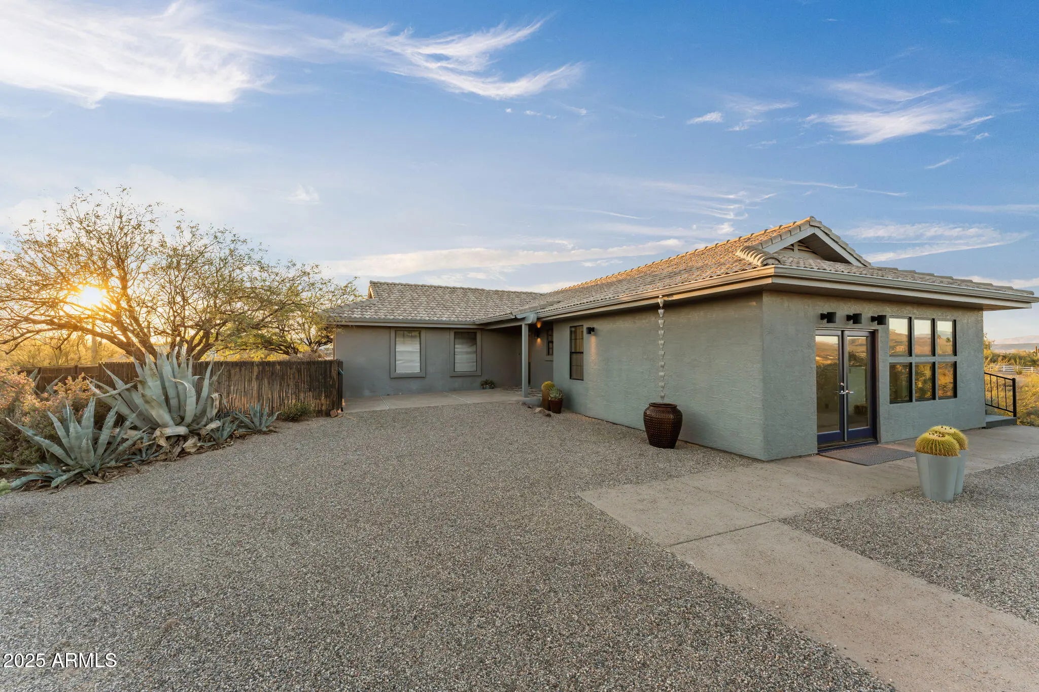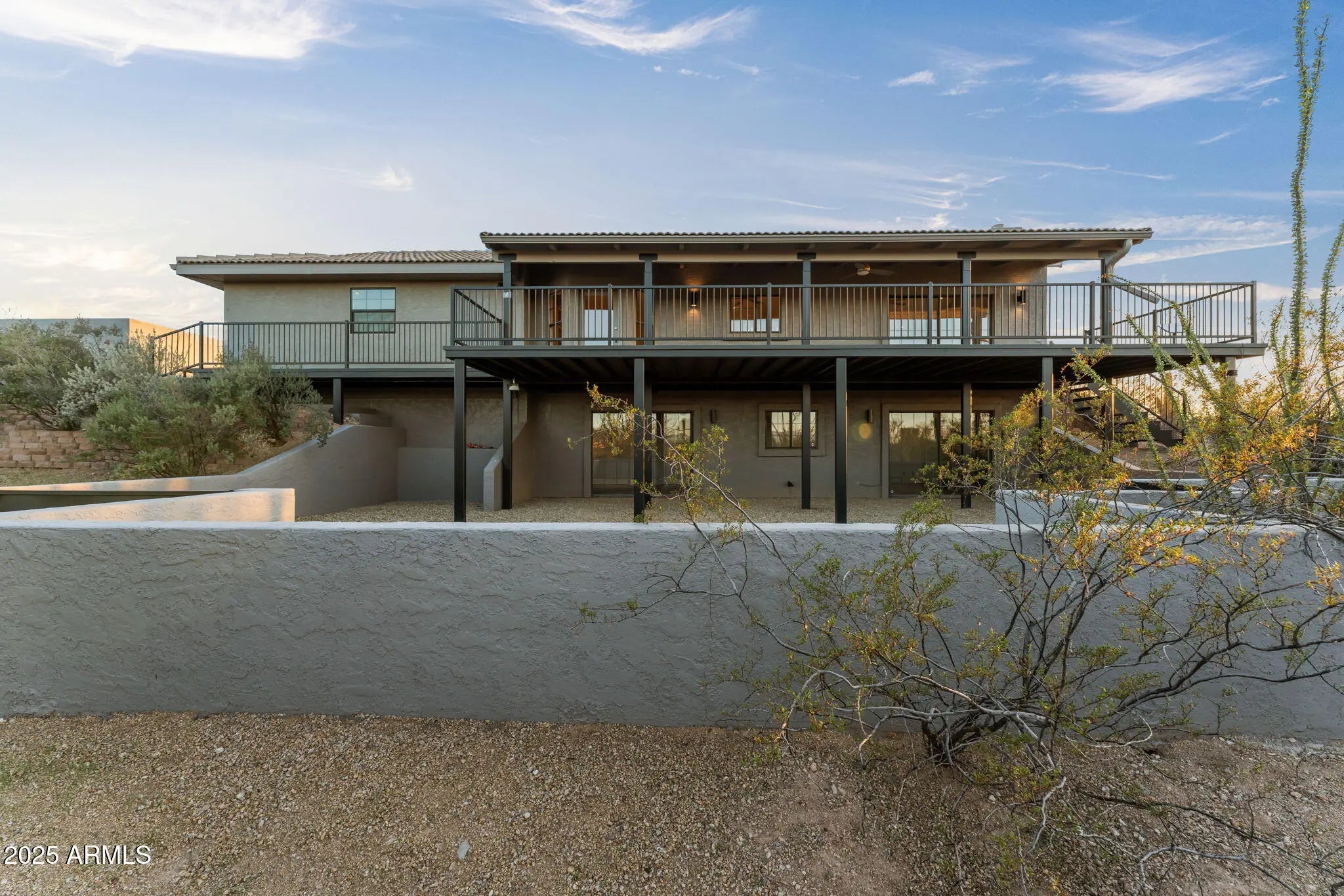 Experience the best of Arizona living in this gorgeous 3,284 sq ft home designed to take full advantage of its breathtaking surroundings. Boasting 5 spacious bedrooms, 3 bathrooms, and an over-height 2-car garage, this property combines style, functionality, and privacy on 4.5 pristine acres—with no HOA! Inside, you'll find two levels of flexible living space, perfect for multi-generational living or guest accommodations. The home features beautiful travertine tile flooring and plush new carpet, fresh interior paint, and modern fixtures that create a sleek, contemporary feel throughout. The kitchen is both elegant and functional, offering granite countertops, updated stainless steel appliances, a butler's pantry and ample cabinetry and storage. Bathrooms echo the same luxury finishes with granite surfaces and refined details. Step outside to your personal oasis - an inviting fenced, heated pool and spa complete with a variable-speed pump and free-standing cover roller. Multiple patios, a large balcony, and a covered seating area provide endless options for outdoor entertaining or simply relaxing while soaking in the unobstructed 360° desert and mountain views. The fenced backyard, carport, and low-maintenance desert landscaping make this property both beautiful and practical. With a private well and septic, utility costs stay low, leaving you more freedom to enjoy your surroundings. Whether you envision a workshop, guest casita, or horse facility, the possibilities are endless - the sky truly is the limit on this incredible, view-filled property! Come see why this desert gem is the perfect blend of luxury, comfort, and opportunity!