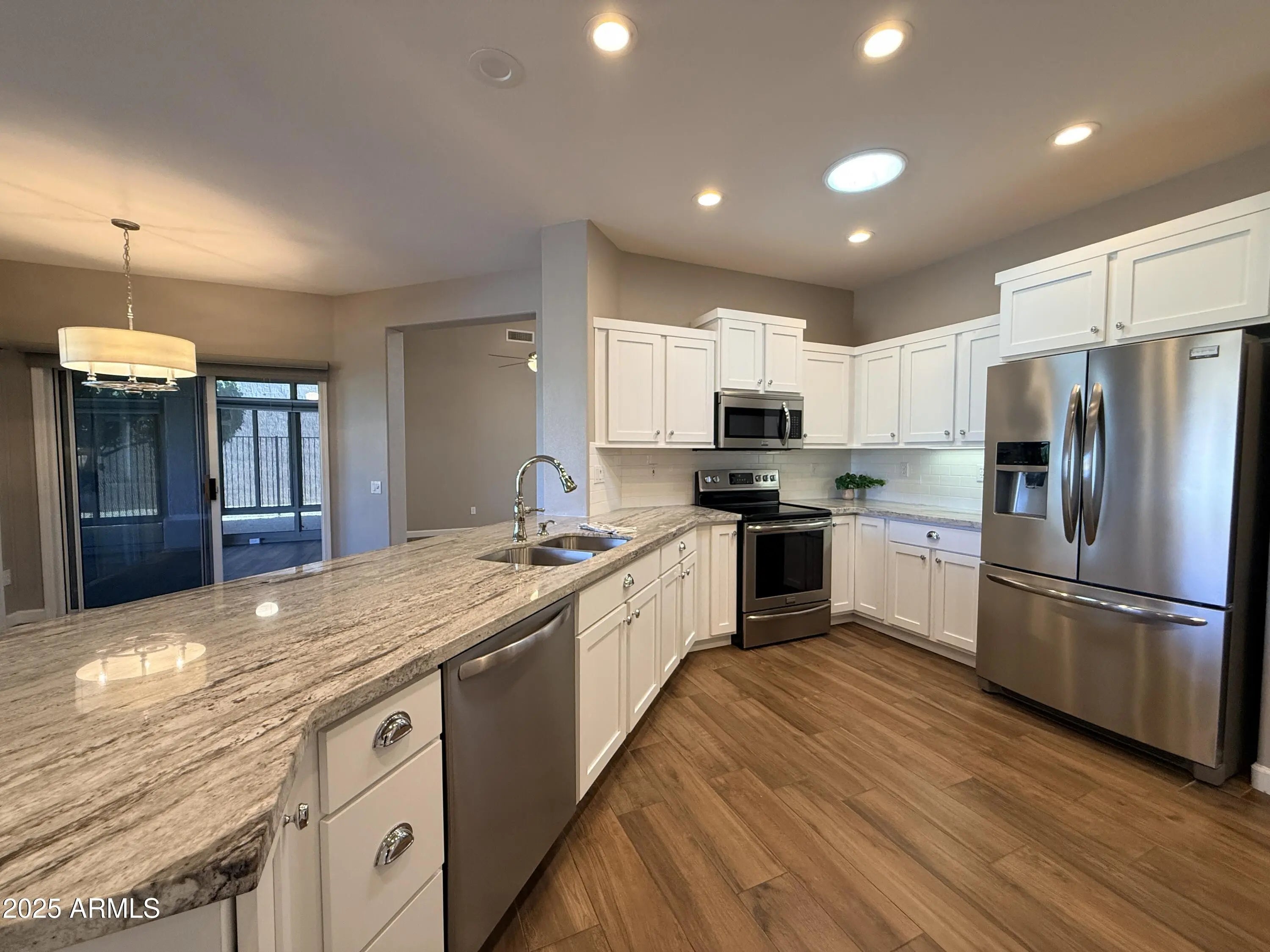 Experience refined desert living on the 13th fairway of Desert Trails Golf Course. This beautifully updated Lakeside plan features a split 3-bedroom, 2-bath layout designed for comfort and privacy. The updated kitchen boasts granite counters, stainless steel appliances, and elegant tile flooring throughout. Enjoy seamless indoor-outdoor living with a heated and cooled Arizona room perfect for entertaining overlooking the pristine fairway and sparkling heated cocktail pool. Energy-efficient owned solar and a 2.5-car garage complete this exceptional home—where sophistication meets resort-style serenity.