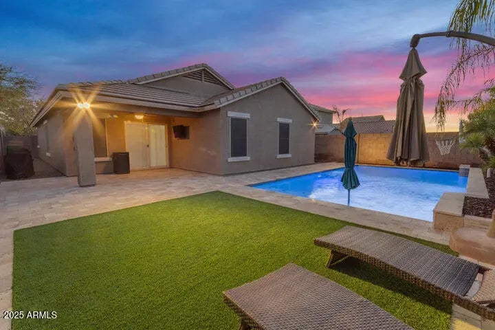 Welcome to your dream single story home in the sought-after Adora Trails community of Gilbert, AZ! This meticulously maintained single-level pool home offers the perfect blend of comfort and style. Boasting 3 bedrooms, 2 baths, and a den/office for those that work remotely. Step into the heart of the home, where an open-concept floor plan seamlessly connects the living, dining, and kitchen areas. The kitchen is a chef's delight, featuring granite counters, stainless steel appliances, and ample cabinet space. Entertain guests effortlessly or enjoy meals in this inviting space. The primary suite is a sanctuary of relaxation, complete with a well-appointed ensuite bath and generous closet space. Two additional bedrooms and a versatile den provide flexibility for your lifestyle needs, whether it's a home office, playroom, media room, etc...((Embrace the Arizona sunshine in your private backyard oasis. The sparkling pool is perfect for cooling off during warm summer days, and the outdoor space is ideal for entertaining and synthetic turf makes it low maintenance. ((Beyond the home, Adora Trails offers a host of amenities for residents. Join the vibrant community at the pool, stay active in the gym, or explore the walking trails that wind through the neighborhood. Parks and green spaces provide opportunities for outdoor activities, creating a welcoming environment for all.(