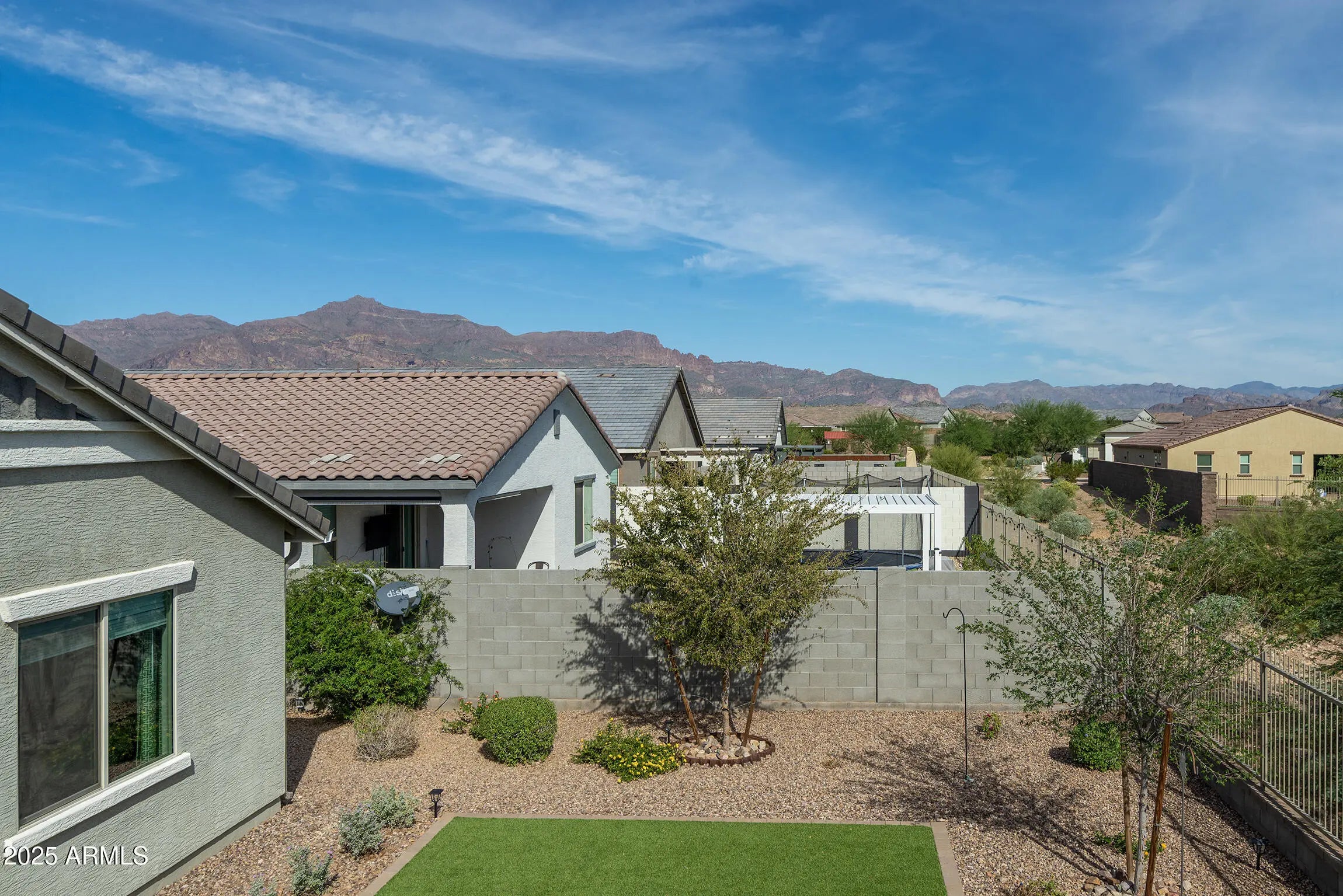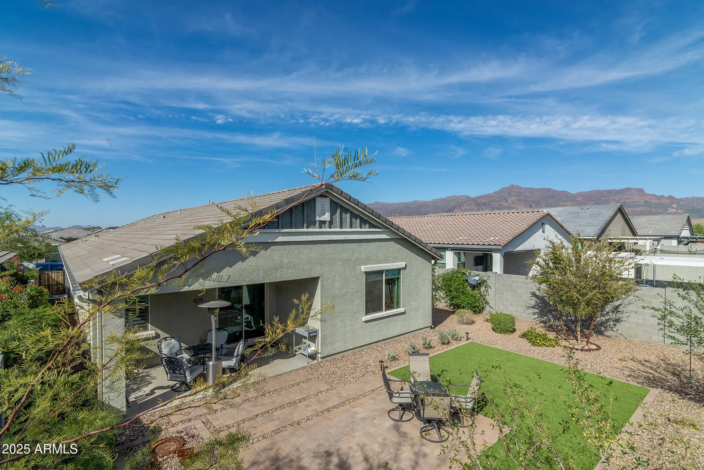 As a former MODEL HOME, it has all the upgraded touches. Custom Wall coverings, ceilings, Gourmet kitchen with huge island for all your entertaining needs, Staggered cabinetry, Granite counters, and the most incredible pantry set up. Stainless Steel Appliances, Built in wall oven and microwave. The 4 bedroom gives ample space for office, craft rooms, gym equipment. The driveway has custom pavers that wrap around to the back yard. There is a gate on both sides of the property for easy access. The stunning back yard features pavers, artificial grass, and a beautiful space to seclude you from any immediate neighbors. Rain gutters, push up window blinds, outside irrigation drip system, and water softener have been added as well. Nestled in the Superstition Mountains, you have views, and trails to explore. Close to Hwy 60, shopping, and golf in the beautiful community of Gold Canyon. This home is VA Assumable with qualification.