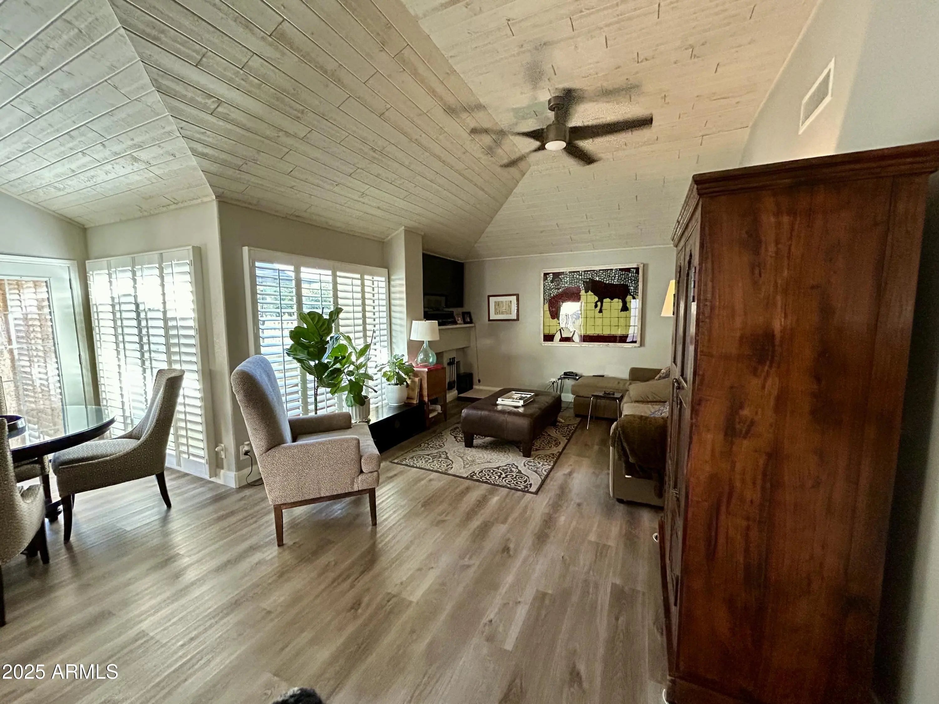 Gorgeous Furnished Home in Scottsdale Ranch. This updated, furnished home has it all! Great room floor plan with Shiplap vaulted ceilings throughout. The home features an updated kitchen with quartz countertops, white cabinetry, SS appliances & breakfast bar plus 2 wine fridges. Fireplace and wet bar including beautiful glassware and antique wine cabinet. Remodeled primary bath with large soaking tub, dual sinks w/ quartz counters, gorgeous spa shower & large walk-in closet. Updated hall bathroom also with quartz, white cabinets and gorgeous shower. LVP flooring throughout, no carpet. Third bedroom is set up for an office with optional double bed. Laundry with LG pedestal units. Lush backyard, upgraded with pavers grapefruit tree, 2 orange trees, covered patio and built-in BBQ. The heated community pool and spa are just steps away from the home and private. Located in a wonderful, safe community with many friendly neighbors. Home is very close to shopping, dinning, trails and parks. Tenant pays all utilities. Note that NOT everything seen in pictures will convey, personal items will be removed. TV's stay as well as kitchen essentials and most artwork. Garage has built in cabinets for plenty of storage.