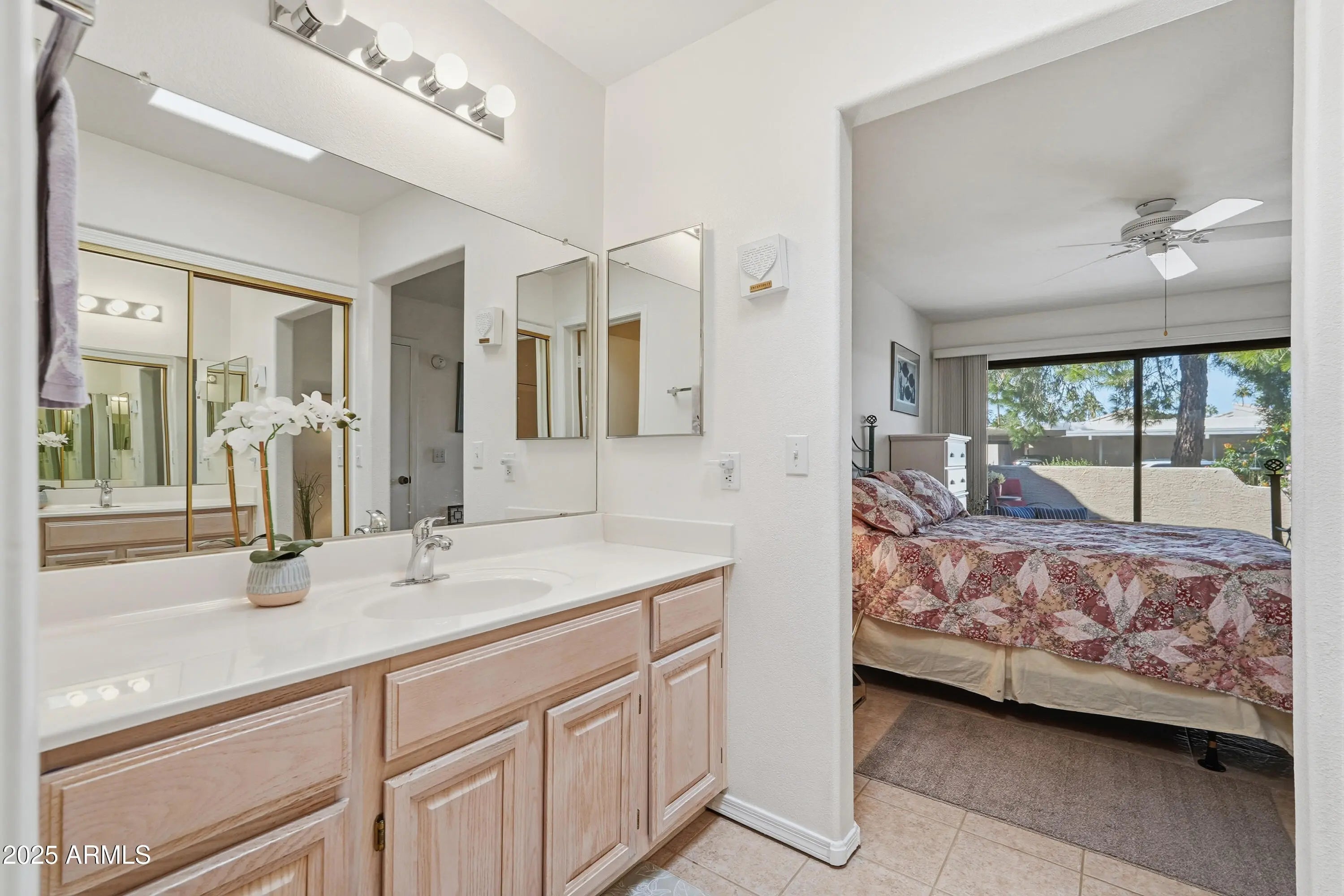 This condominium/4-plex features approximately 938 square feet of living space with two primary bedrooms each with their own private bathroom. Each room also has a sliding glass door out to a private patio offering an outdoor space for relaxation or entertaining. The arched entry and vaulted ceilings add an elegant touch allowing ample natural light to fill the interior. An extra storage unit and the mature landscaping with beautiful shade trees creates a serene atmosphere. The homeowner's association maintains the common areas, ensuring a well-kept community. This home would be ideal for those seeking a low-maintenance lifestyle with desirable features in a pleasant setting. Sun Village is an active adult, Gated/24 hour guarded, Resort Style Community. Enjoy the par 3 golf course, gigantic heated pool & spa, pickleball, tennis, fitness gym, woodshop, billiards, onsite entertainment in our ball room and onsite restaurant! Not to mention the numerous on-site clubs and activities. Close by you will find the spring training home of the Texas Rangers and the Kansas City Royals. Welcome Home!