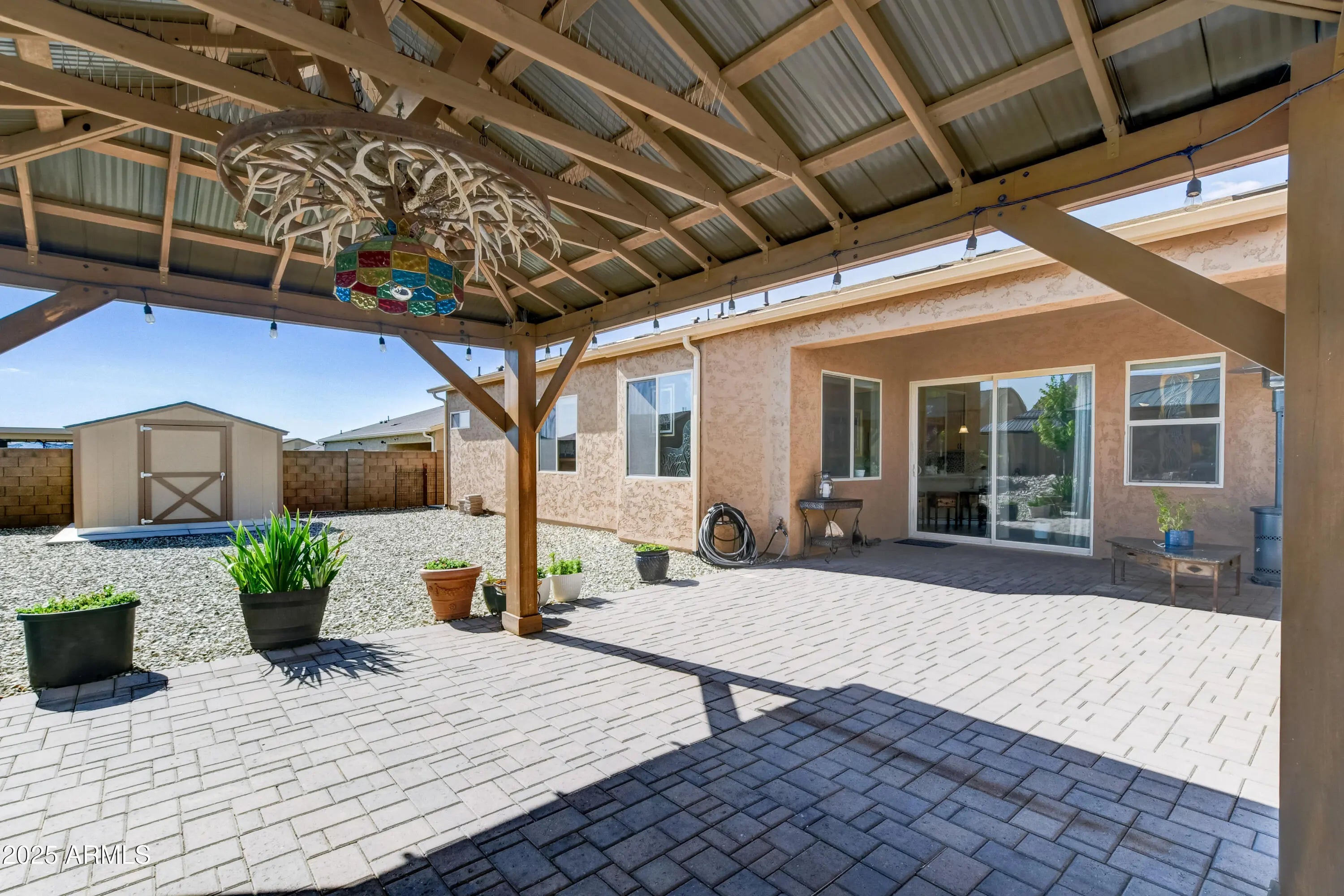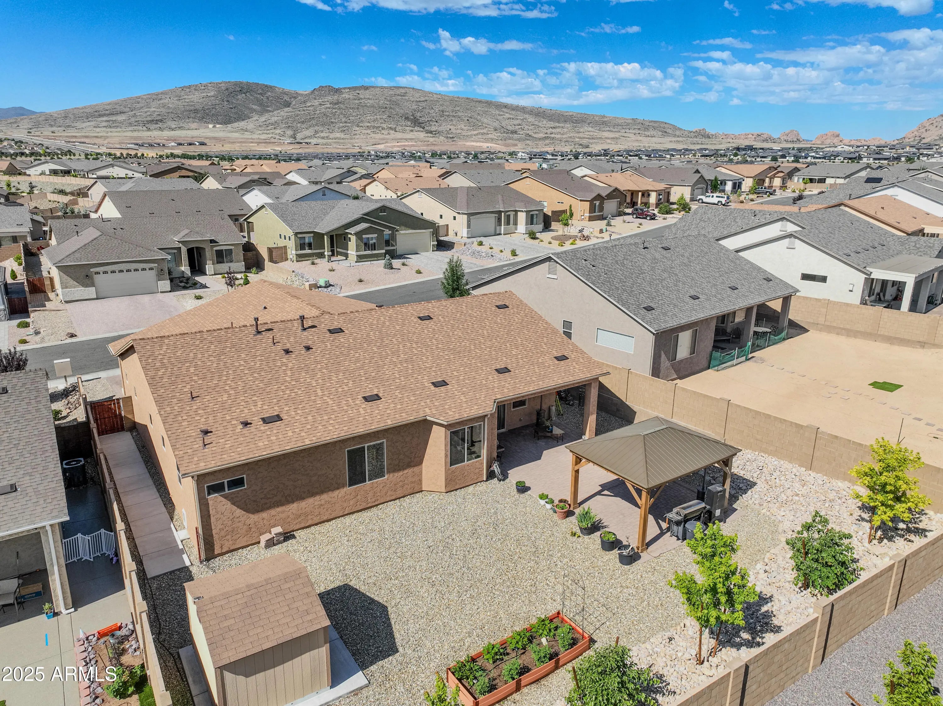 Discover the perfect blend of comfort and convenience. Built in 2022, this 3-bedroom plus den/office, 2-bathroom home is ideal for retirees seeking low-maintenance living or professionals needing a dedicated space to work from home. Inside, the open floor plan flows effortlessly, with a versatile den/office that's perfect for remote work, hobbies, or guest space. The home also features a 3 car garage with overhead storage, offering plenty of room for vehicles, tools, and recreational gear. Step outside to a beautifully designed, low-maintenance xeriscape backyard complete with an extended covered patio, gazebo with electricity and gas, raised garden bed, storage shed, and dog run—tailored for year-round outdoor living.