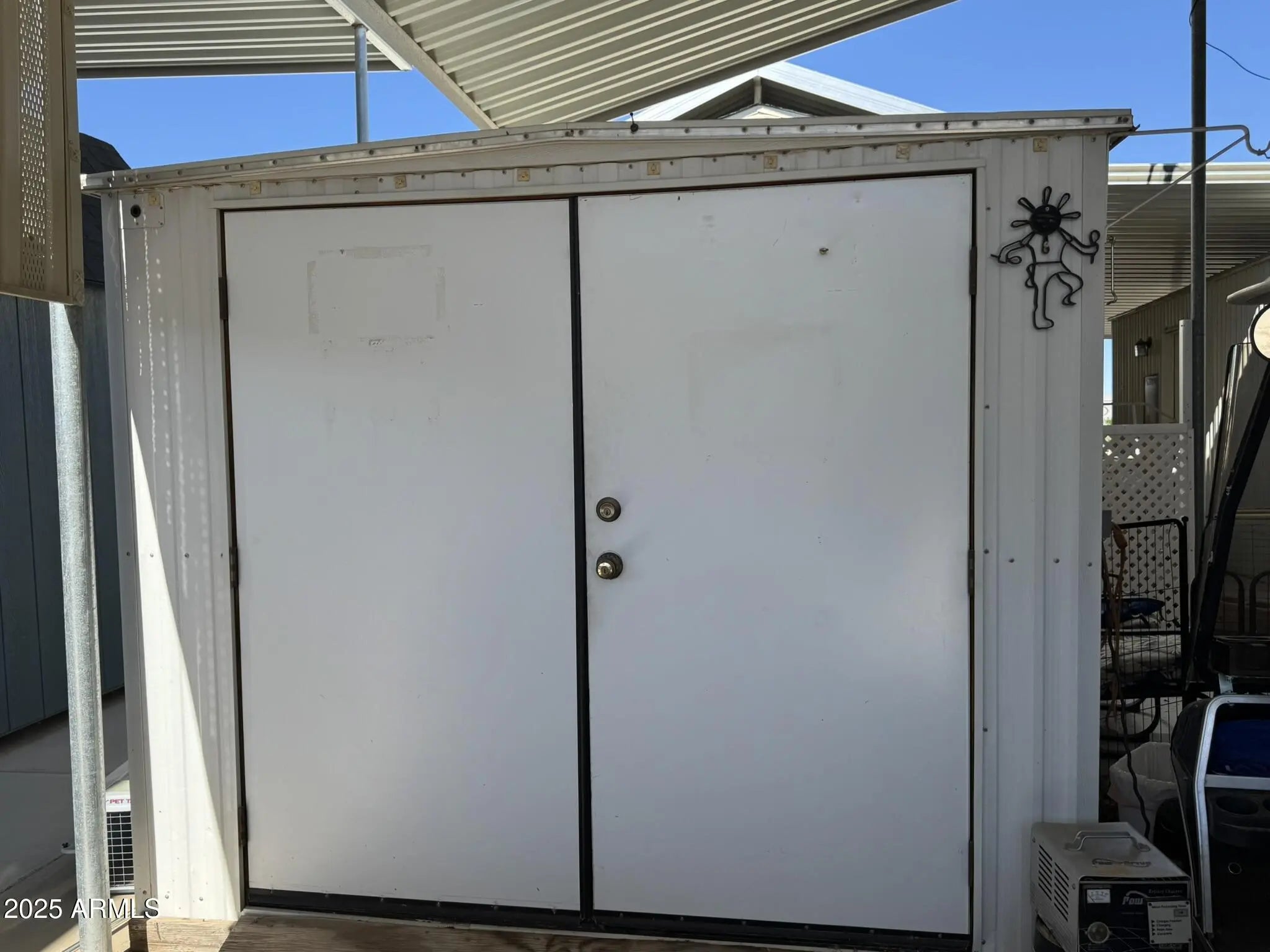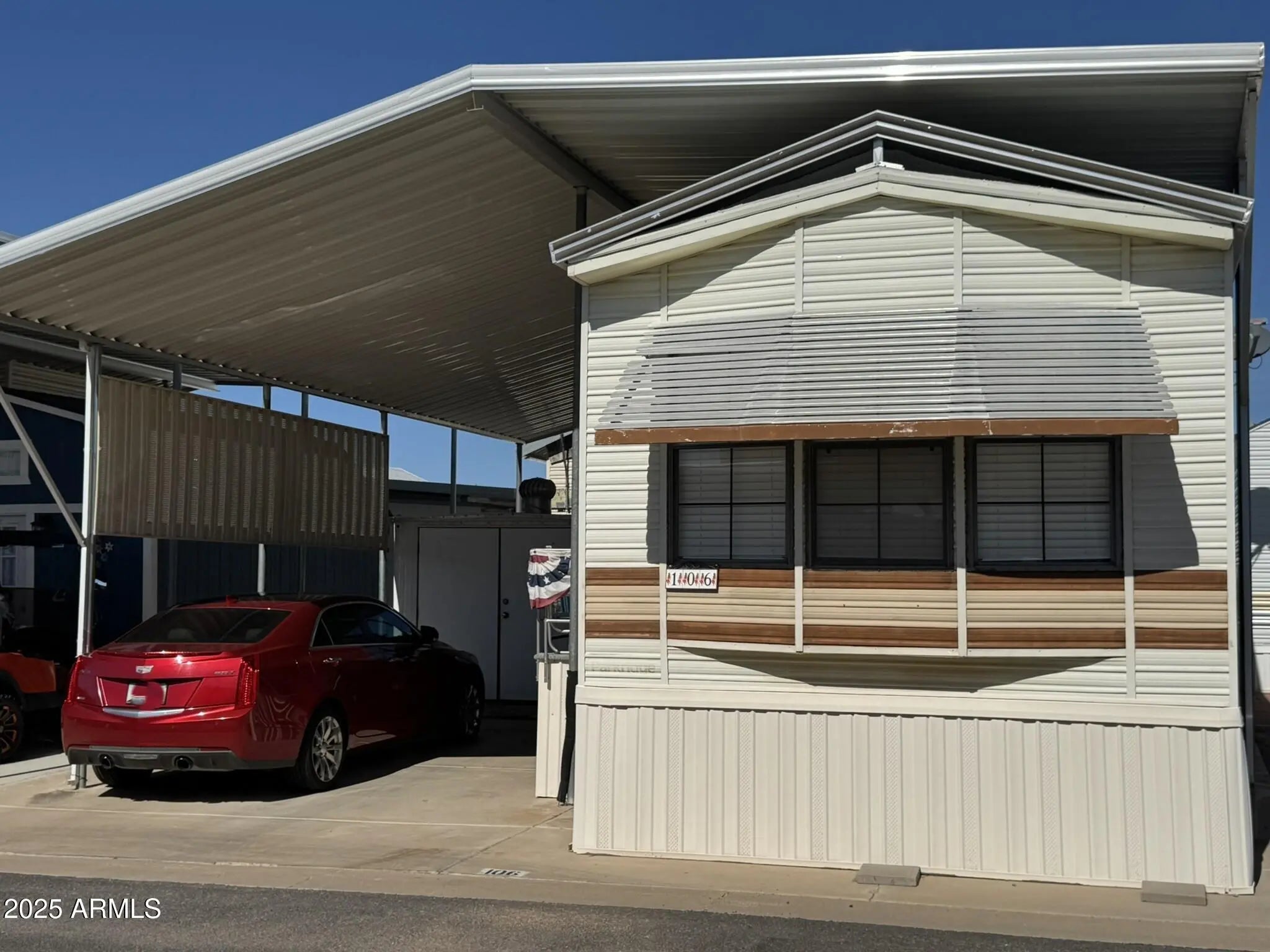 OWN YOUR LAND! 1987 Champion Park Model sits on the sunny side of the street in Florence's sought-after 55+ community and comes furnished, AND ready for winter visitors, downsizers, or local workers seeking comfort and convenience. 1-bedroom, 1-bathroom home offers 444 sqft of easy living on a 30x42 lot with a covered carport. The interior features a newer walk-in shower, serviced hot water heater, and most furniture is included. A large double awning creates a shaded outdoor living area, and a private storage shed adds practical space. Caliente Casa de Sol offers unbeatable 55+ amenities, 4-pools, 4-spas, Pickleball courts, woodworking shop, Active clubhouse and social events.