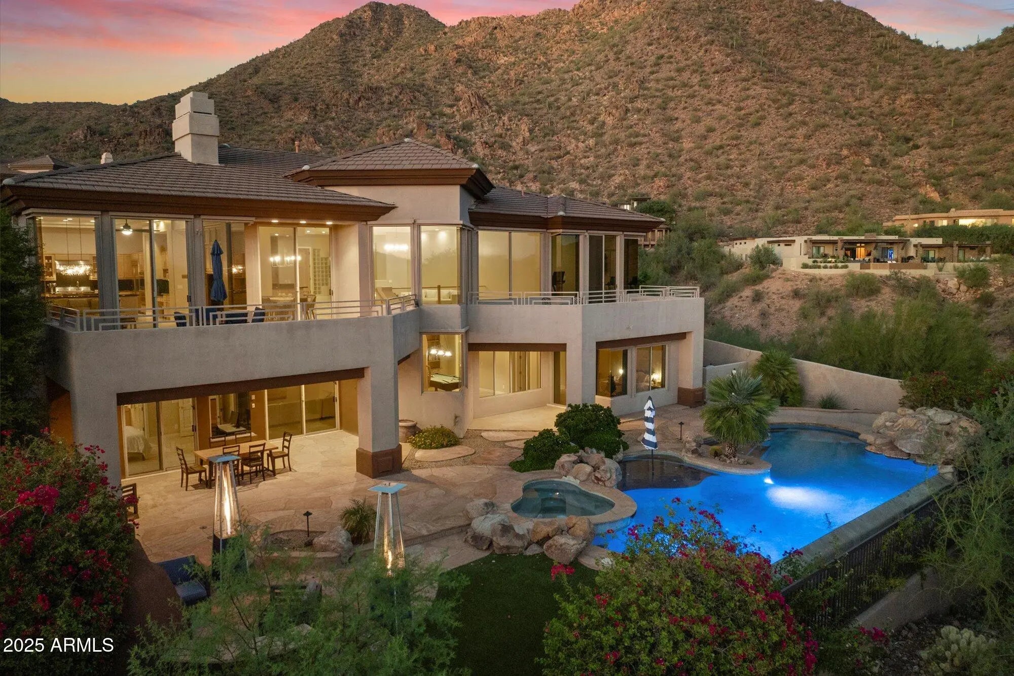 Panoramic city light and mountain views on incredibly private mountainside lot with neighbor only on one side, huge canyon/NAOS on other side. As you enter, there are expansive walls of tinted glass with automated sunscreens that open to decks. Lives like a single level home with kitchen, family room, living and dining room, powder room, bar, office, tinted windows master suite and laundry on entry level. Lower walk out level has 2 bedrooms with ensuite baths, another powder room, game room, media area and second wet bar! Gourmet kitchen with updated range, double ovens and wine cooler. Master suite has its own deck! Entertaining backyard with negative edge pool and spa, swim up bar, BBQ, fireplace and flagstone patios.