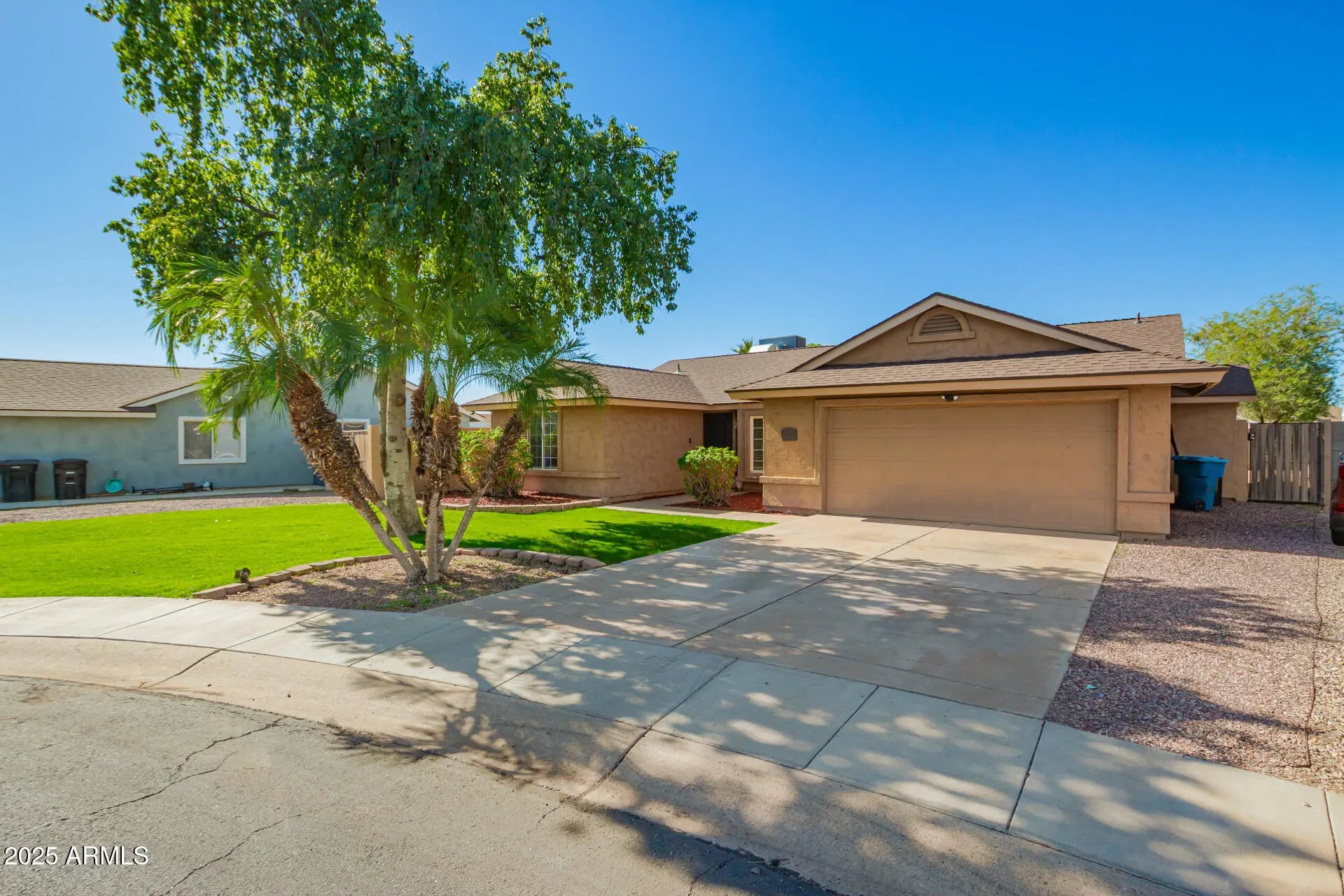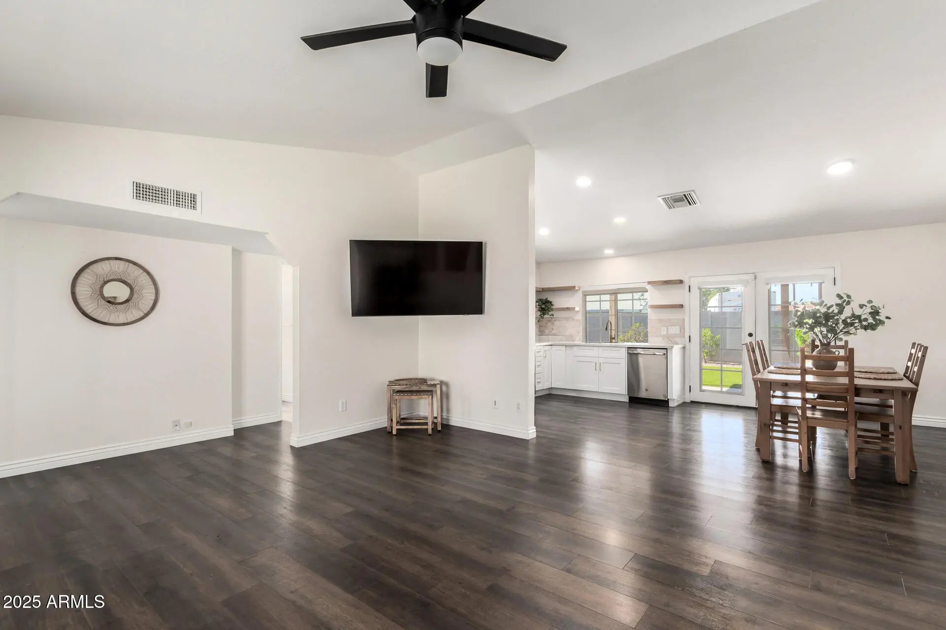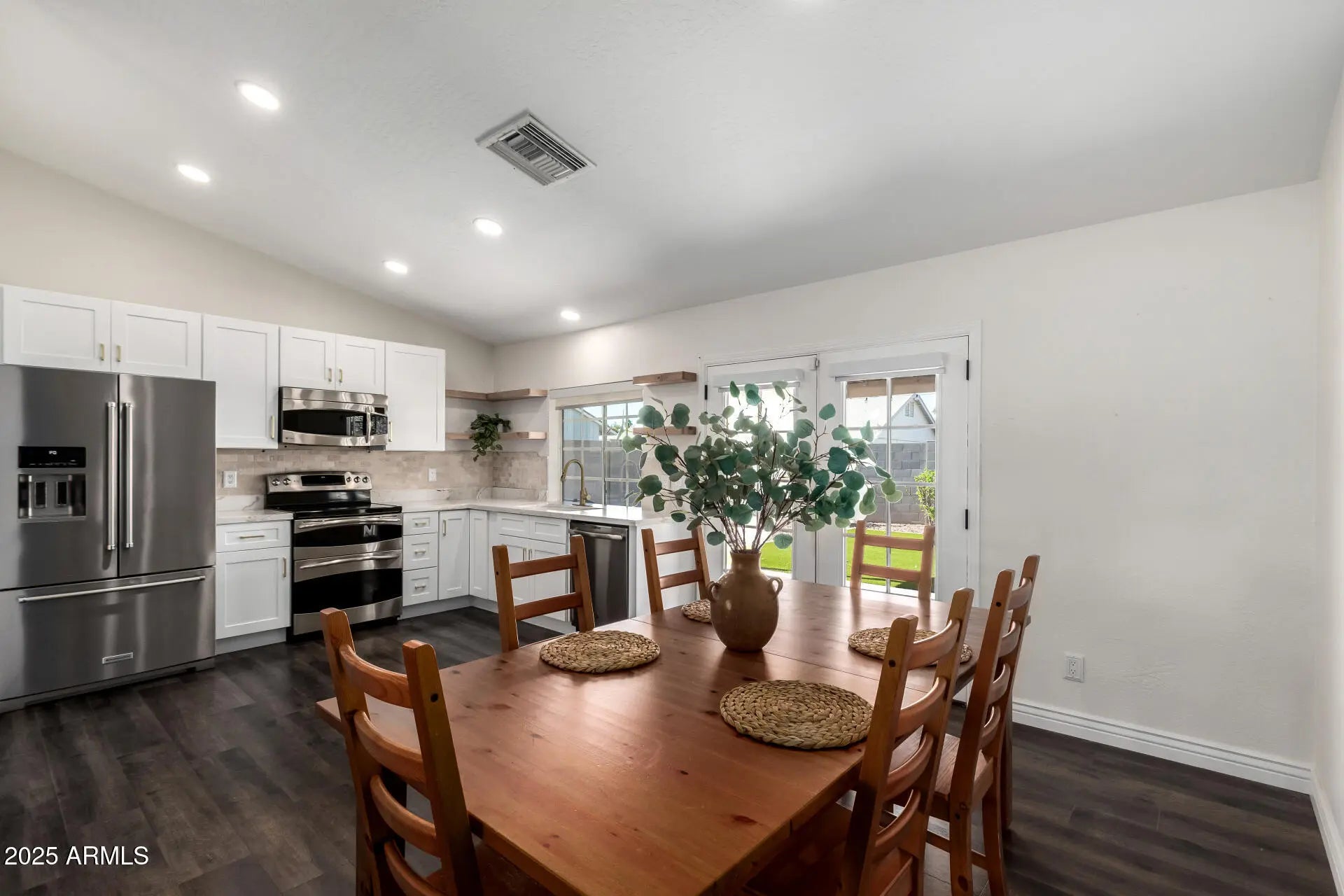 Tucked away at the end of a quiet cul-de-sac, this single-level home checks all the boxes. It offers 4 bedrooms, 2 bathrooms, a 2-car garage, and great curb appeal with clean, simple landscaping. Inside, you'll find a bright and open layout with vaulted ceilings, plenty of natural light, and durable wood-look flooring throughout the main living areas. The kitchen features stainless steel appliances, quartz countertops, a travertine backsplash, recessed lighting, and crisp white shaker cabinets. French doors open to the backyard, making indoor/outdoor living easy. The primary bedroom has double-door entry, a walk-in closet, and a private bathroom. Out back, the yard is set up for relaxing and entertaining with an extended covered patio, artificial turf, and a built-in fire pit.