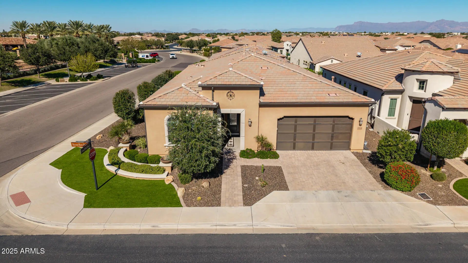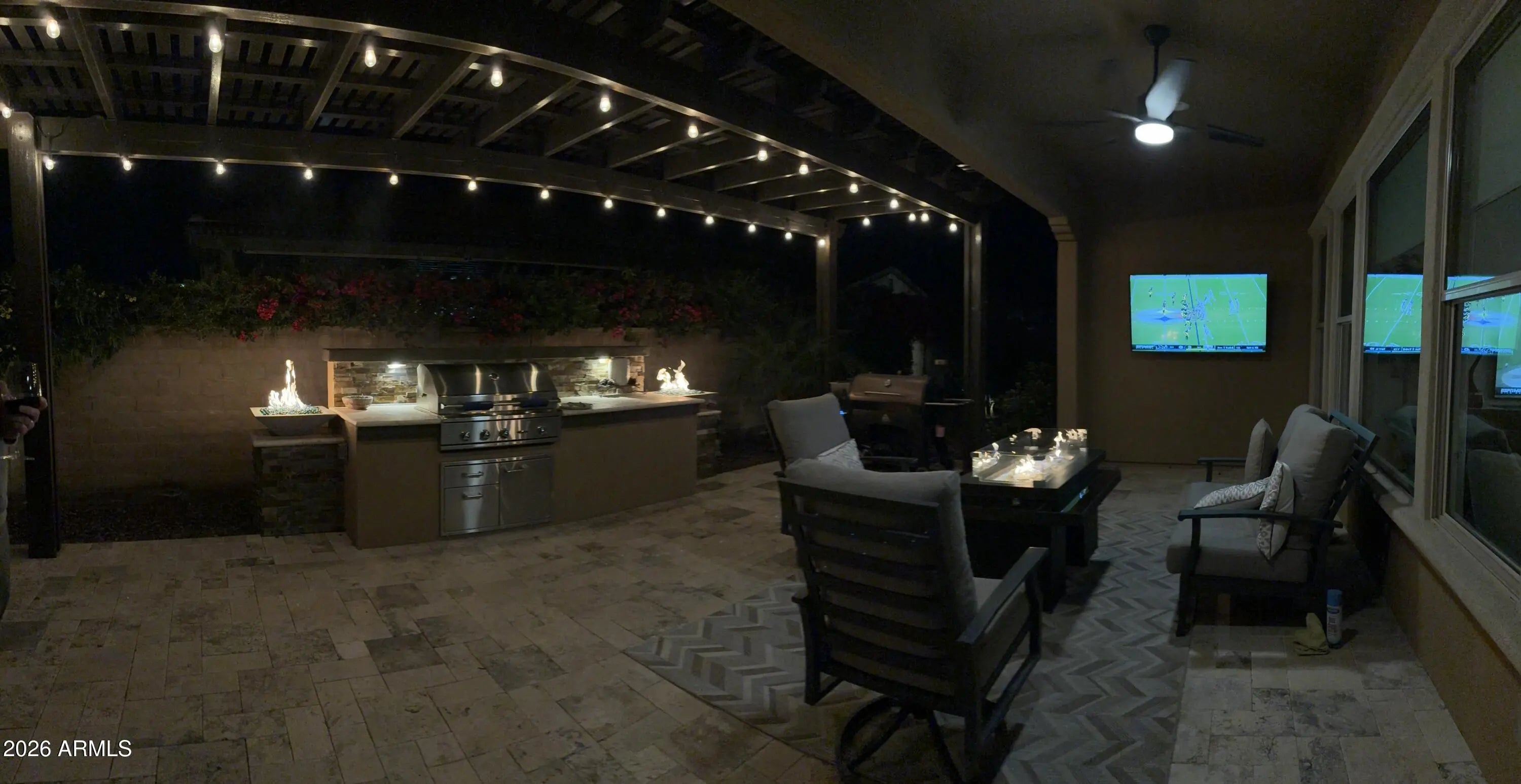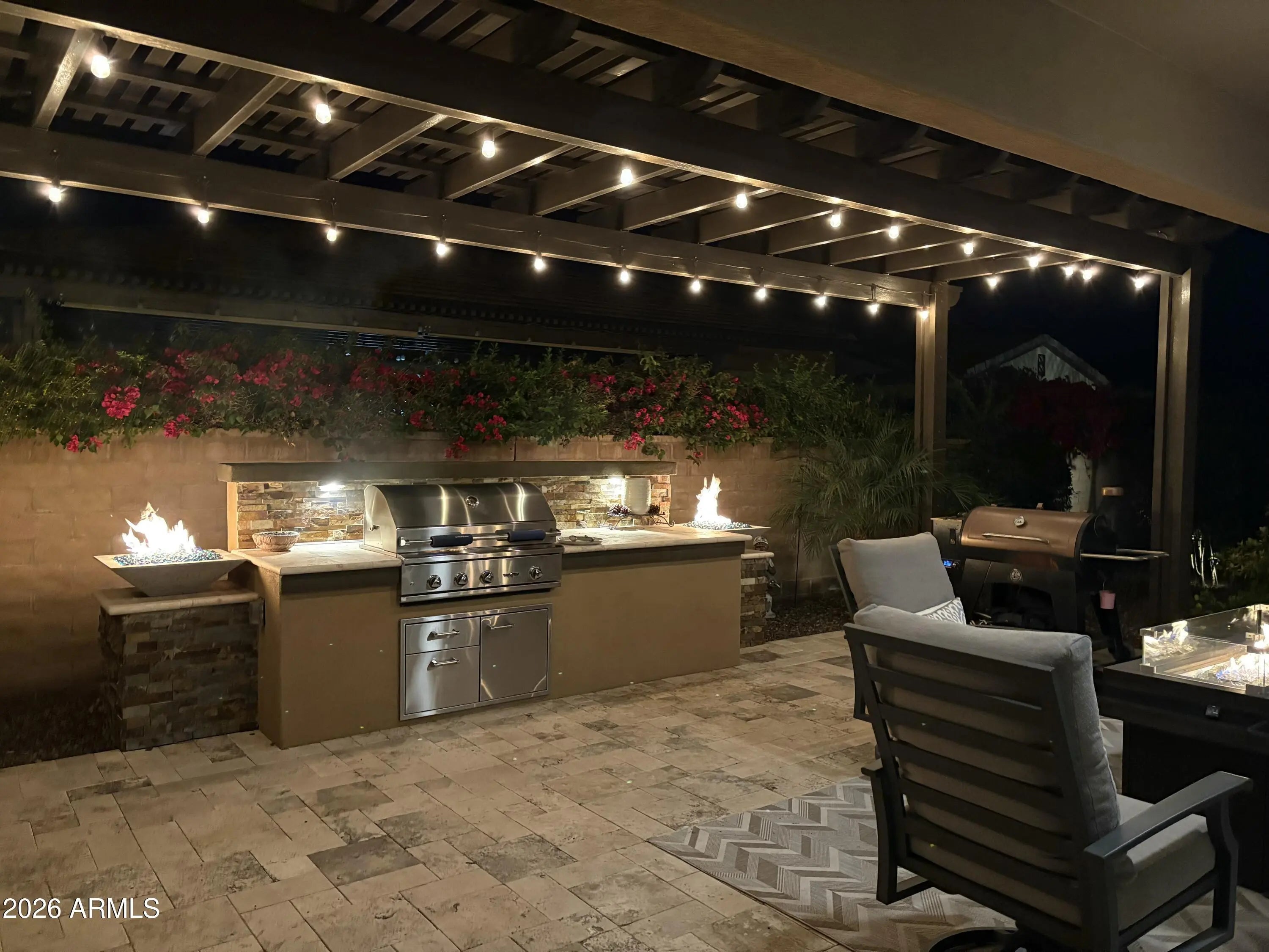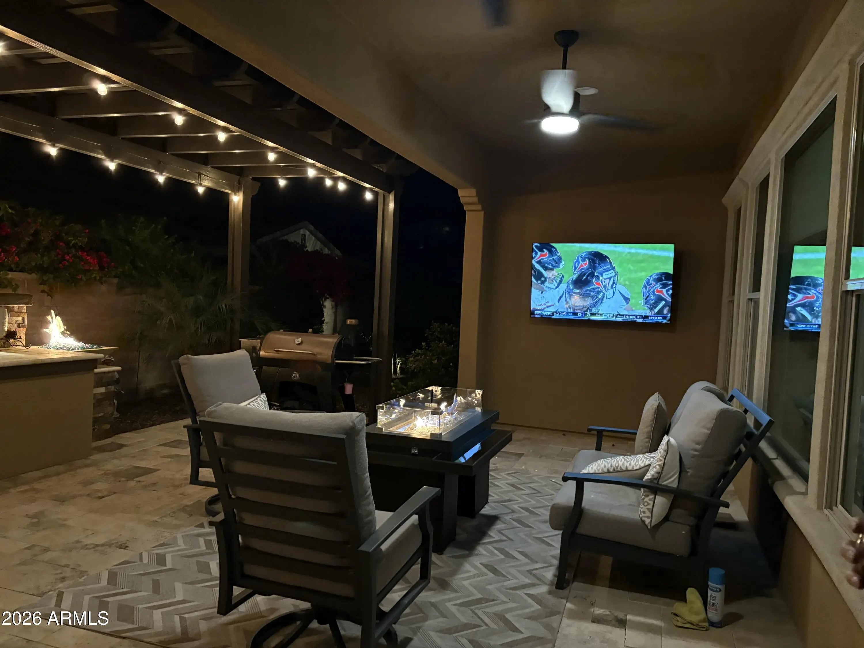 Best entertaining home!! Nestled in a prime corner lot, this beautiful single-story home in the sought-after Encanterra is the one for you! Fall in love with the bright interior, showcasing generous living spaces with wood-look flooring, recessed lighting, high ceilings, and neutral colors throughout. Whip up your favorite dishes in the pristine kitchen, complete with staggered cabinets with crown molding, tile backsplash, sleek granite countertops, stainless steel appliances, and an island perfect for quick meals. The den is perfect for a game area or an office. And the bonus room works perfectly as a guest bedroom, craft room, movie room, you decide..The serene main bedroom promises a good night's sleep and hosts a bathroom with double sinks and a walk-in closet. The laundry area has a built-in desk and cabinets for convenience, while the 2-car garage boasts attached storage an epoxy flooring. Out back, you have a nice space for weekend grills w/ built in bbq and peaceful evenings, including a covered patio with well-laid travertine pavers, an attached pergola, and an amvient fire fire feature.. This home is a must-see! Most furniture is for sale on a separate bill of sale.