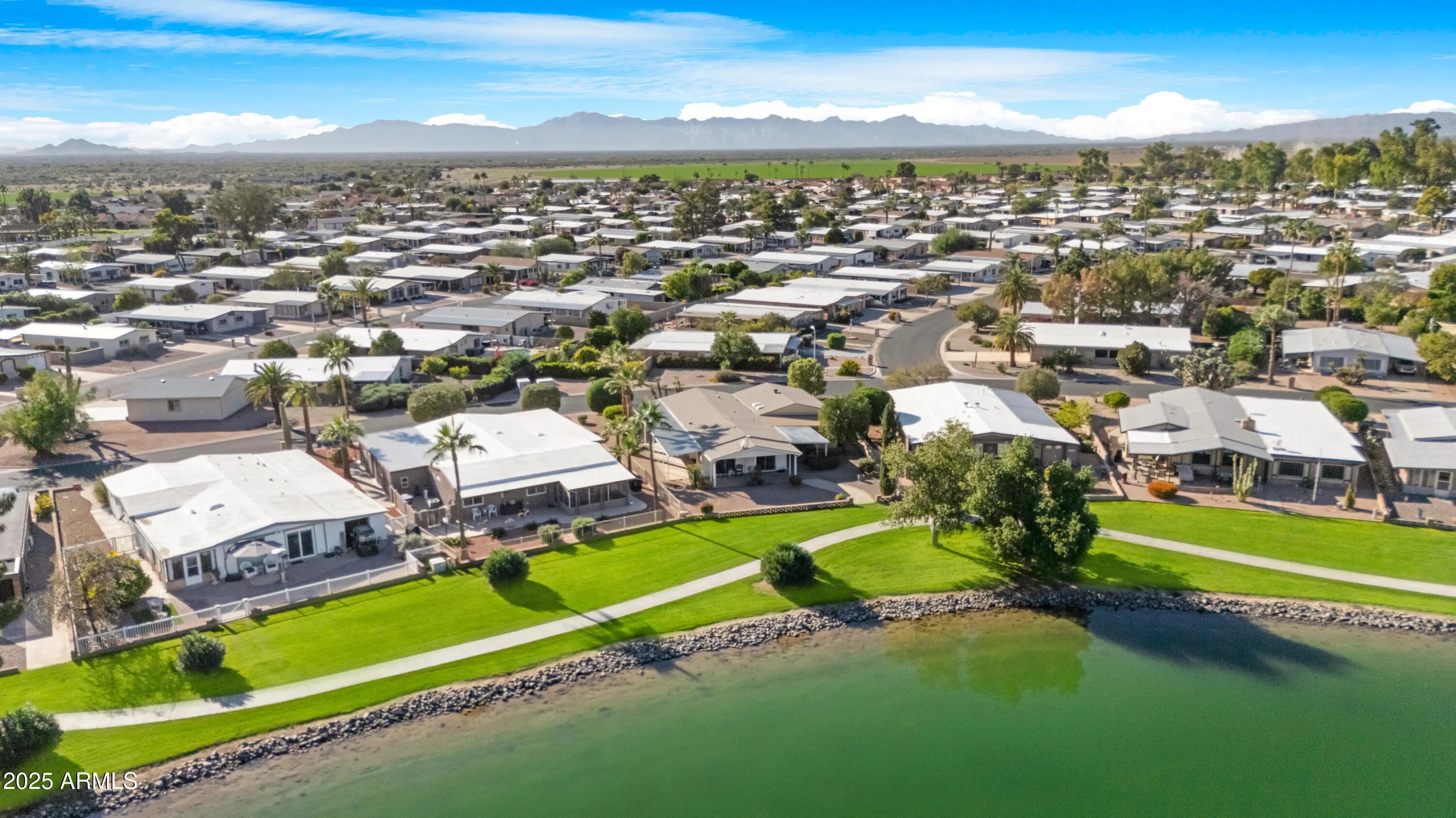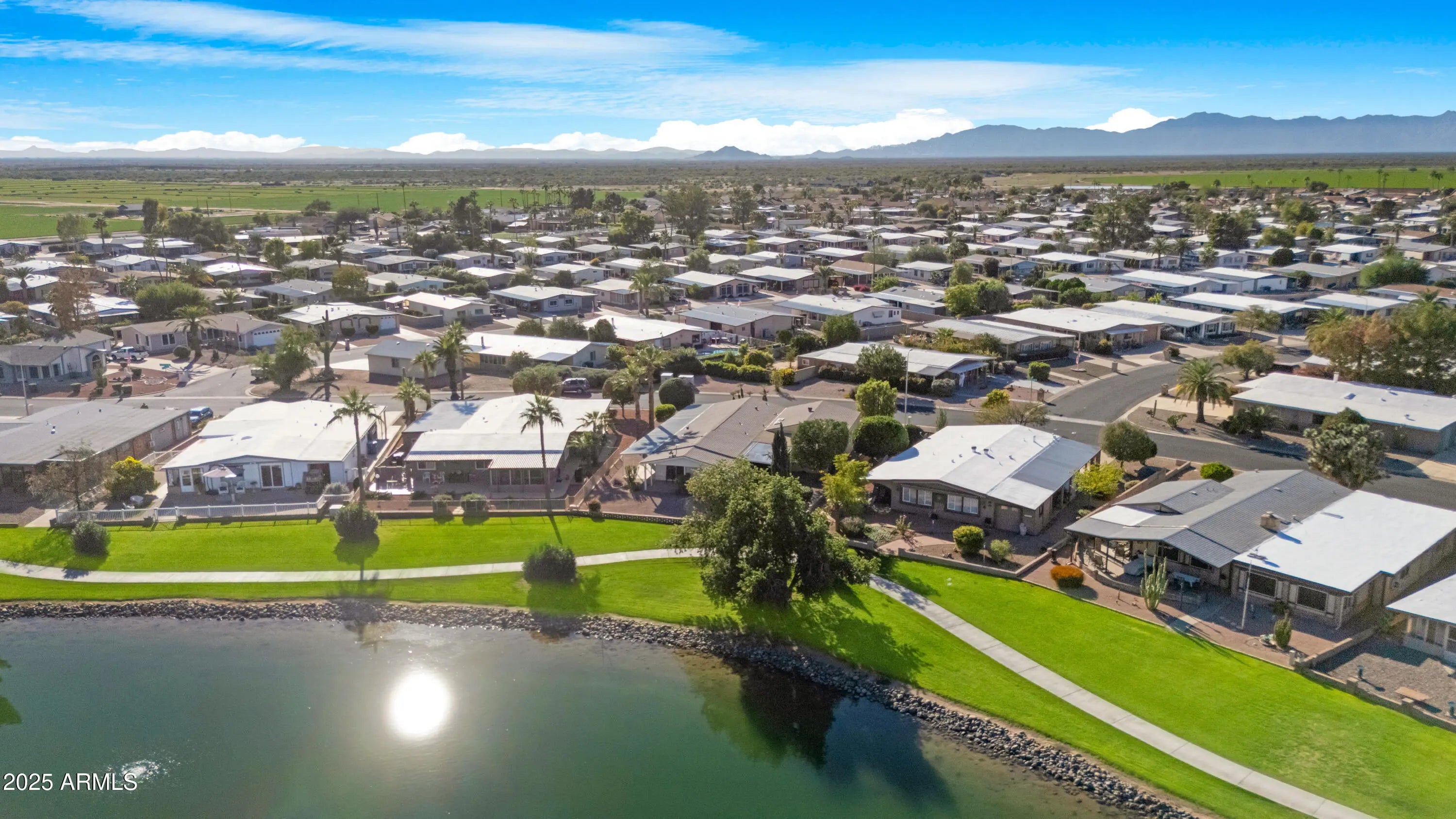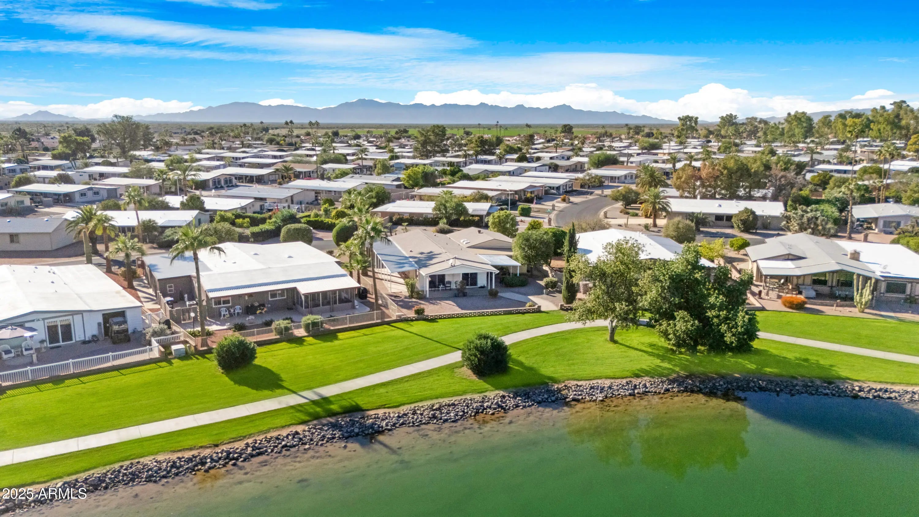 Lakefront living at its finest in the heart of Sun Lakes Country Club. This 2-bedroom, 2-bath manufactured home, built in 1980, sits perfectly centered on a sparkling lake with stunning water views from the living room windows and sliding glass door. Enjoy year-round comfort with a 2018 A/C unit and 2024 water heater. The spacious 2-car garage includes a workshop, plus there's a bonus room cooled by a swamp cooler—ideal for crafts, storage, or hobbies. Additional features include a water softener, RO system, and some furniture included at no value. Residents enjoy resort-style amenities such as golf, bocce ball, pickleball, tennis, and an endless list of clubs and activities. The community also offers five restaurants, three of which are private, along with classes and crafts. This is a rare opportunity for lakefront living in one of Arizona's premier active adult communities. Seeking a quick close **BRING ALL OFFERS**