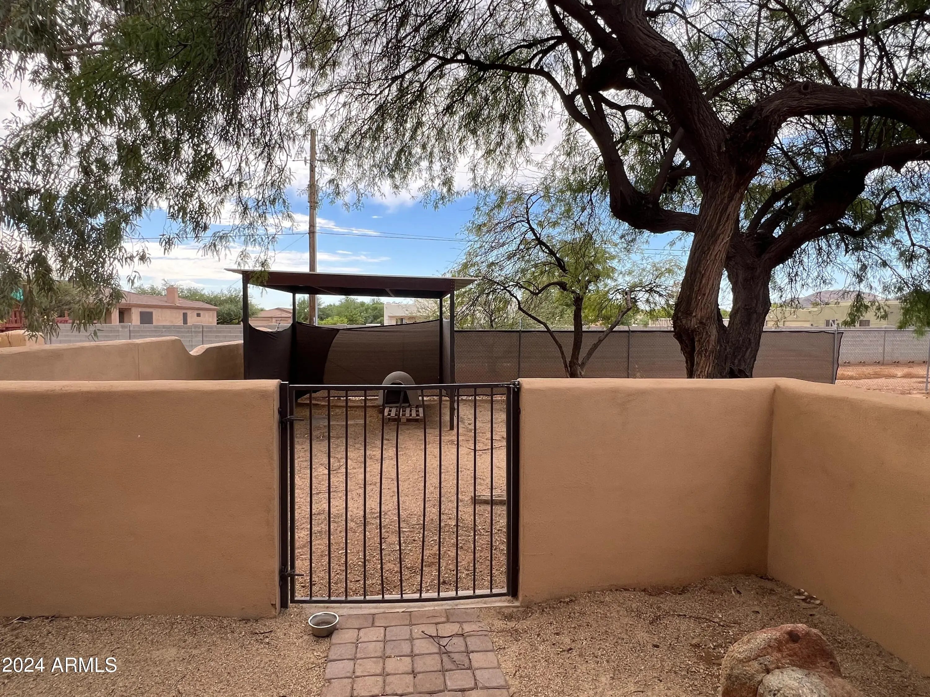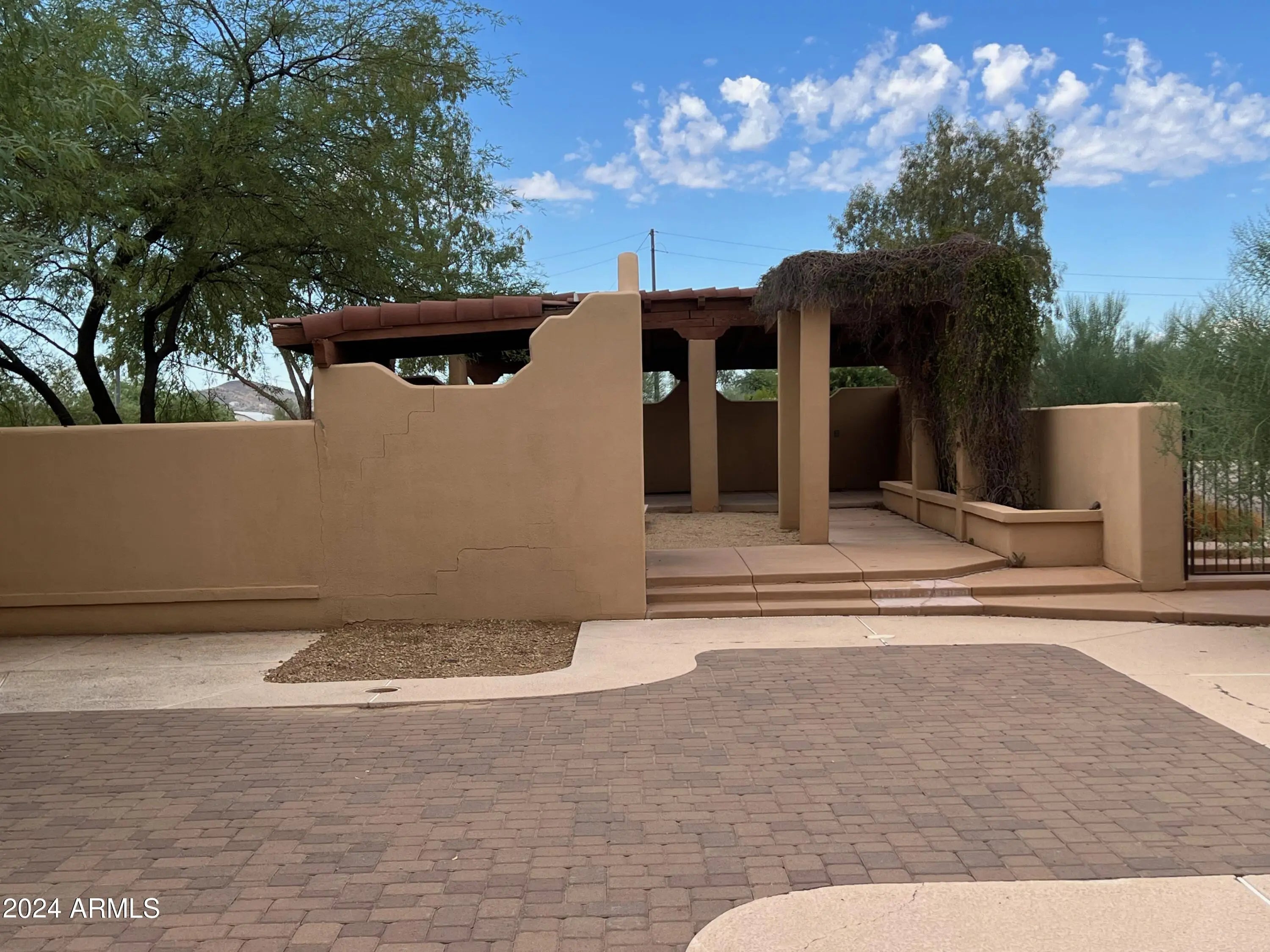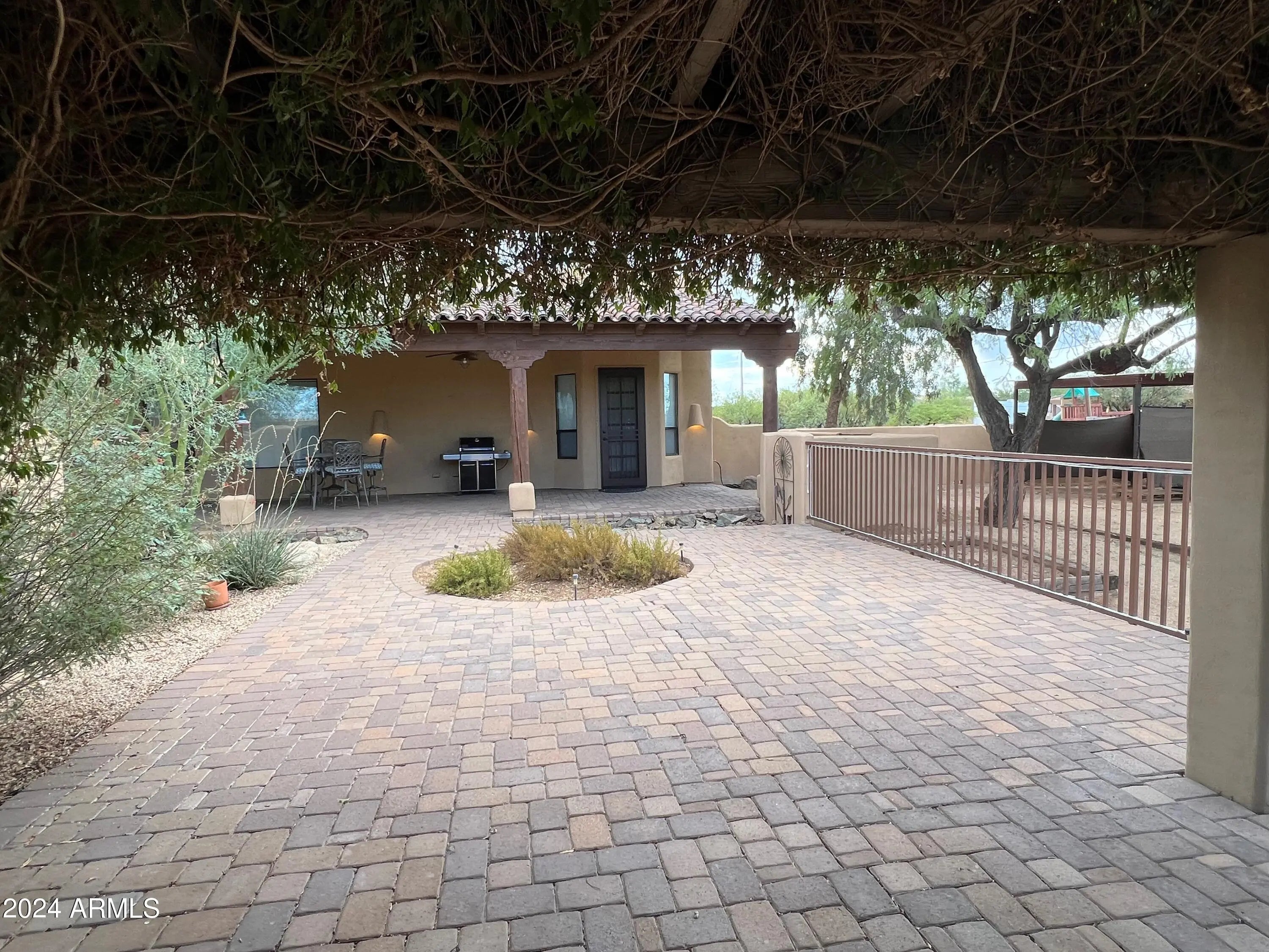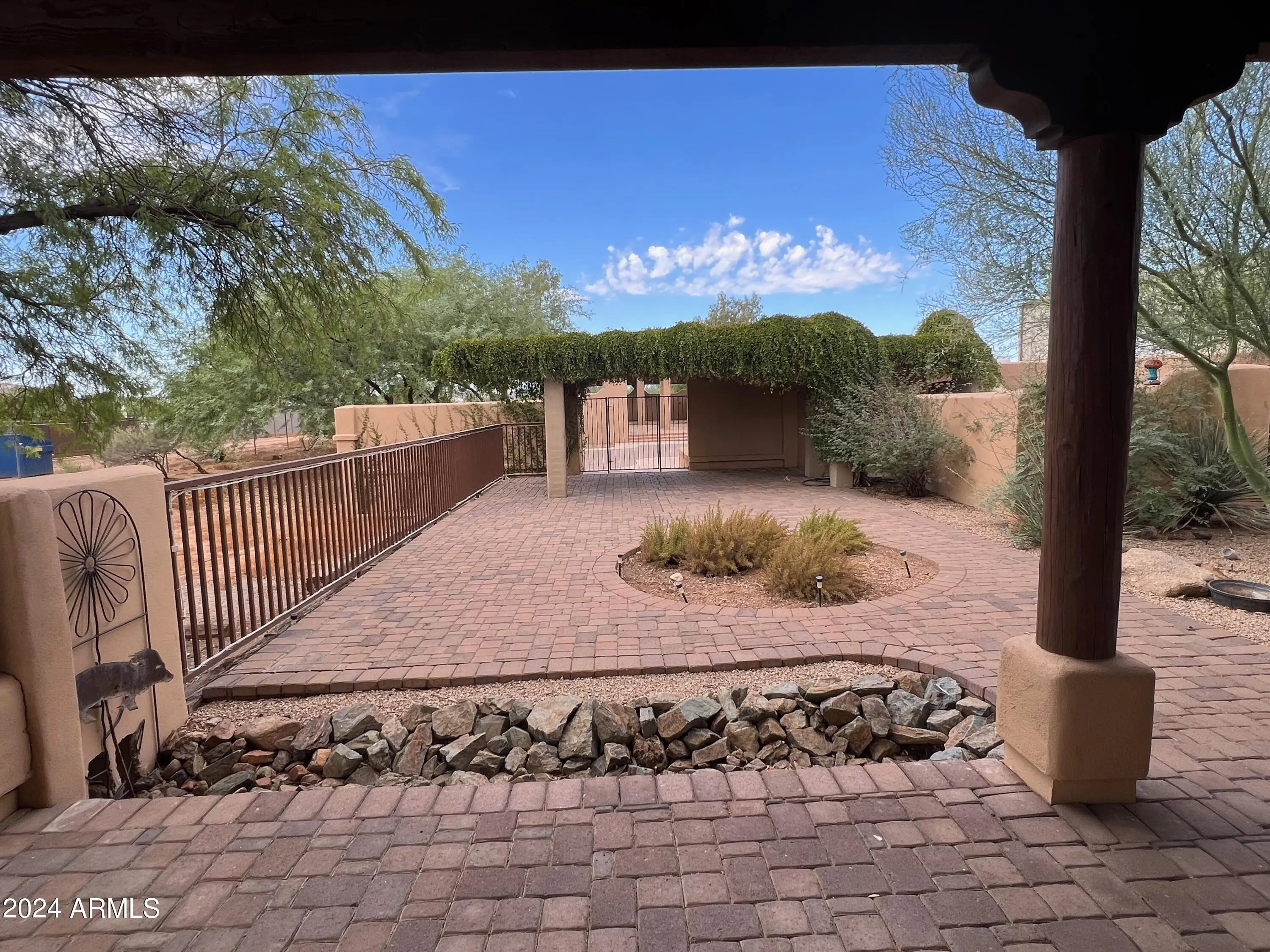 Custom Home at end of road. 3 Bedroom 2.5 bath home. Courtyard entry with fireplace. Lots of custom features, round beams, knotty alder cabinets, granite counter tops in kitchen and baths. Travertine tile. Eat in kitchen with breakfast bar, formal dining room. 3 bedroom home with office/den. Paver stone driveway and patios.