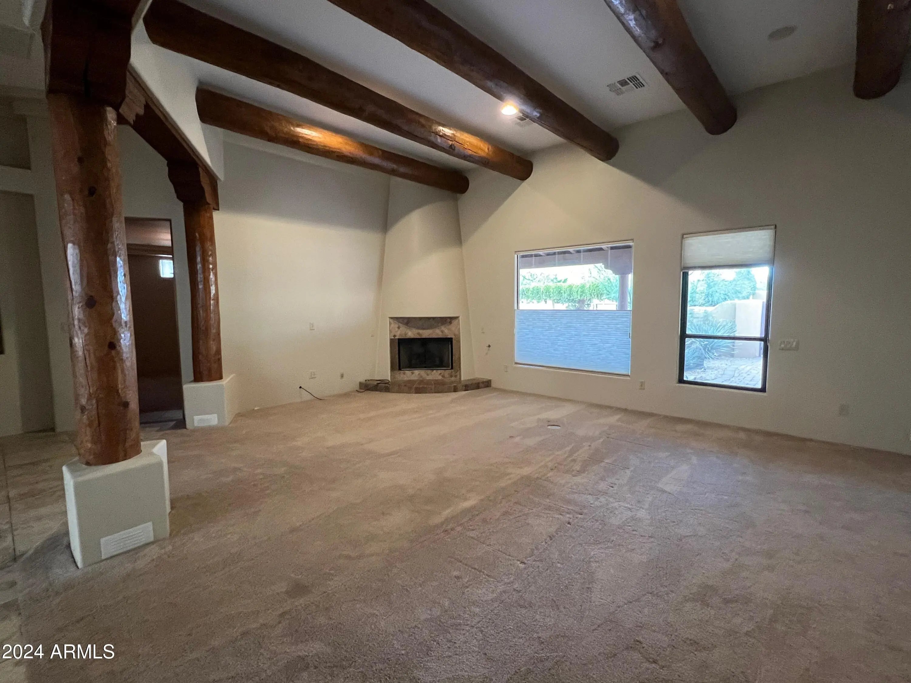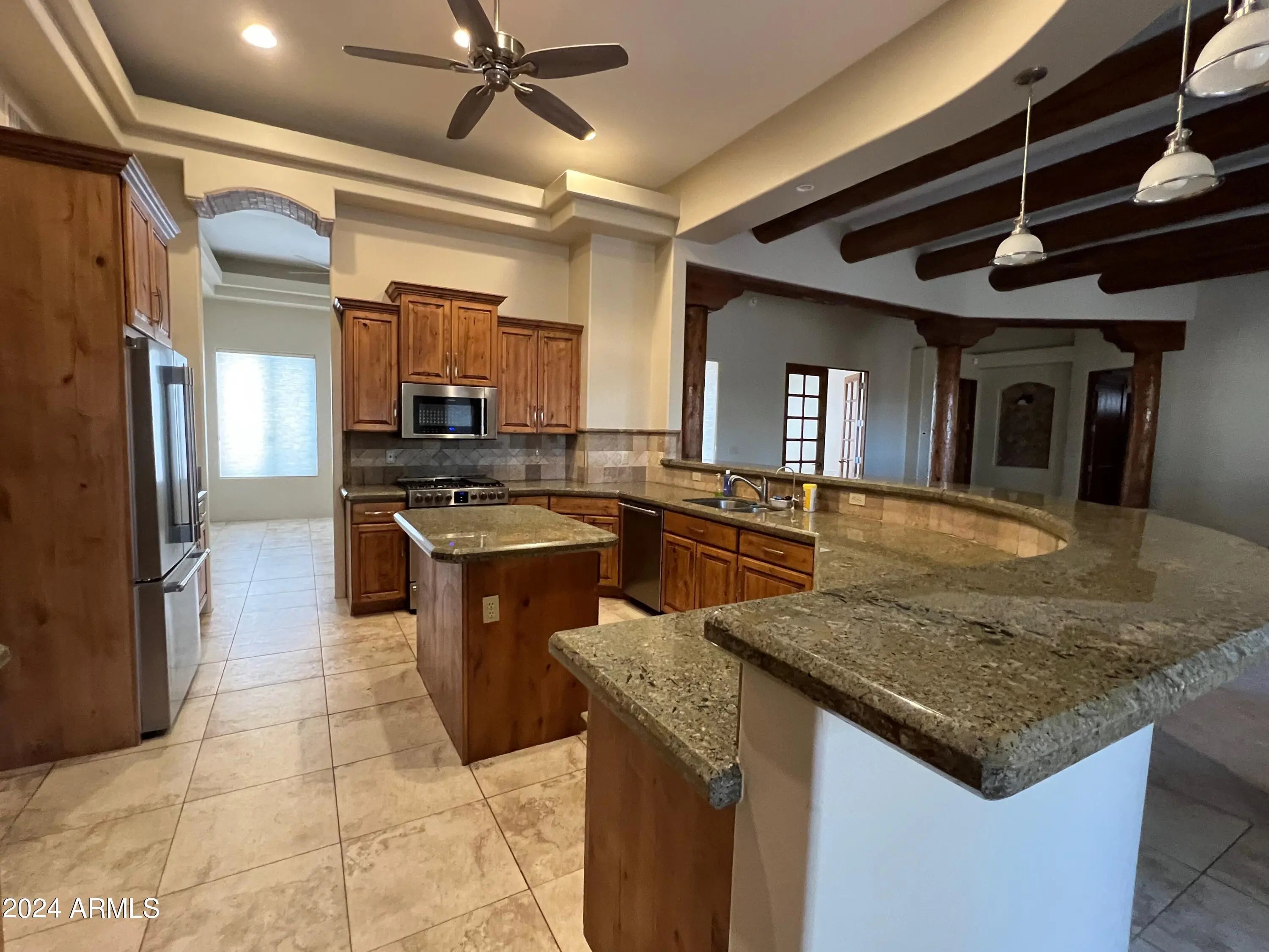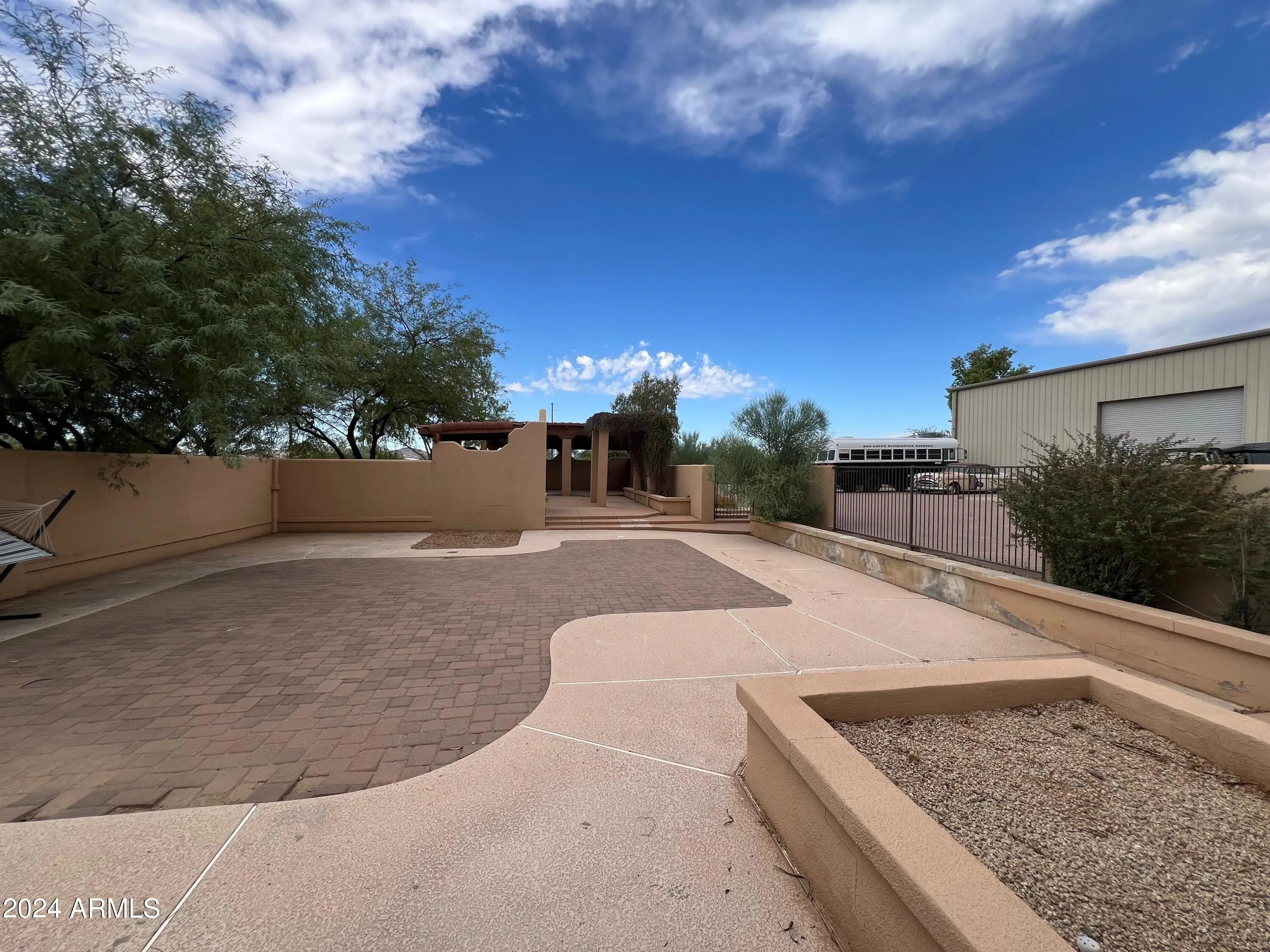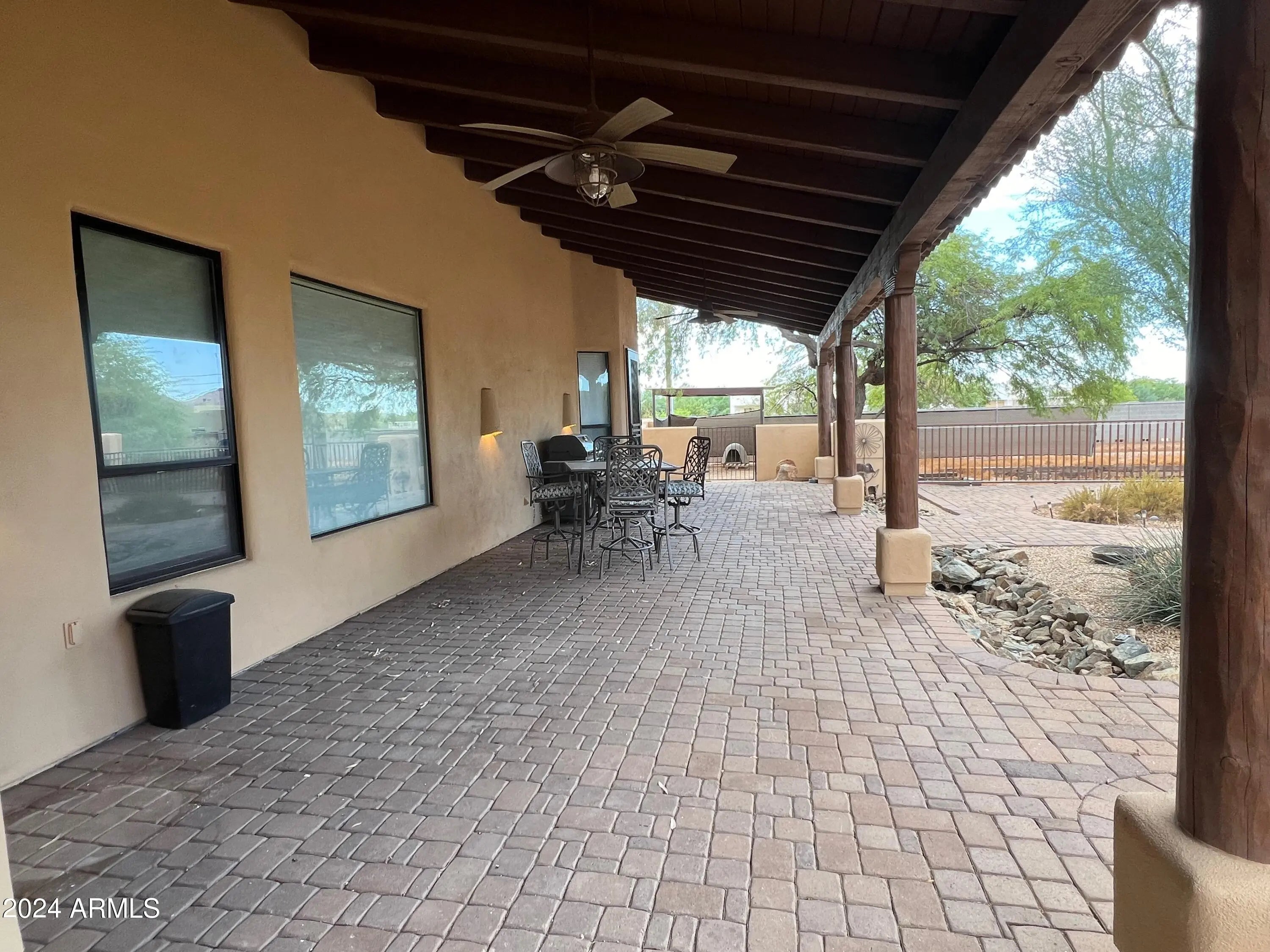 Custom Home at end of road. 3 Bedroom 2.5 bath home. Courtyard entry with fireplace. Lots of custom features, round beams, knotty alder cabinets, granite counter tops in kitchen and baths. Travertine tile. Eat in kitchen with breakfast bar, formal dining room. 3 bedroom home with office/den. Paver stone driveway and patios.