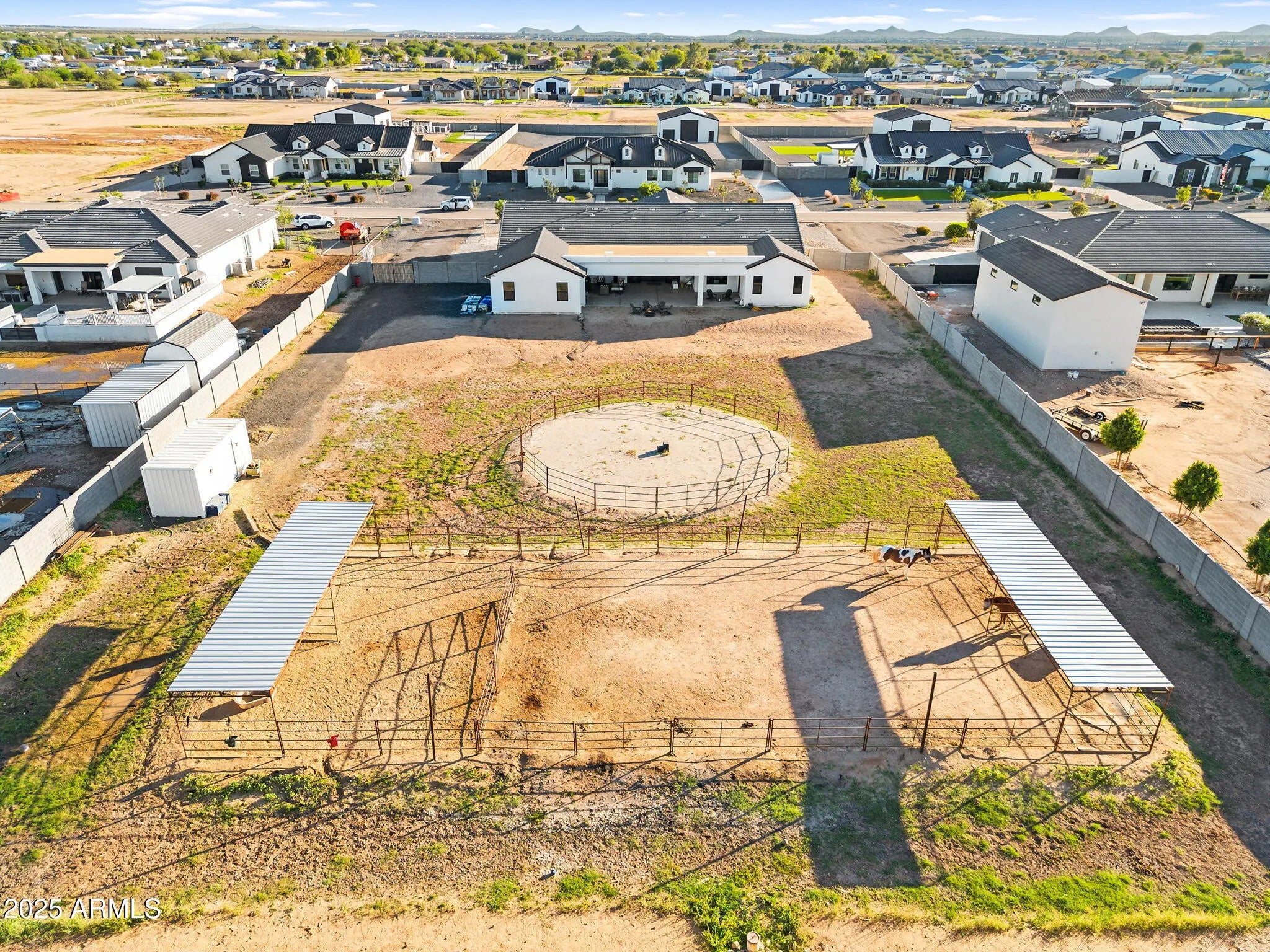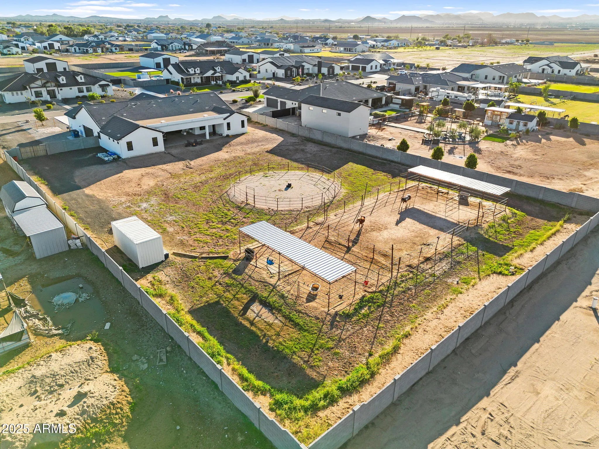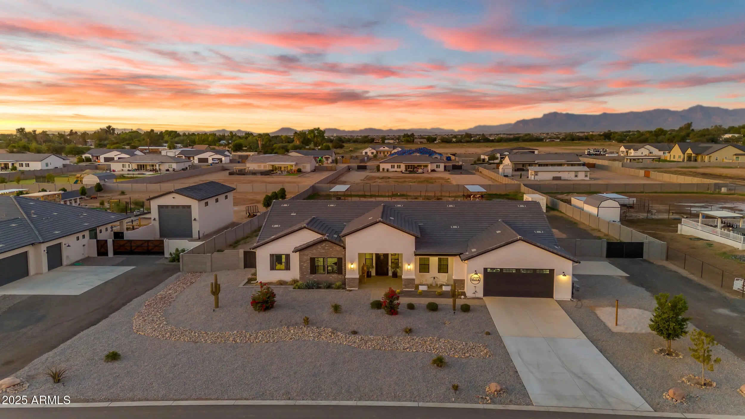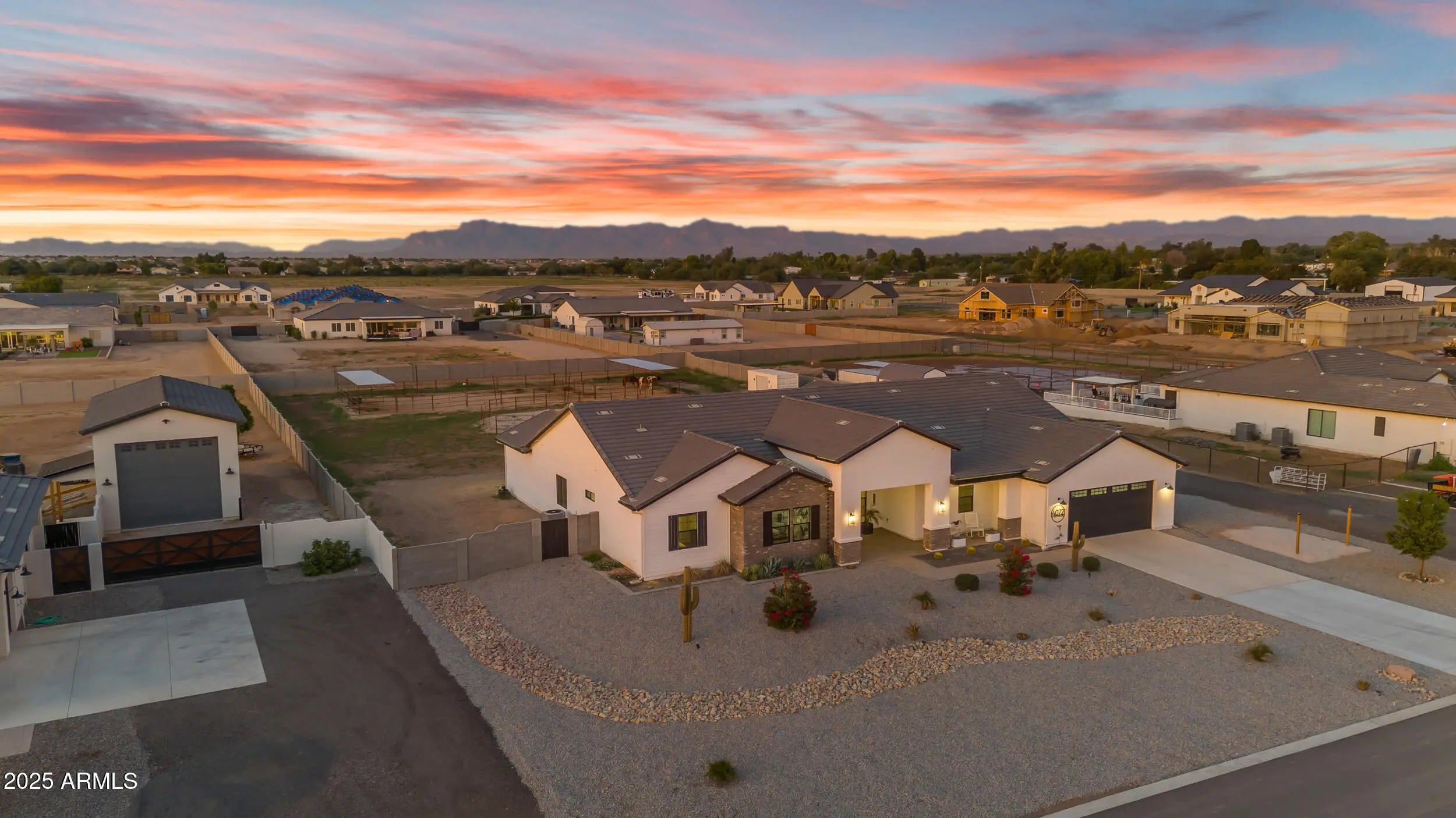 This 5-bedroom, 5-bath home offers 3,721 sq. ft. of beautifully designed living space on a 1.22-acre irrigated lot, all on a paved road. Inside, you'll find a light, bright, and open floorplan featuring tall ceilings, elegant finishes, and generous spaces perfect for entertaining or relaxing with family. The gourmet kitchen and great room flow seamlessly together, creating the heart of the home. Each bedroom offers space and comfort, while the luxurious primary suite provides a private retreat. Step outside to an oversized covered patio ideal for year-round entertaining, complete with breathtaking views of the Superstition Mountains. The property features horse stalls, an RV gate, and plenty of room to bring your animals, toys, or to design your dream backyard. This home also features a 4 car garage. Experience the perfect blend of privacy, space, and peaceful surroundings all while being just minutes from shopping, dining, and everything San Tan Valley and Queen Creek have to offer. This home truly has it all.