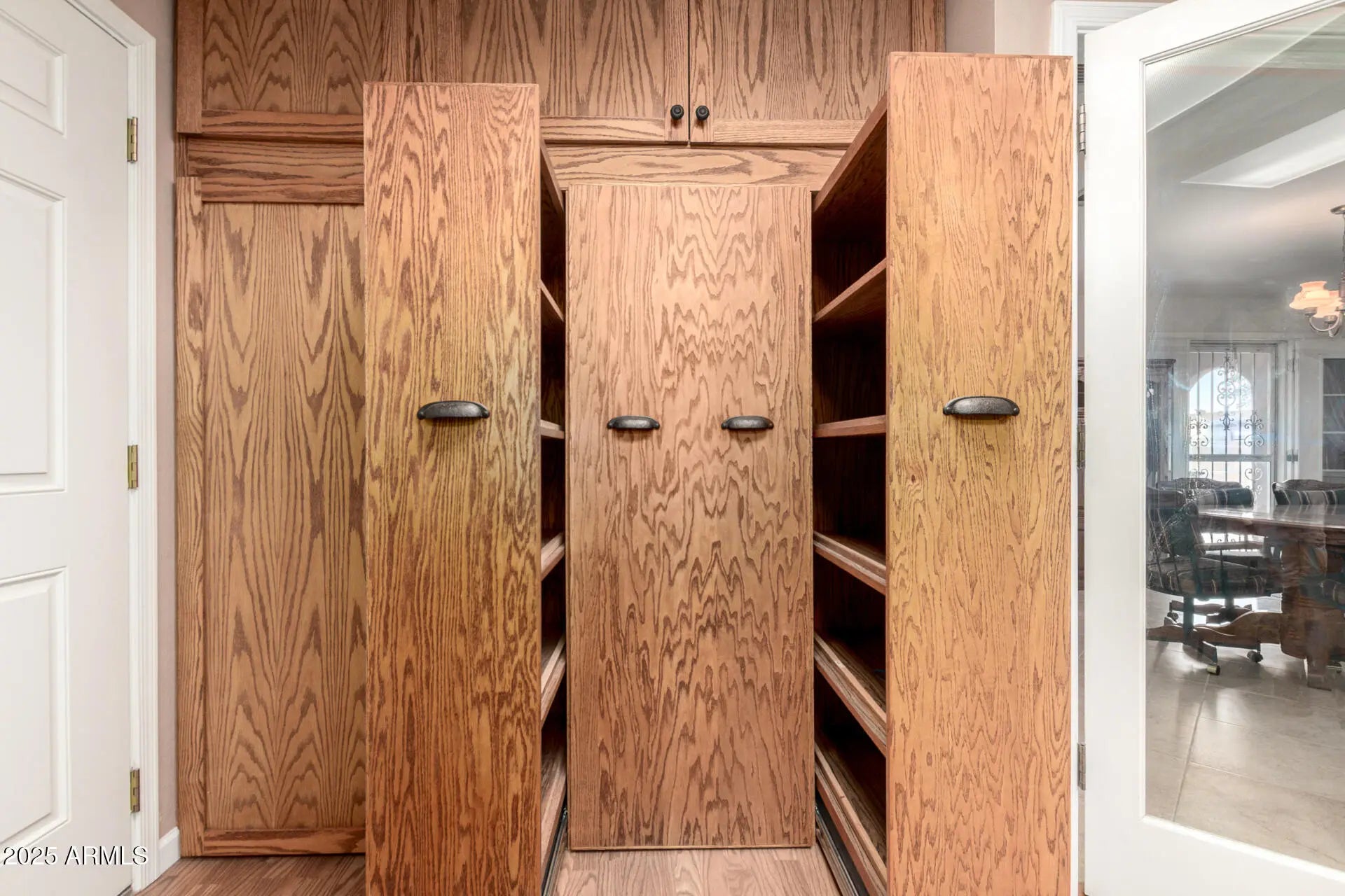 This well-maintained home blends form and function. The exterior features a smooth stucco finish and classic arched entryway, offering timeless curb appeal with low-maintenance desert landscaping and a wide driveway. Inside, you'll find multiple flexible living spaces, including a utility room like no other equipped with elevated laundry, freezer, full-sized safe, built in iron and folding tables, pull out storage shelving and executive multi workstation desk-perfect for anyone working from home. Two bedrooms and two full bathrooms, each updated with tile. Walk-in closets. Custom living space with a murphy bed are perfect for longer term visitors. Step outside to a large extended covered patio with dual ceiling fans, recessed lighting, and plenty of room to entertain or relax