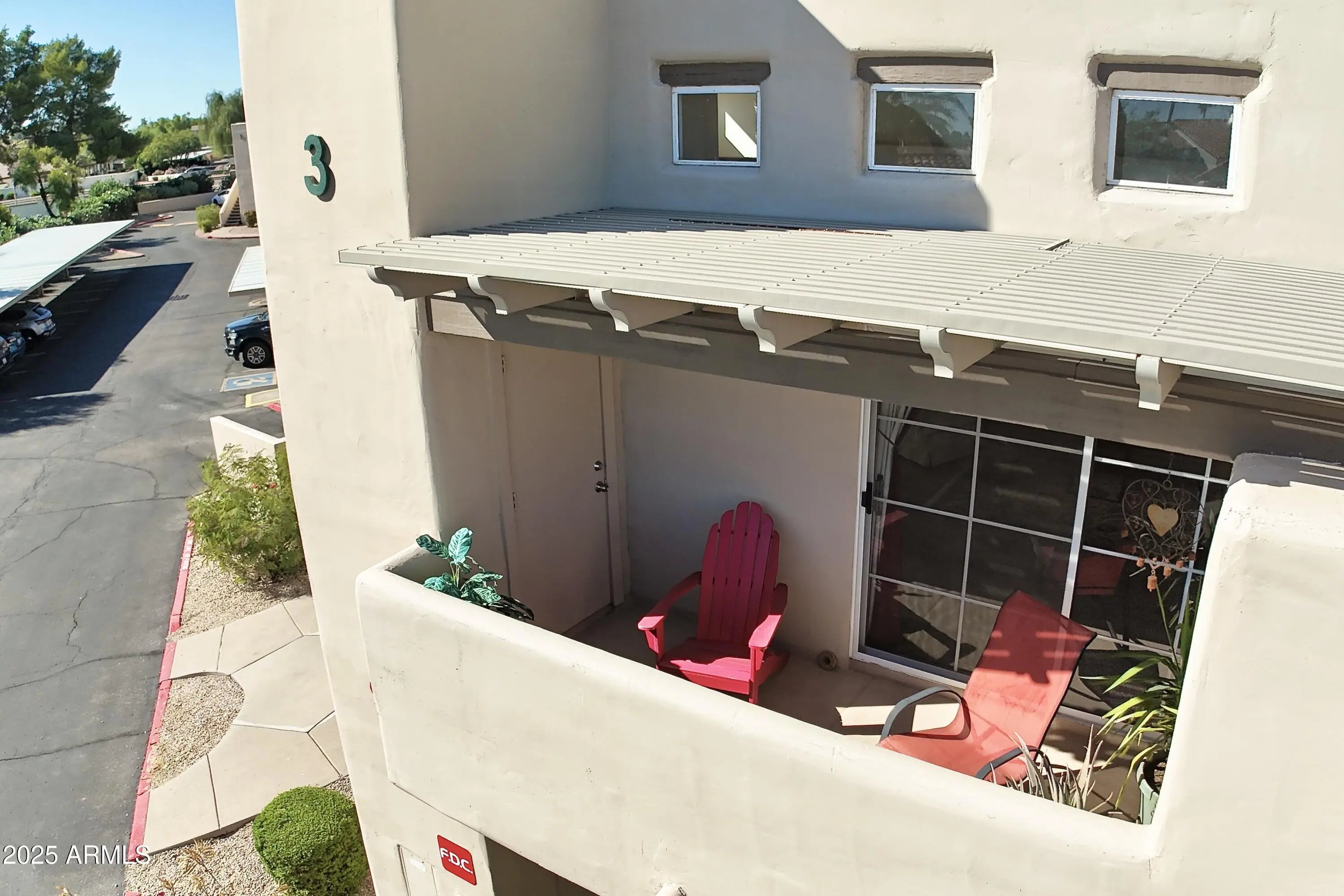 Discover this 2-bed 2-bath residence with its own private entrance staircase. Step inside and be greeted by soaring vaulted ceilings and amazing clerestory windows that bathe the space in natural light, a striking architectural feature you won't find in typical condos! The South-facing orientation fills the home with winter sunlight & provides shade from the harsh Arizona summer heat. The floor plan offers a desirable split layout! And is equipped with new AC unit! Washer/dryer included! Bonus: A custom pergola over the private patio! Mission del Arroyos has fantastic amenities! 2 heated pools/spas, tennis courts and exercise room. The location is superb: close to the 101 and Shea, but best of all, you are right next to the Greenbelt! With access to Lakes & Pathw