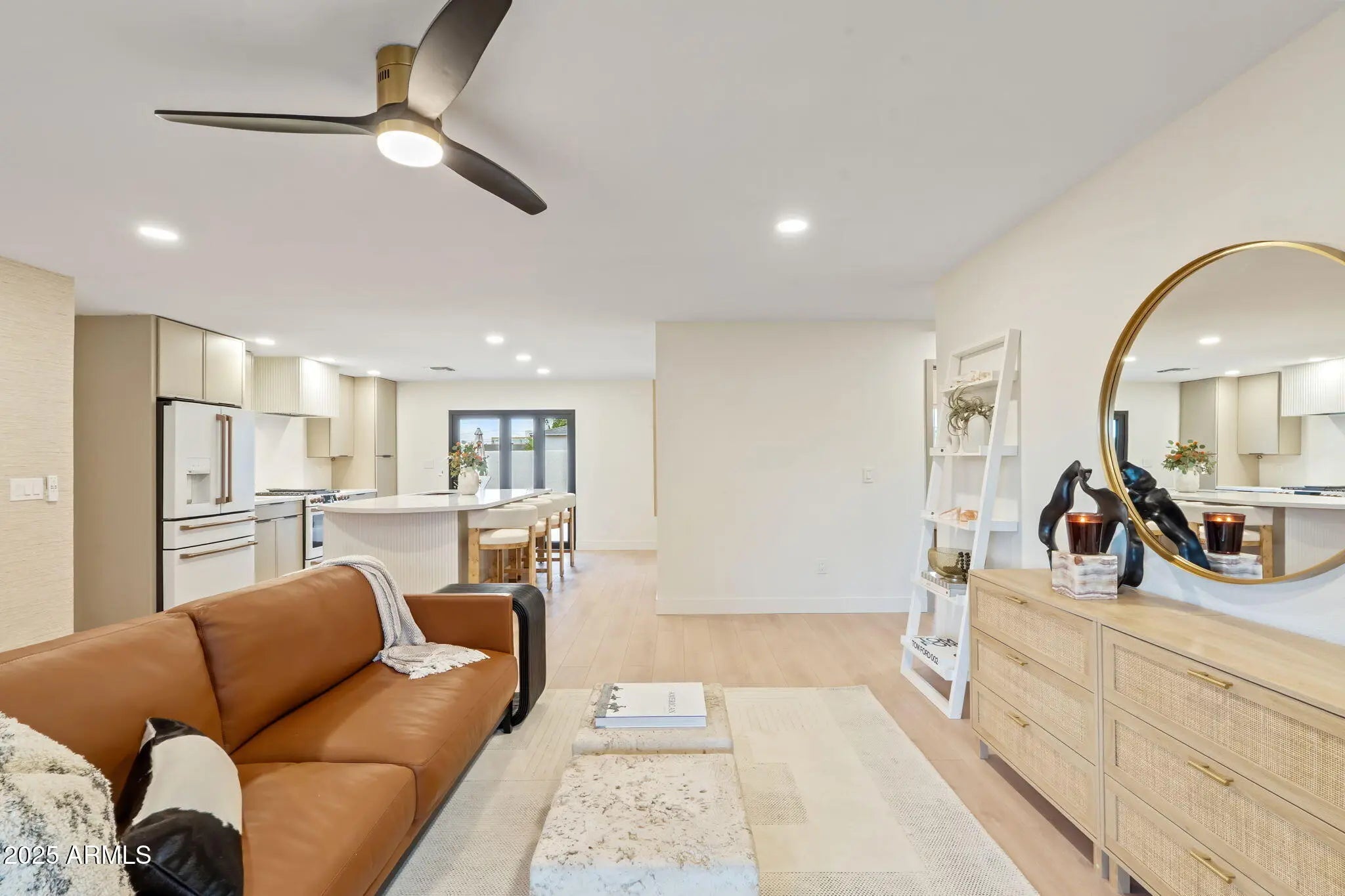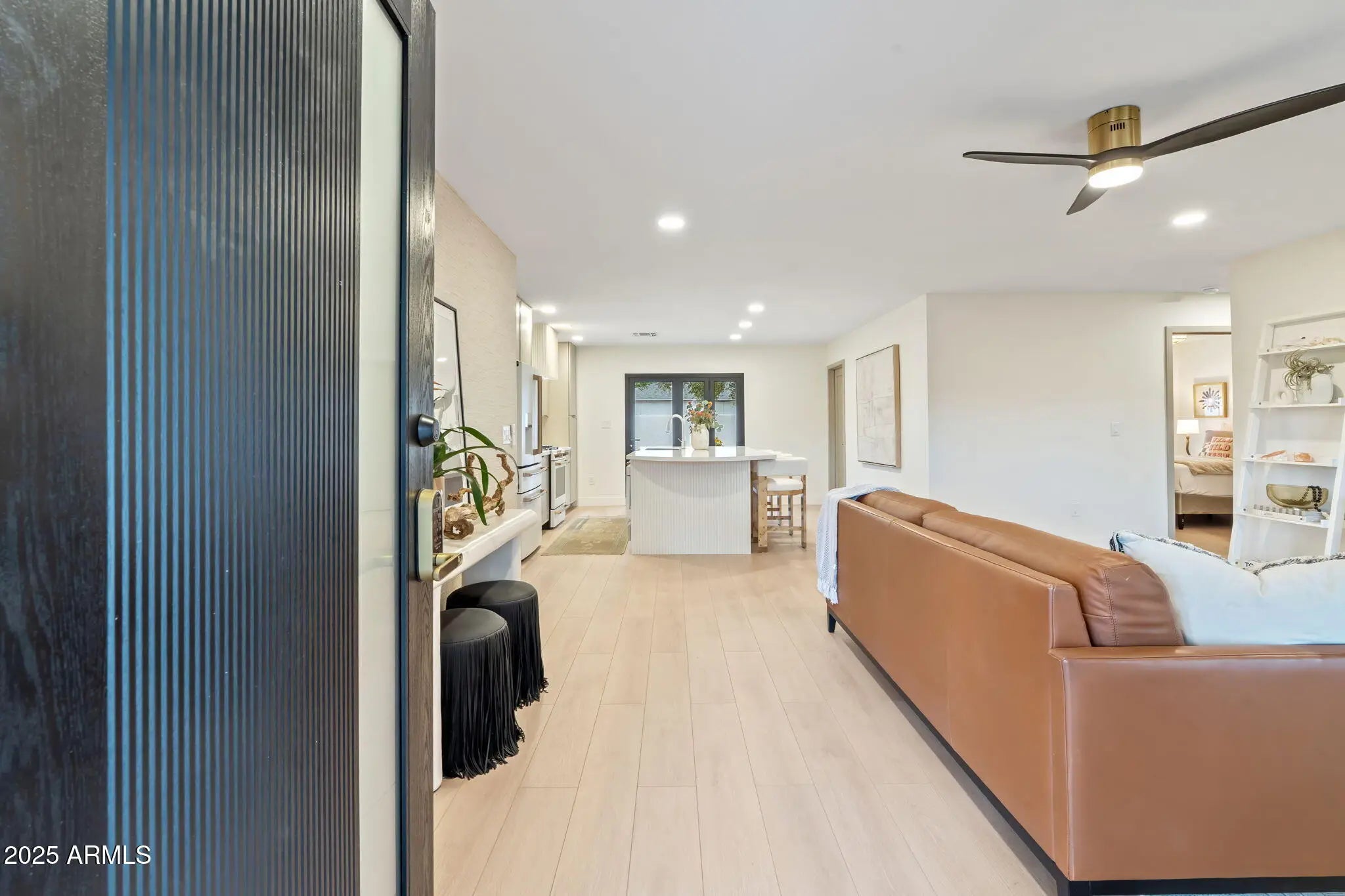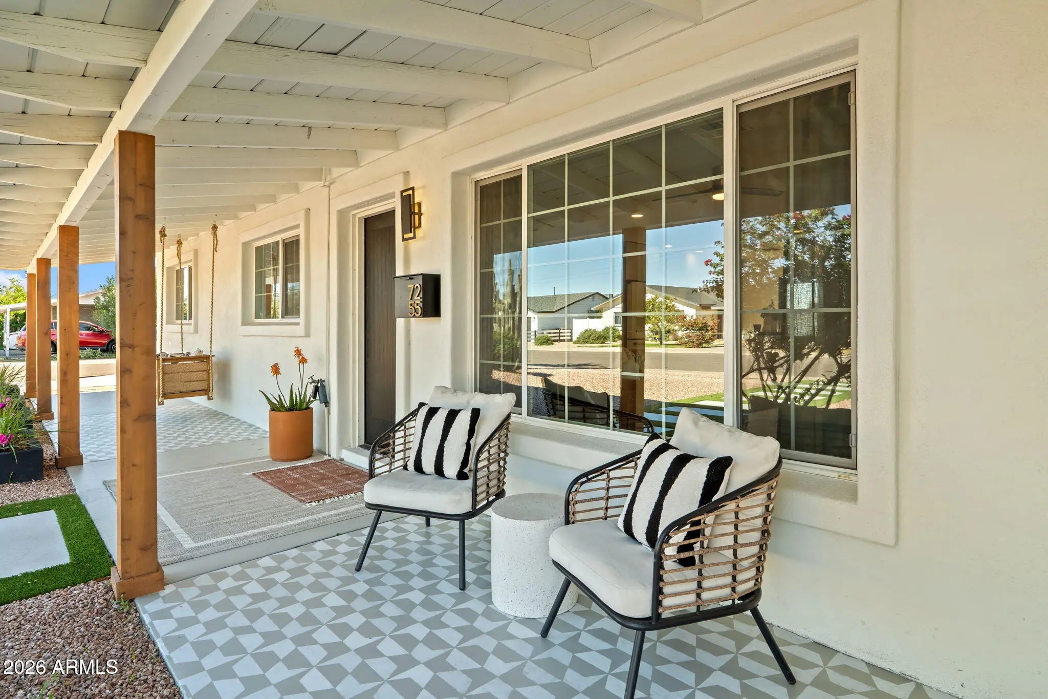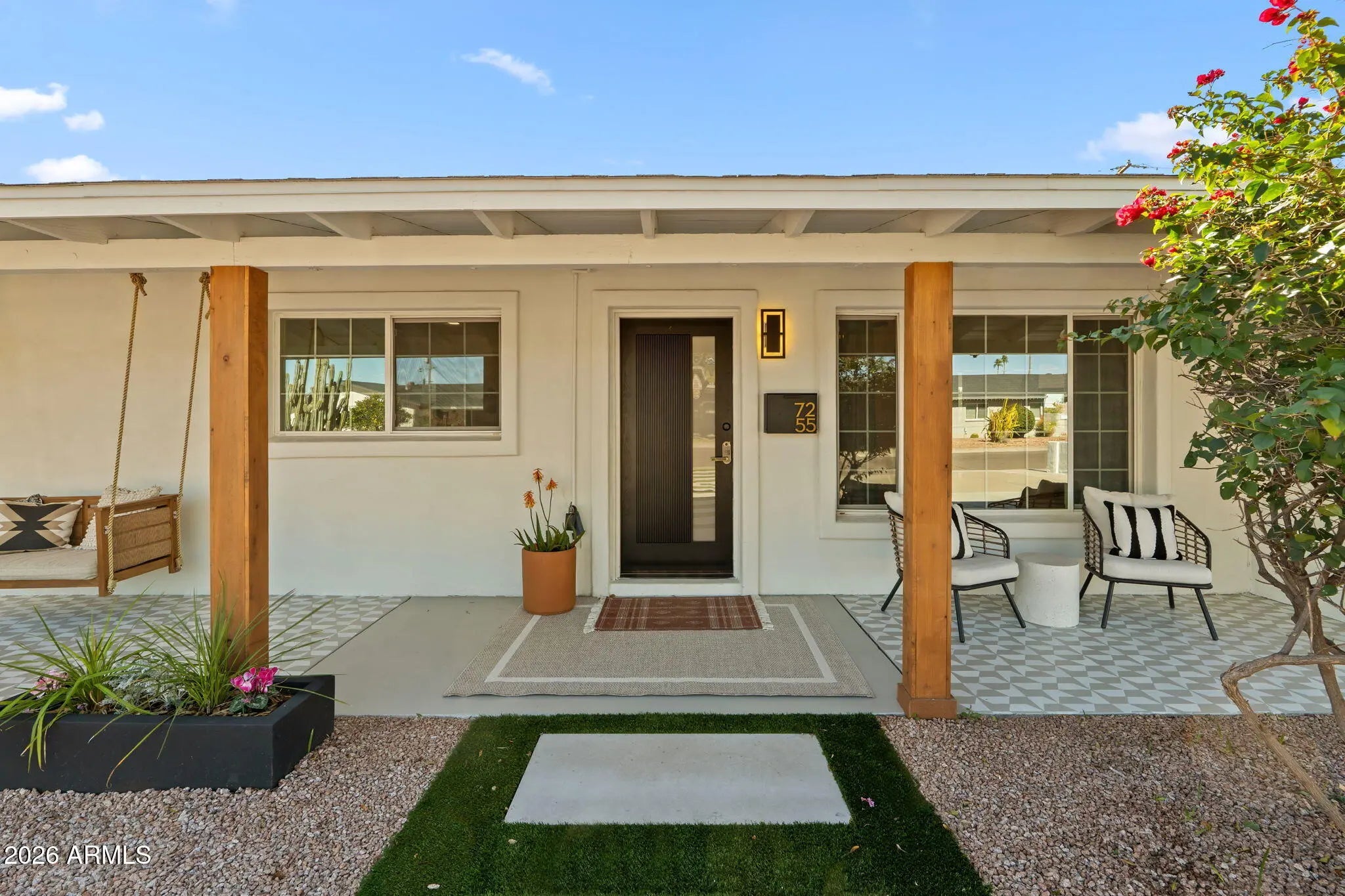 This beautifully remodeled 4-bedroom + Bonus room, 3-bath home in South Scottsdale blends Southwest modern style with warm inviting design. Featuring exterior cedar siding with matching cedar gates and front porch posts. Great curb appeal on a large corner lot with two driveways. Inside boasts an open floor plan with luxury vinyl wide plank flooring throughout. A stunning kitchen with Café appliances, quartz island and backsplash. Custom cabinets and custom fluted hood range and island detail. All three bathrooms are brand new with sleek modern finishes and designer tile. Step outside the bifold slider to the Spool with a heated waterfall grotto and jets. The spacious backyard is perfect for entertaining or unwinding with new turf and a pergola dining area. All new electrical a bonus room, extended owner's suite closet and thoughtful updates, this home offers style, comfort, and a great location, just minutes from Old Town and short 10 min commute to Tempe. Easy access to the 101 and 202.