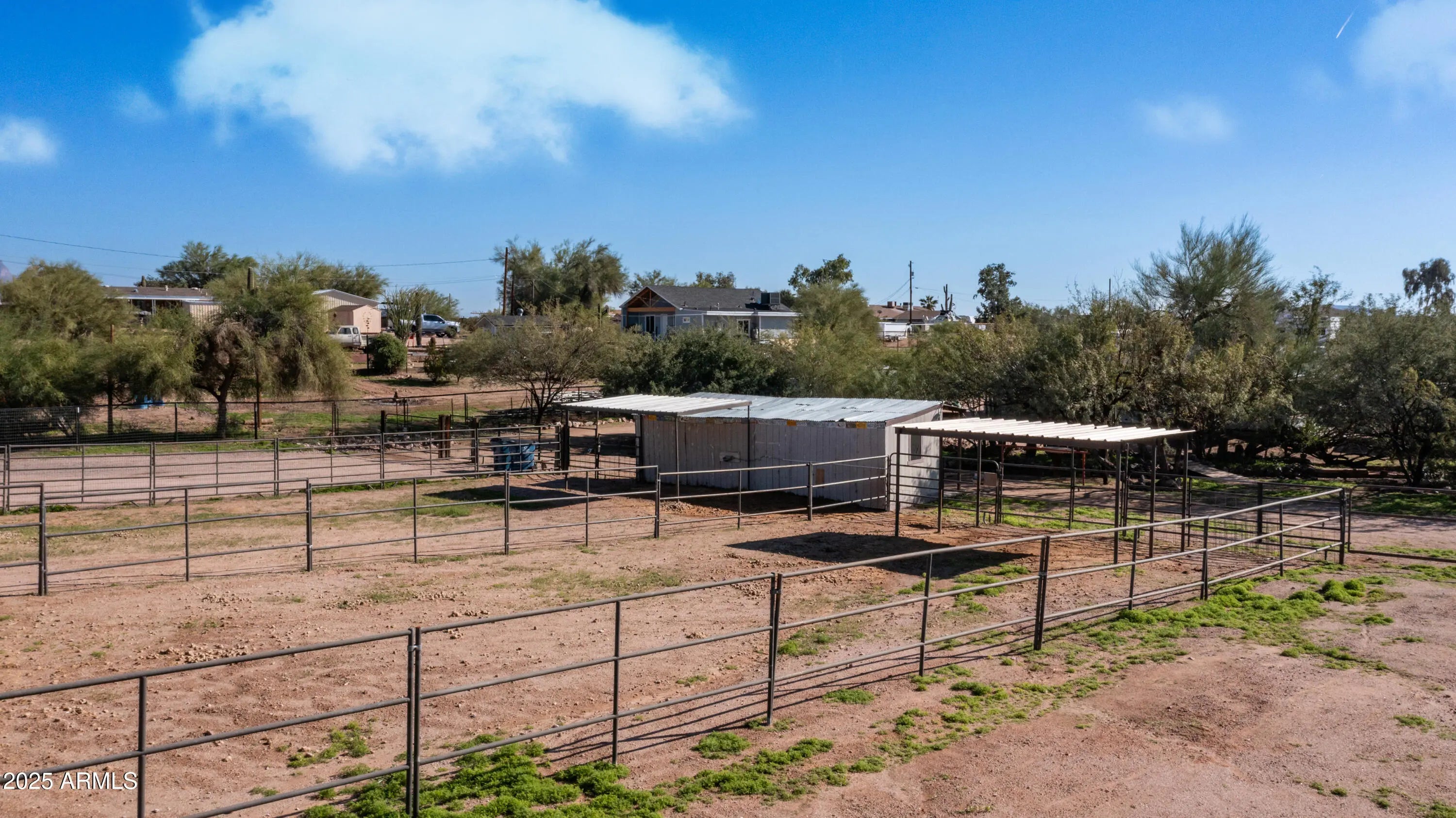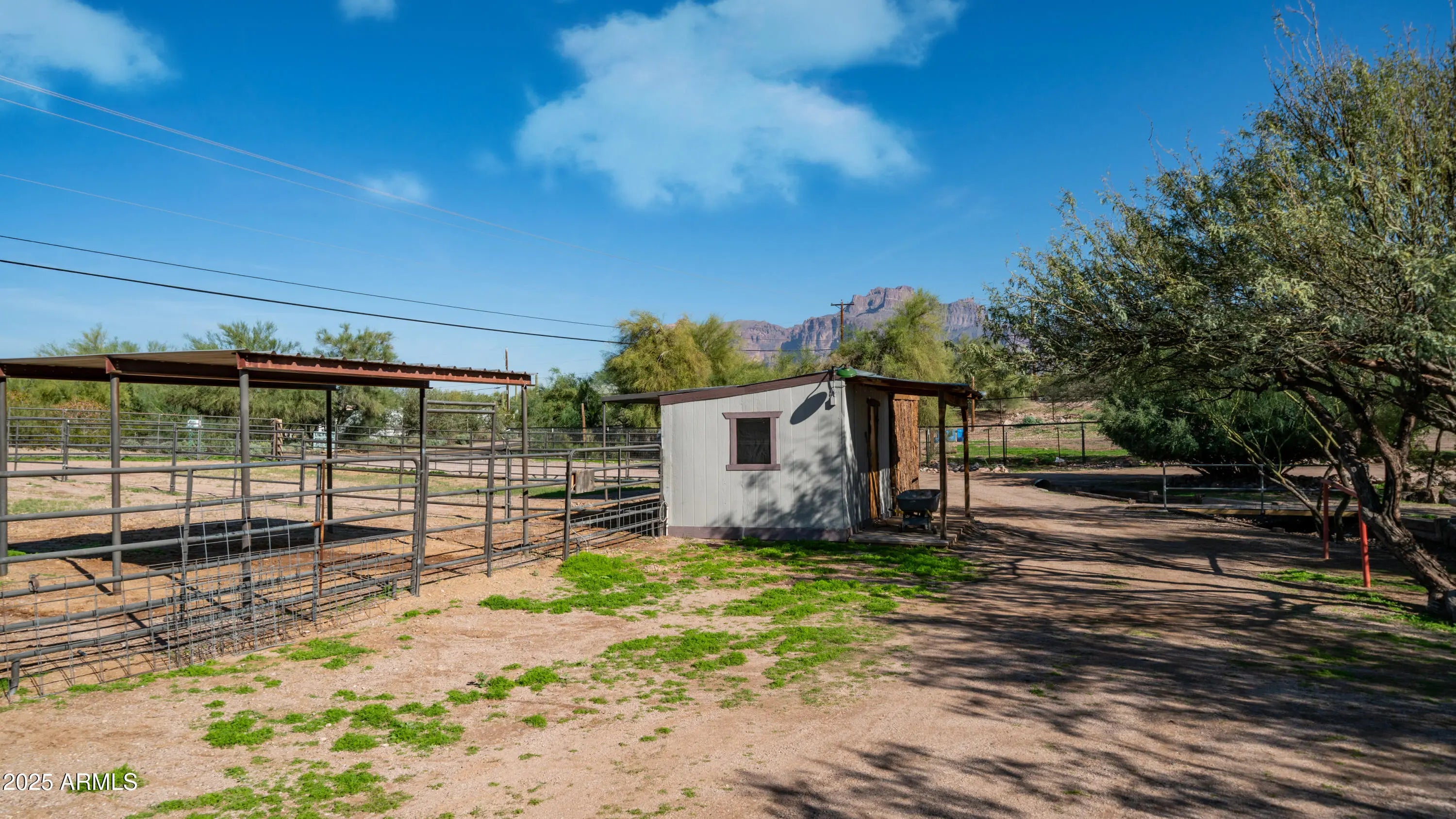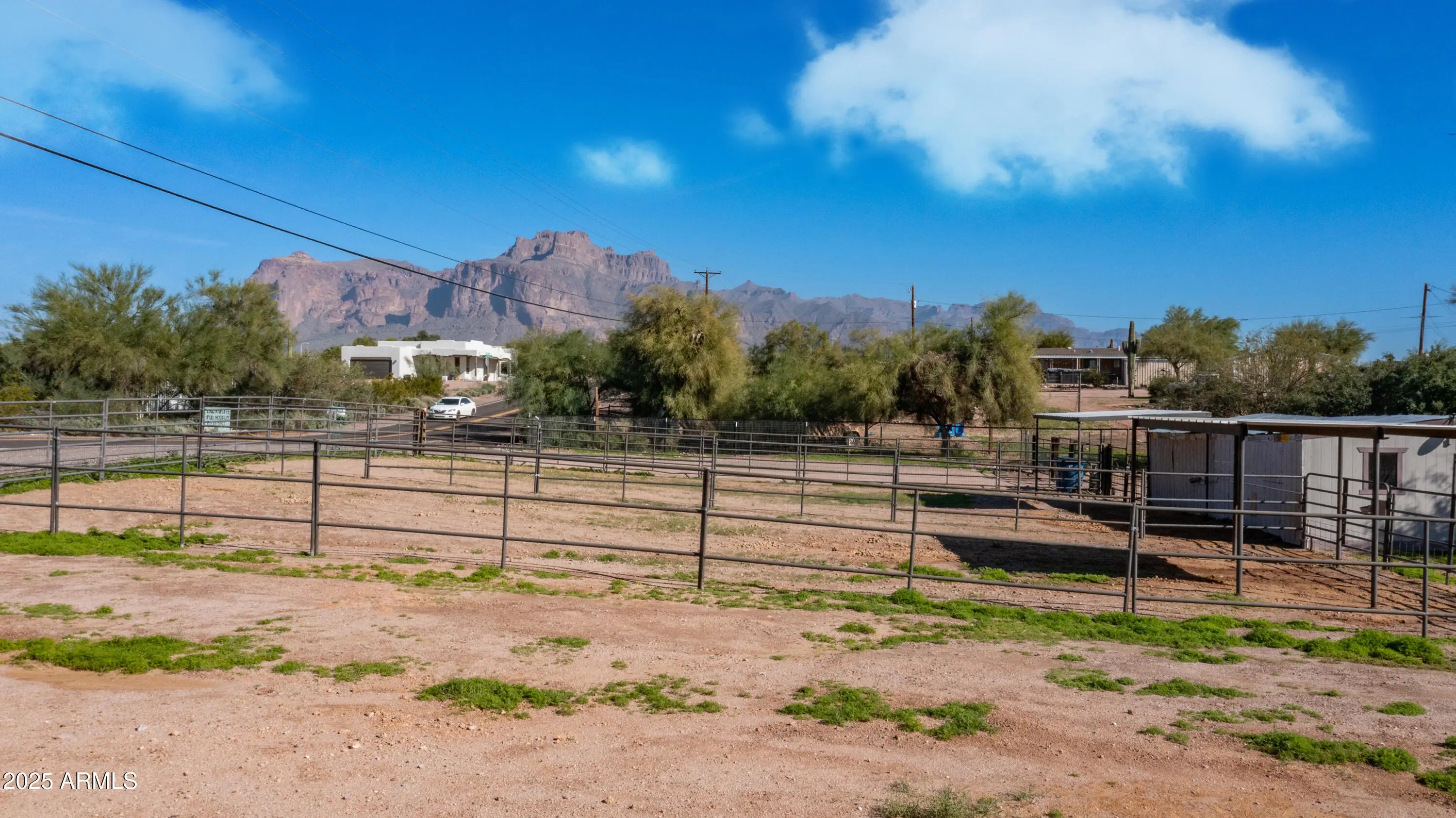 Nestled on an incredible 1.25 acre of fully fenced usable land, this rare non HOA horse property delivers endless possibilities with not one but two separate homes plus a full horse setup. Up front sits the main double wide manufactured home offering three bedrooms & two bathrooms while tucked further back is a charming site built casita style home complete with its own full kitchen bedroom & bathroom making it perfect for multigenerational living guest quarters or double living on one lot. The property is beautifully arranged with three large horse enclosures a dedicated tack room mature desert landscaping natural shade trees terrific open space everywhere & spectacular views of the Superstition Mountains. With some handy skills & a little love this property has all the potential to shine bright & become the dream ranch retreat you have been searching for. Enjoy country style living with Arizona Water plenty of room to roam space for all your hobbies & the convenience of being just minutes from town. This one is priced right ready for new owners & absolutely bursting with opportunity.