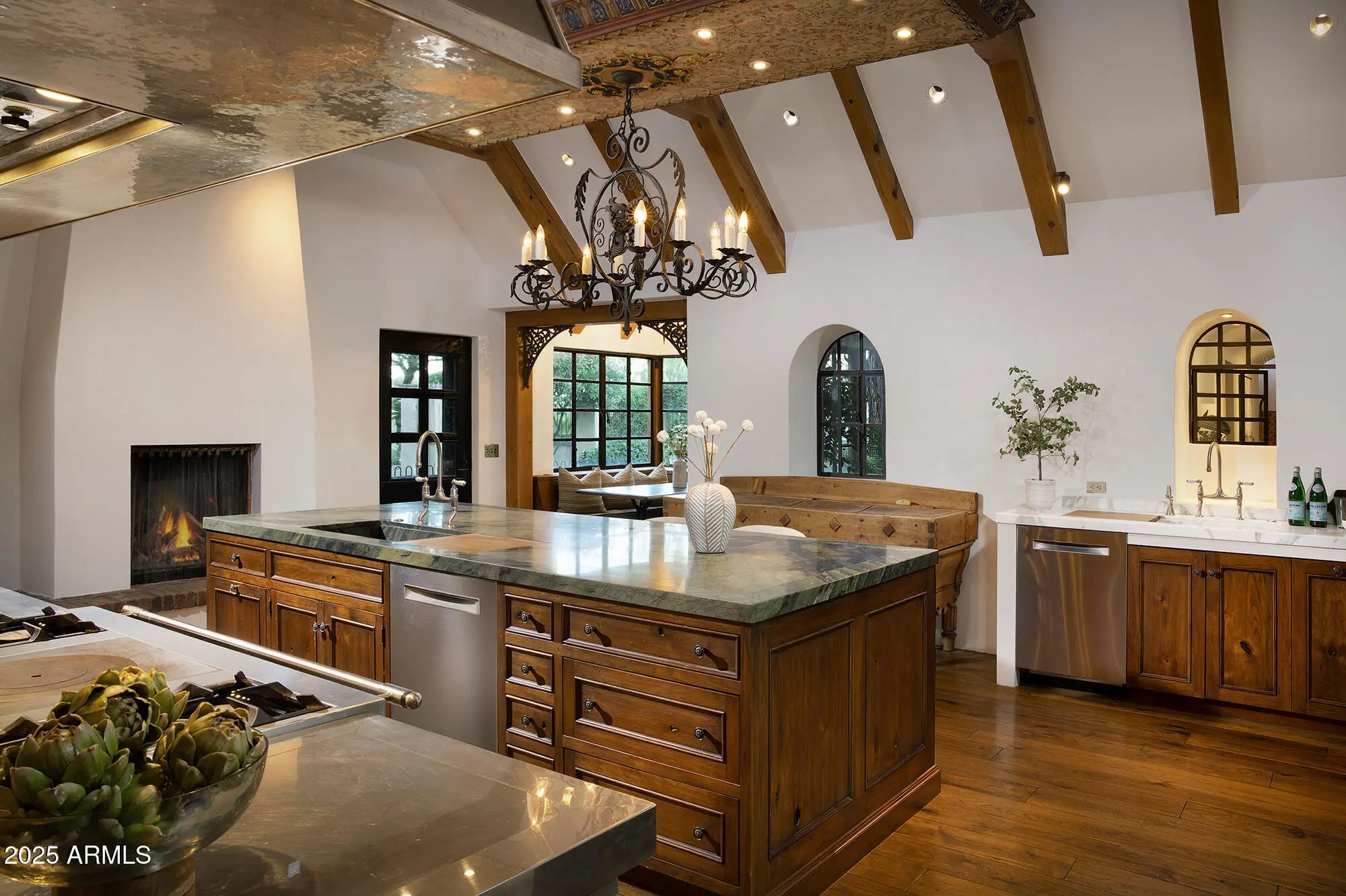 Complete with an Estancia Golf Membership (upon board approval), a timeless estate nestled in the exclusive private community celebrated for world-class golf, elevated living & privacy defines the North Scottsdale experience. This residence captures the essence of luxury & tranquility with a premium lot within the guard gated enclave of Estancia. Poised along the 14th green of the Tom Fazio designed championship course, the 7617 sqft custom residence is a seamless fusion of sophistication & craftsmanship, framed by sweeping, unobstructed views of Pinnacle Peak & Troon Mountain. Freshly painted interiors are framed by cathedral wood beam ceilings, reclaimed wide-plank oak floors & 7 gas fireplaces, setting a refined ambiance & warmth throughout. The gourmet kitchen, complete with custom butternut cabinetry by de Giulio, a striking Verde Bamboo granite island, La Cornue range with bespoke hood & SubZero refrigeration serves as the heart of the home, anchored by a fireplace inviting intimate morning gatherings. Designed for grand entertaining & relaxed living, the formal dining room is a showcase of craftsmanship with antique herringbone oak floors, full bar & elegant wine cellar - perfect for hosting soirees & memorable celebrations. Steel & wood-framed windows capture tranquil panoramas of mountains & fairways, blurring the boundary between indoor comfort & outdoor serenity. The backyard retreat unfolds like a private sanctuary, complete with a private pool & separate spa, stone terraces & lush landscaping, all set against the mesmerizing backdrop of rolling greens & the Arizona skyline. Beyond the residence, Estancia offers a lifestyle of security, exclusivity & world-class amenities: a championship 18-hole Tom Fazio golf course, tennis & pickleball, a heated 25-meter pool & spa, fitness center, spa services, & gourmet clubhouse diningreserved for members and their guests. A true embodiment of refined desert luxury, this extraordinary estate invites you to experience the harmony of architecture, nature & lifestylewhere each sunset over Pinnacle Peak becomes a moment of art & every day feels like a retreat.