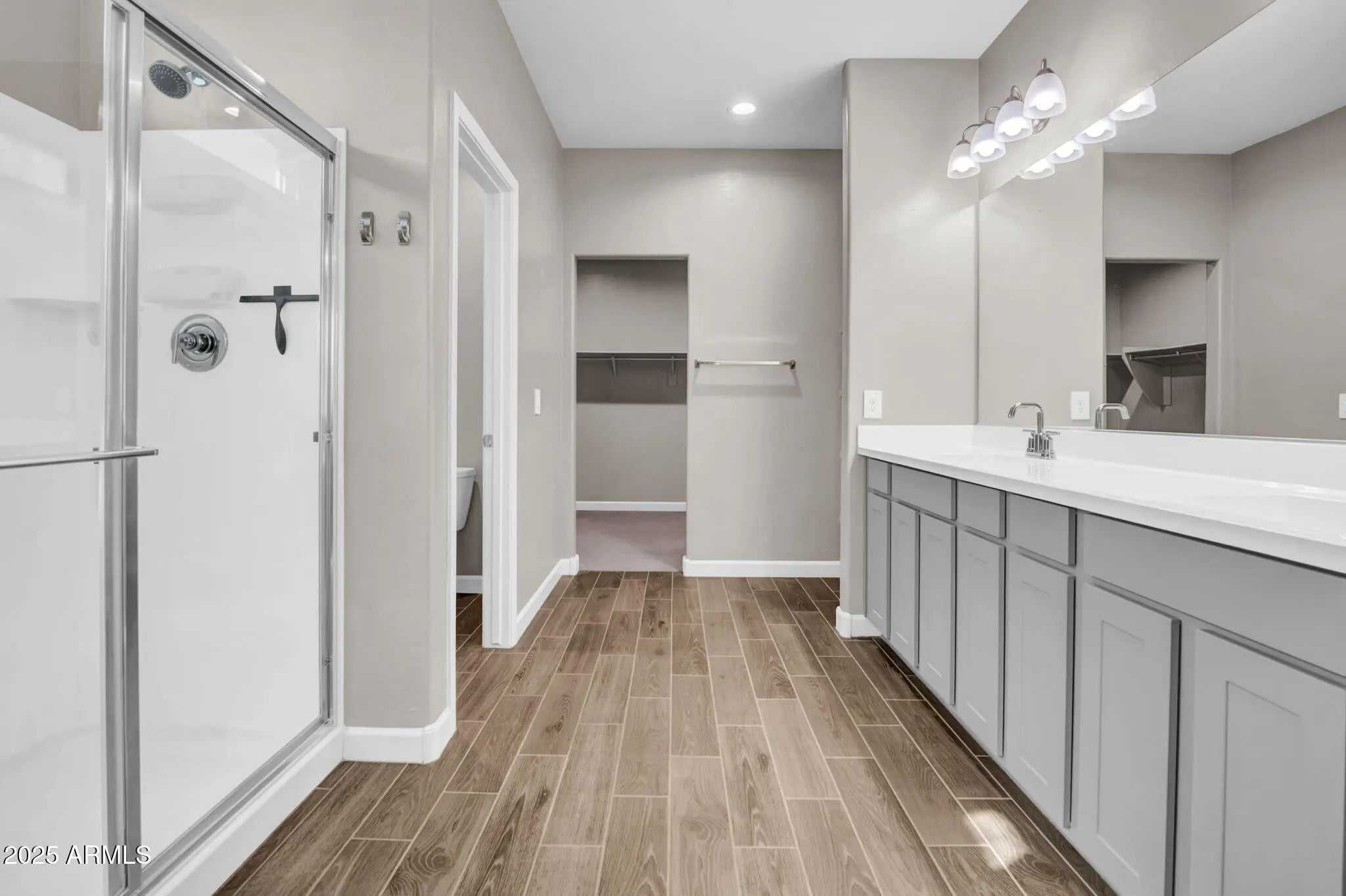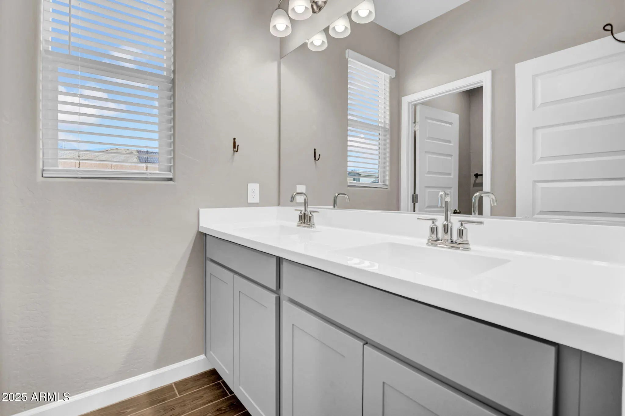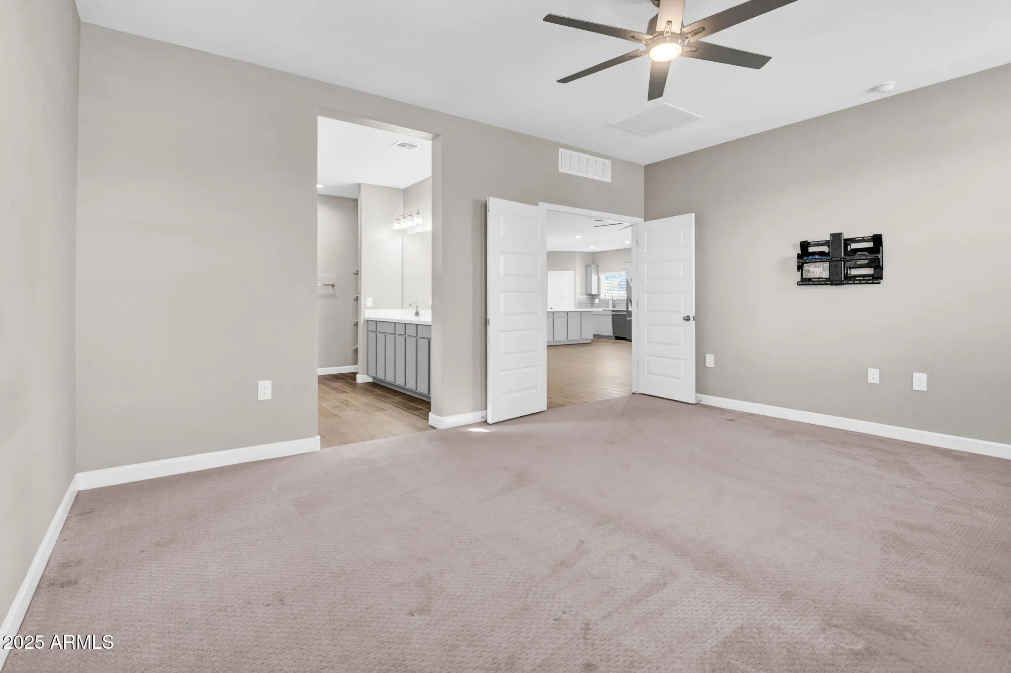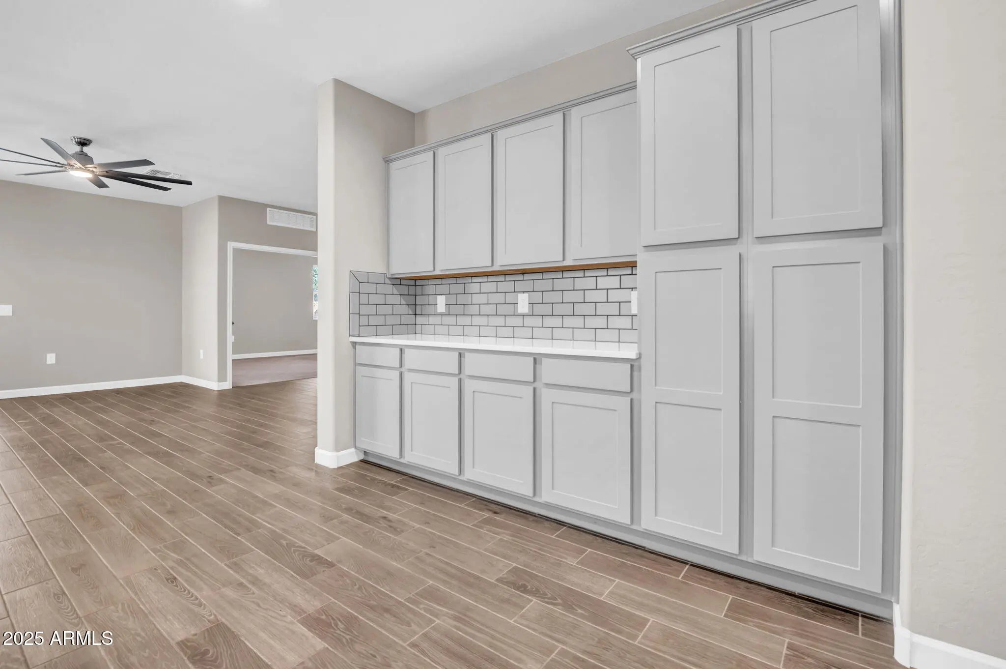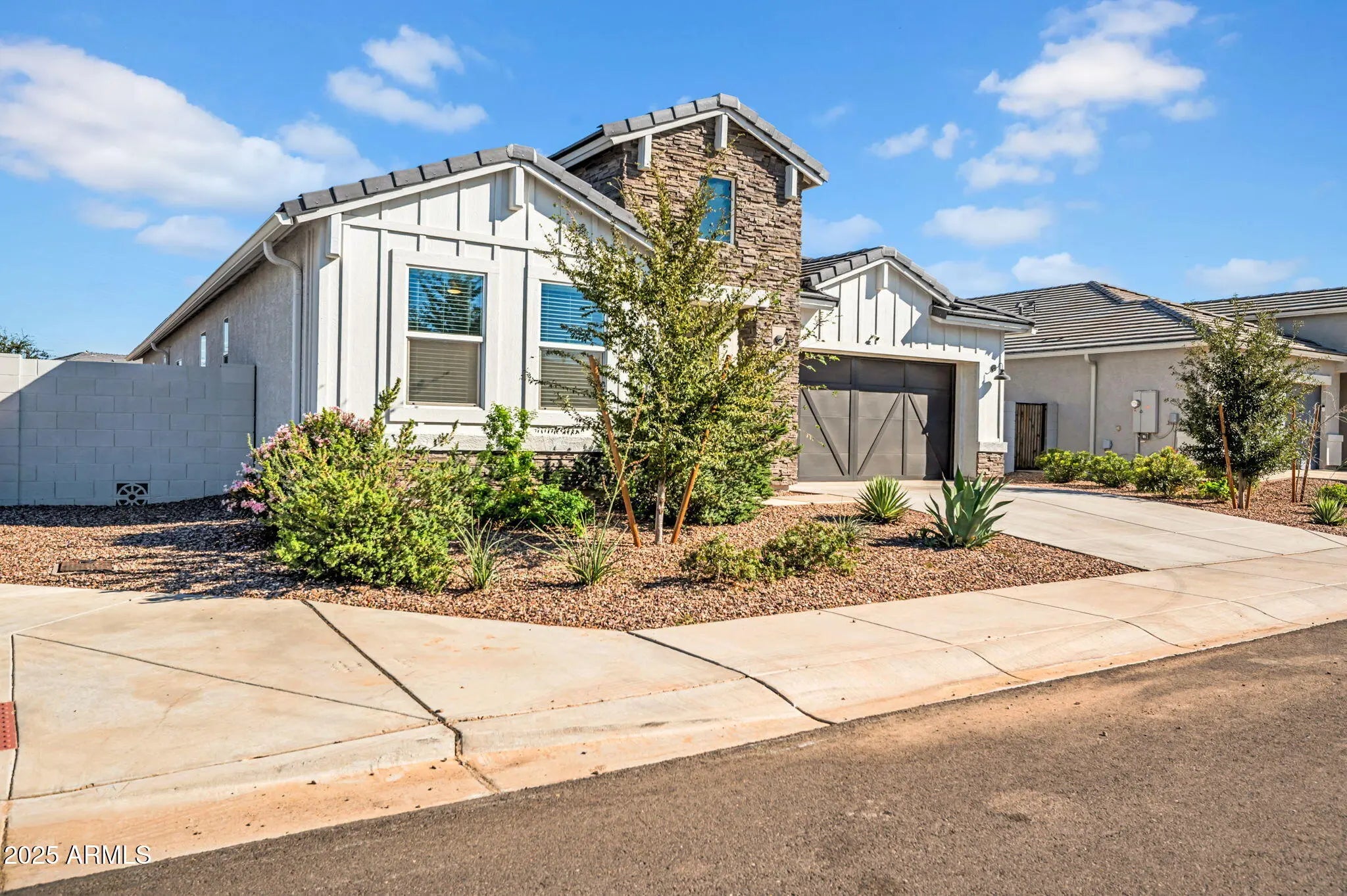Built in 2022, this thoughtfully finished single-level home sits on a premium corner lot with peaceful greenbelt views. Inside, warm plank-tile flooring leads into an airy great room and a modern kitchen with a quartz island, walk-in pantry, and sleek finishes. The 4-bed, 3-bath layout includes a private ensuite bedroom ideal for guests or multigenerational living. The serene primary offers dual sinks, a walk-in shower, and direct laundry access. A low-maintenance backyard and covered patio create effortless outdoor living. Located in a gated community with parks, trails, and close access to Queen Creek amenities.