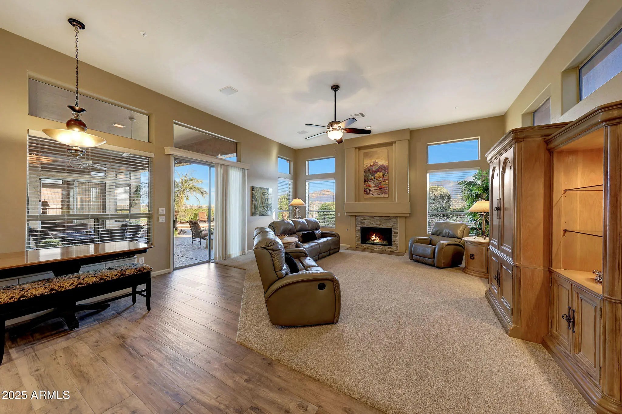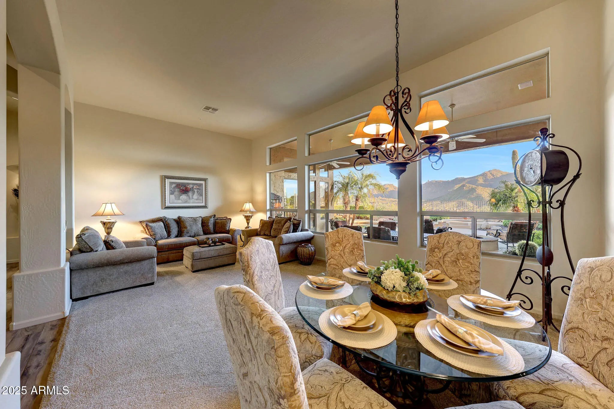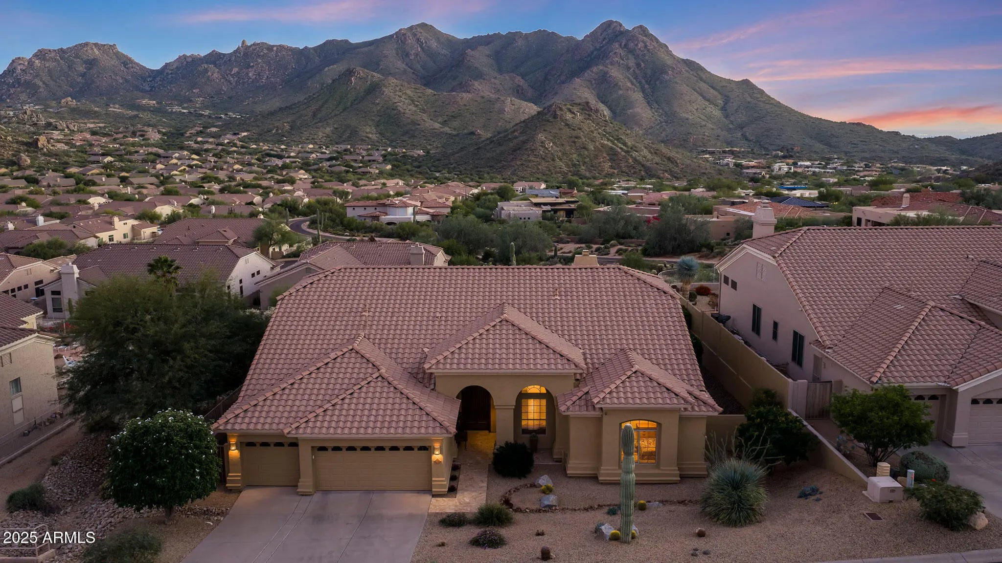 Beautifully updated 4-bedroom, 2.5-bath, 3,054-square-foot home in Dorado at Troon Village available turn-key, fully furnished! Set on arguably one of the best lots in the neighborhood, this elevated homesite captures stunning views of Four Peaks, Tom's Thumb, the McDowell Mountains, and down-valley city lights. Inside, a 2017 remodel includes the kitchen featuring white cabinetry with pull-out spice racks and pop-up mixer lift stand, granite counters, top-of-the-line Wolf stainless steel appliances, including wall ovens and a gas cooktop, a paneled Sub-Zero refrigerator, a corner pantry, countertop seating, and a beverage/wine fridge. A cozy breakfast nook with built-in seating overlooks the yard. The kitchen opens to the family room with a fireplace and abundant natural light from the view windows. Formal living and dining spaces off the entry frame more mountain views. High-end wood-look tile flooring and premium carpet run throughout. The spacious primary suite offers exterior access, a corner soaking tub, split dual vanities with a seated makeup area, a walk-in shower, and dual closets. A laundry room provides excellent storage and direct access from the 3-car garage. The backyard is an entertainer's dream with a pool and spa, a large covered porch, a built-in BBQ, a fire pit, and plenty of space to enjoy the panoramic vistas. This home can be completely furnished and accessorized by Separate Bill of Sale. Dorado at Troon Village, built by Centex Homes, sits just southeast of Troon Mountain and offers close proximity to multiple hiking trails within the McDowell Sonoran Preserve. Pinnacle Peak Park is nearby, along with George "Doc" Cavalliere Park, featuring open lawn space, a playground, basketball courts, restrooms, and an easy hiking trail.