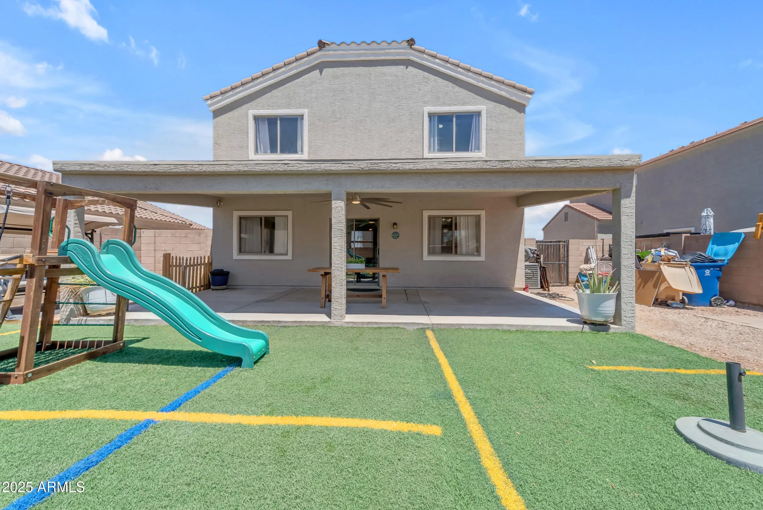Gorgeous 4 Bedroom, 3 Bathroom Home with Neutral Paint, Carpet and Wood Plank Tile Floors. One Full Bedroom and Bathroom Downstairs. Massive Upstairs Loft could be Converted into 2 Additional Bedrooms. Kitchen Showcases Maple Cabinets, Custom Backsplash, Breakfast Bar, Stainless Steel Appliances, and Pantry. Large Primary Bedroom with En Suite has Makeup Vanity, Tub/Shower Surround, and Large Walk-In Closet. Backyard Features Extended Covered Patio, Artificial Turf, and Swing Playset with Multiple Slides. Home is near schools, parks, dining, shopping, entertainment, I-10, and Loop 303.