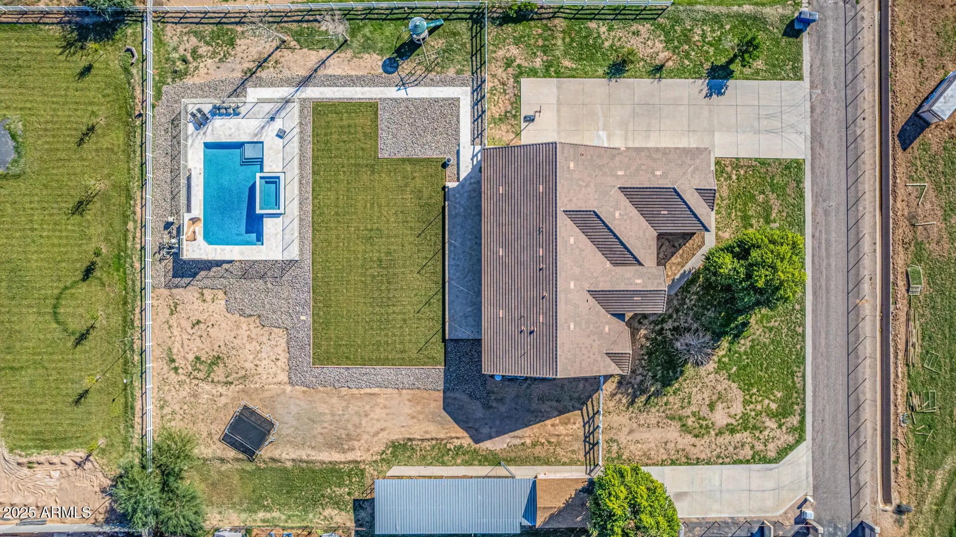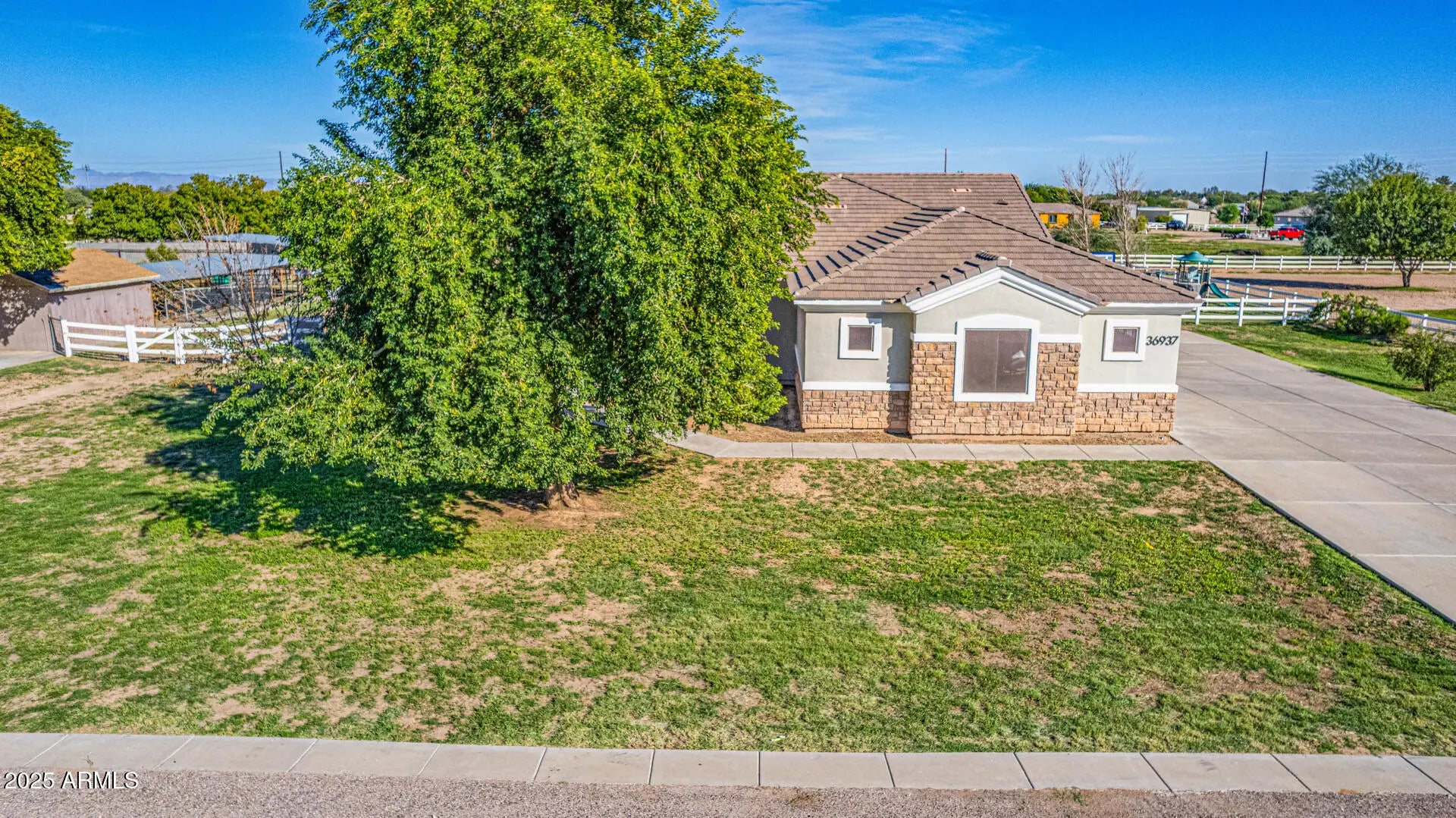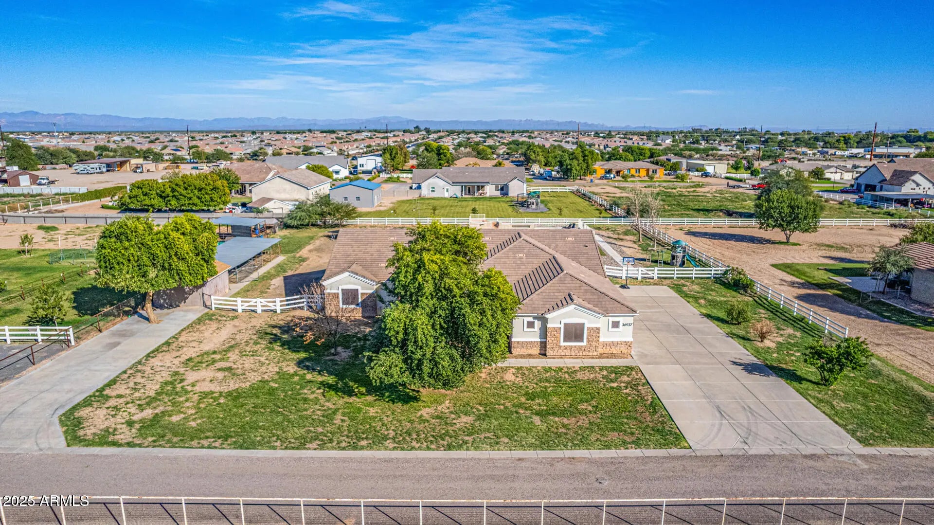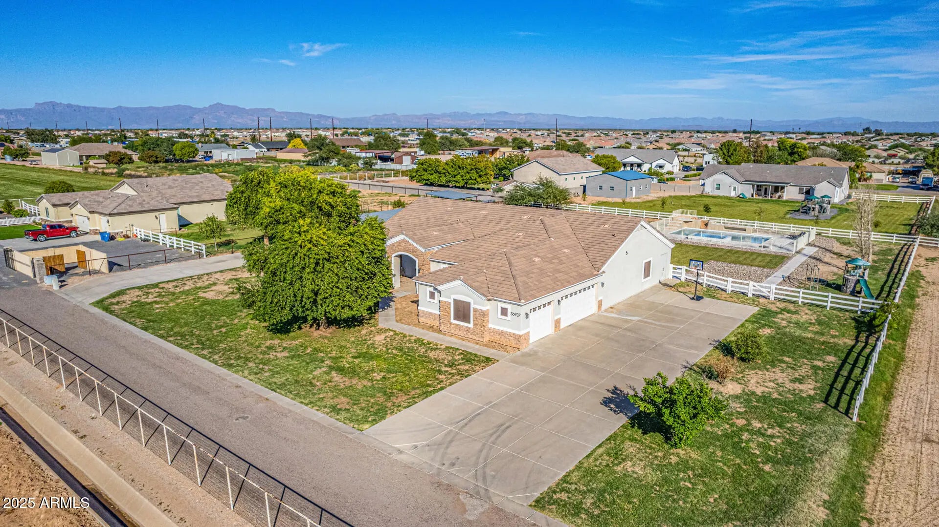 Experience luxury desert living at its finest on this 1.25-acre lot of irrigated horse property, in the heart of San Tan Valley with NO HOA. Designed for those who expect more, this extraordinary custom home showcases 6 generously sized bedrooms, all with large walk-in closets. Additionally, this phenomenal property has 3.5 bathrooms, a spacious basement, multiple large hallway closets, 8 ft doors and over 4,800 sq. ft. of beautifully crafted living space. The basement is 1,723 sq. ft. featuring 3 bedrooms, 1 full bathroom, a large recreation/game room, a cute under-the-stairs playroom and an 11 X 7 sq. ft. storage room perfect for crafts, holiday décor, food storage, etc. The ground floor is 3,099 sq. ft. which includes the owner's suite, 2 additional bedrooms (one of these bedrooms closet has a rock climbing wall that leads you up to an adorable little playroom loft), full hallway bath, half bath, spacious laundry room, great room and a significant flex space perfect for a home office, den, game room, formal living room, etc. The resort-style backyard, which was recently installed in 2025, features a sparkling pool, water slide, larger elevated spa, exterior lighting, covered patio with stunning travertine decking and a beautiful landscape surrounded by open skies, mountain views and spectacular sunsets. Equestrian and animal lovers will be captivated by the exceptional setup: 3 covered horse stalls with electricity and cooling fans, plus two additional animal enclosures ideal for goats, sheep, chickens, or other livestock. Hobbyists and professionals will enjoy the 20 x 20 concrete workshop with full electrical. With an oversized 3-car garage and 2 long driveways, there is ample room for vehicles, boats, trailers, gear and all the toys. Every inch of this estate is designed for comfort, function, and elevated living offering unparalleled freedom and versatility with no HOA restrictions. This is more than a property; it's a lifestyle sanctuary where luxury meets wide-open possibilities. (see attached floorplans)