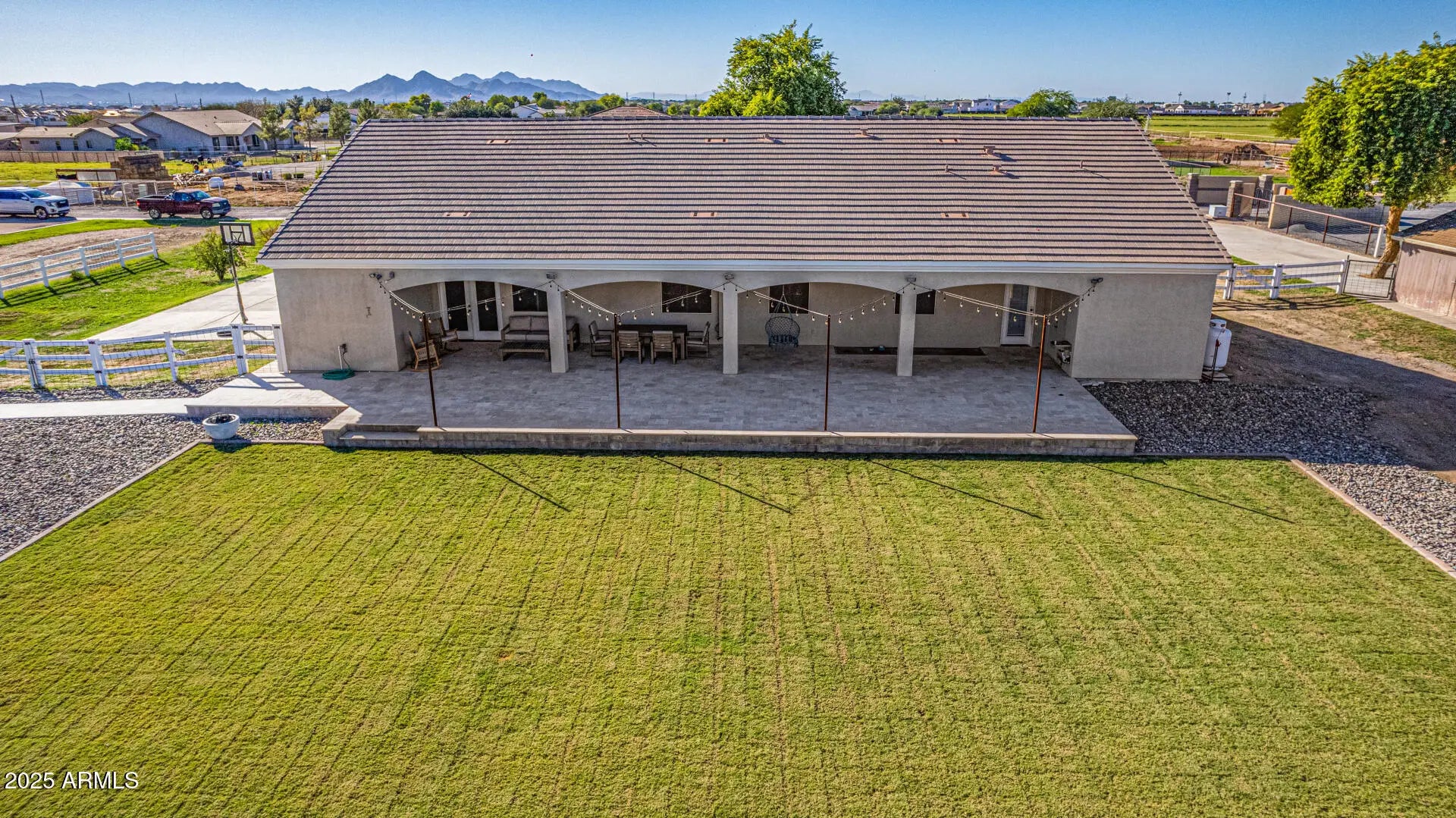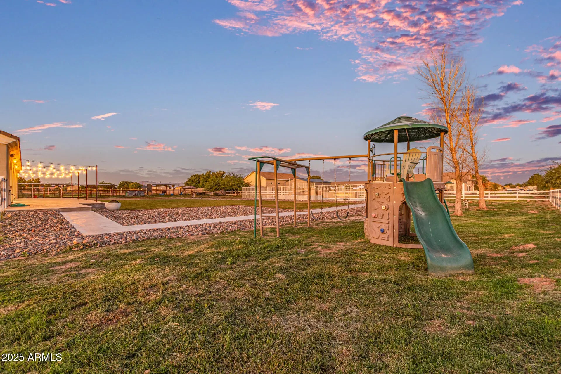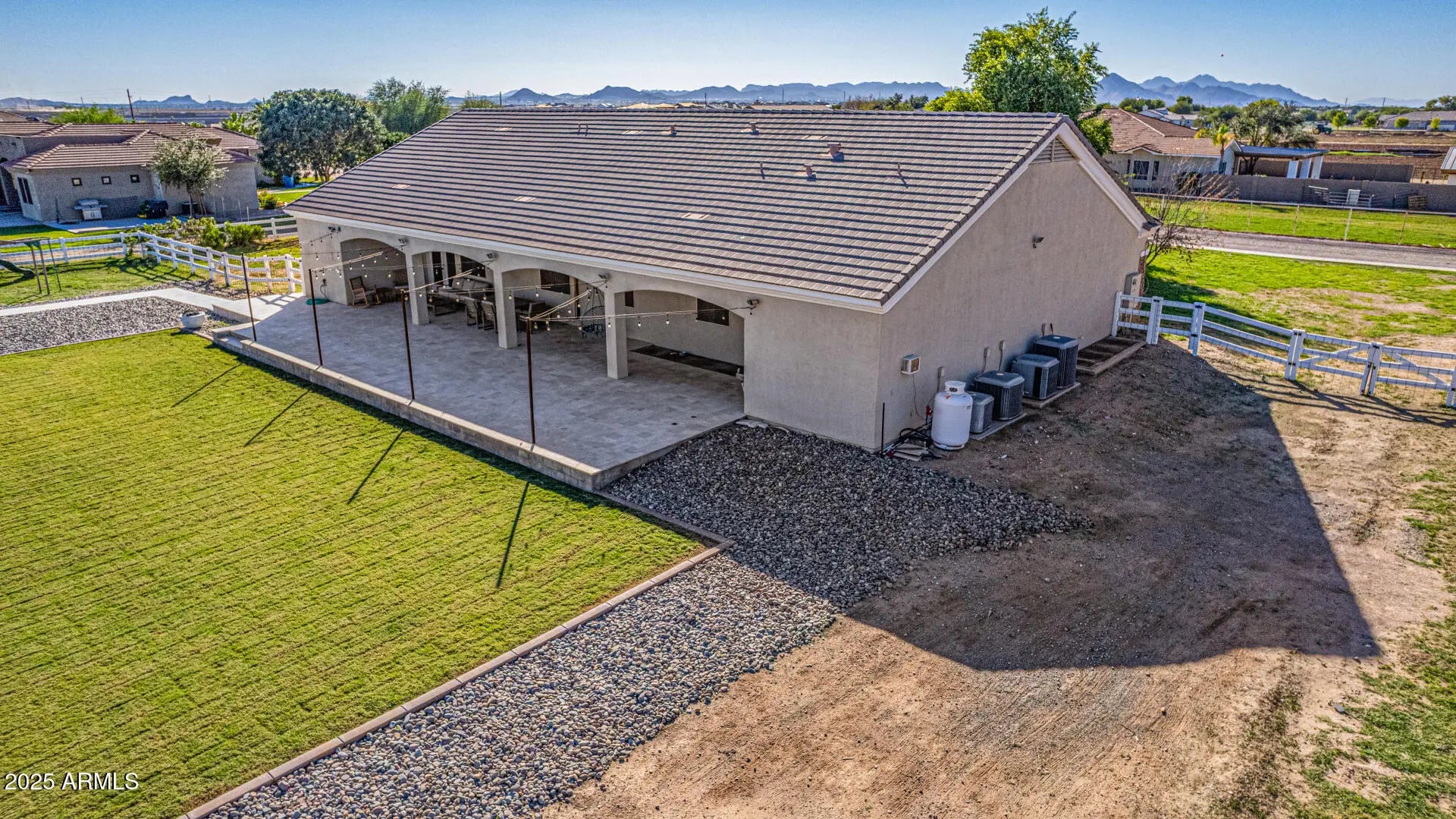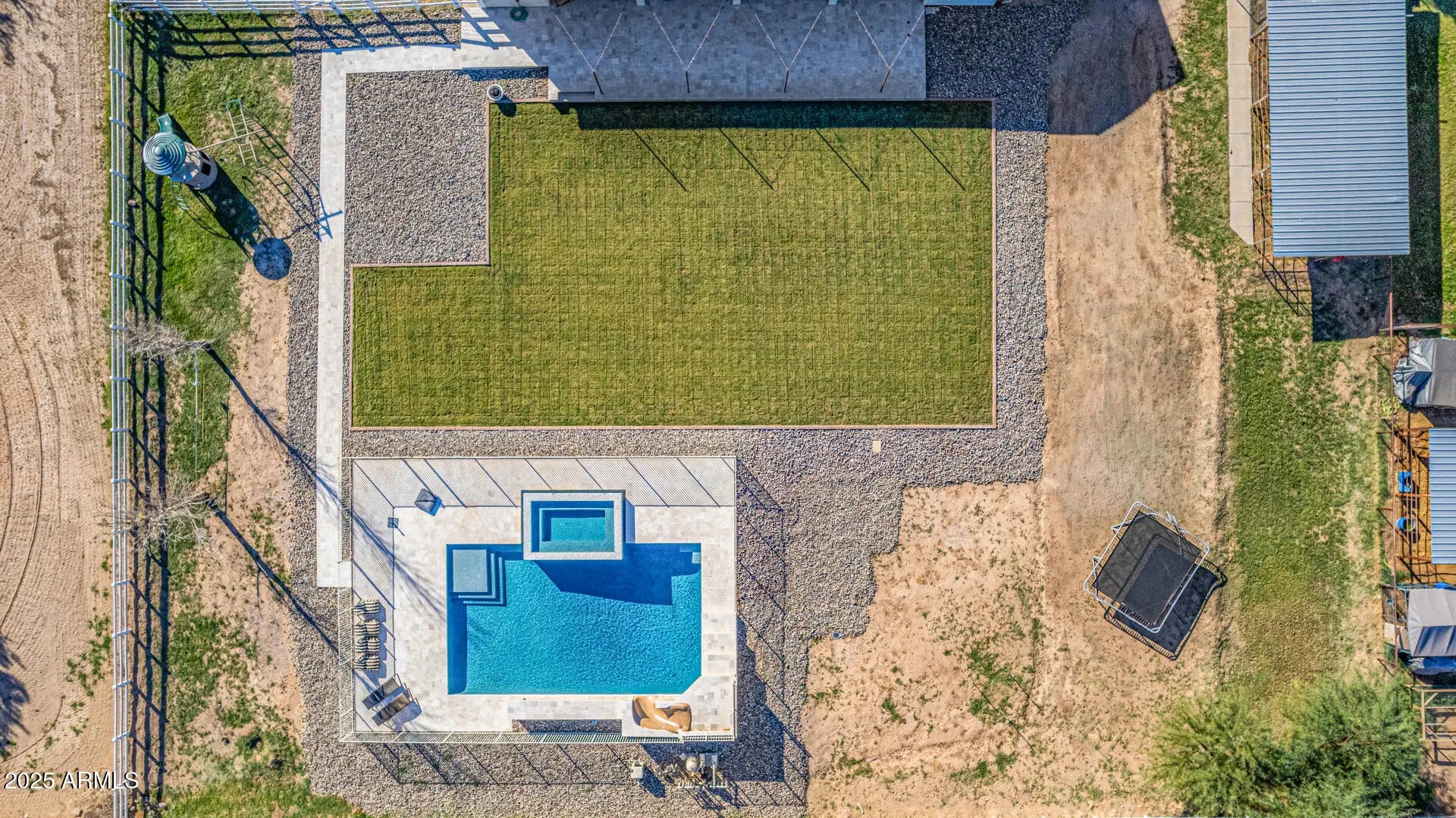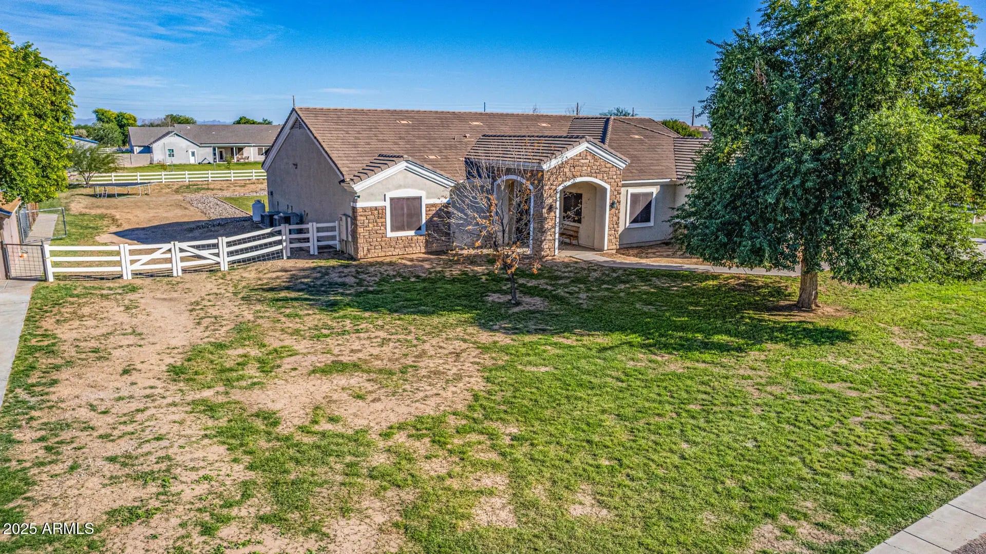 Experience luxury desert living at its finest on this 1.25-acre lot of irrigated horse property, in the heart of San Tan Valley with NO HOA. Designed for those who expect more, this extraordinary custom home showcases 6 generously sized bedrooms, all with large walk-in closets. Additionally, this phenomenal property has 3.5 bathrooms, a spacious basement, multiple large hallway closets, 8 ft doors and over 4,800 sq. ft. of beautifully crafted living space. The basement is 1,723 sq. ft. featuring 3 bedrooms, 1 full bathroom, a large recreation/game room, a cute under-the-stairs playroom and an 11 X 7 sq. ft. storage room perfect for crafts, holiday décor, food storage, etc. The ground floor is 3,099 sq. ft. which includes the owner's suite, 2 additional bedrooms (one of these bedrooms closet has a rock climbing wall that leads you up to an adorable little playroom loft), full hallway bath, half bath, spacious laundry room, great room and a significant flex space perfect for a home office, den, game room, formal living room, etc. The resort-style backyard, which was recently installed in 2025, features a sparkling pool, water slide, larger elevated spa, exterior lighting, covered patio with stunning travertine decking and a beautiful landscape surrounded by open skies, mountain views and spectacular sunsets. Equestrian and animal lovers will be captivated by the exceptional setup: 3 covered horse stalls with electricity and cooling fans, plus two additional animal enclosures ideal for goats, sheep, chickens, or other livestock. Hobbyists and professionals will enjoy the 20 x 20 concrete workshop with full electrical. With an oversized 3-car garage and 2 long driveways, there is ample room for vehicles, boats, trailers, gear and all the toys. Every inch of this estate is designed for comfort, function, and elevated living offering unparalleled freedom and versatility with no HOA restrictions. This is more than a property; it's a lifestyle sanctuary where luxury meets wide-open possibilities. (see attached floorplans)