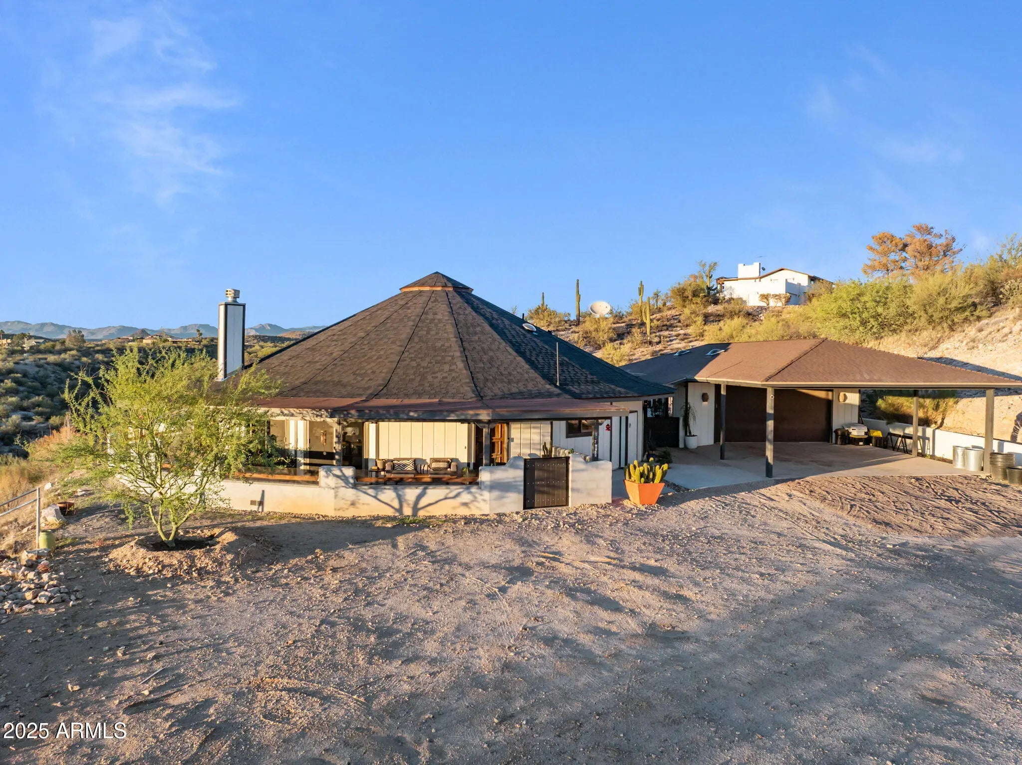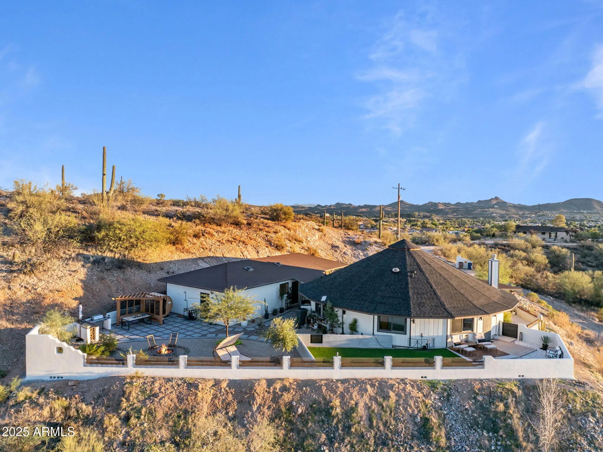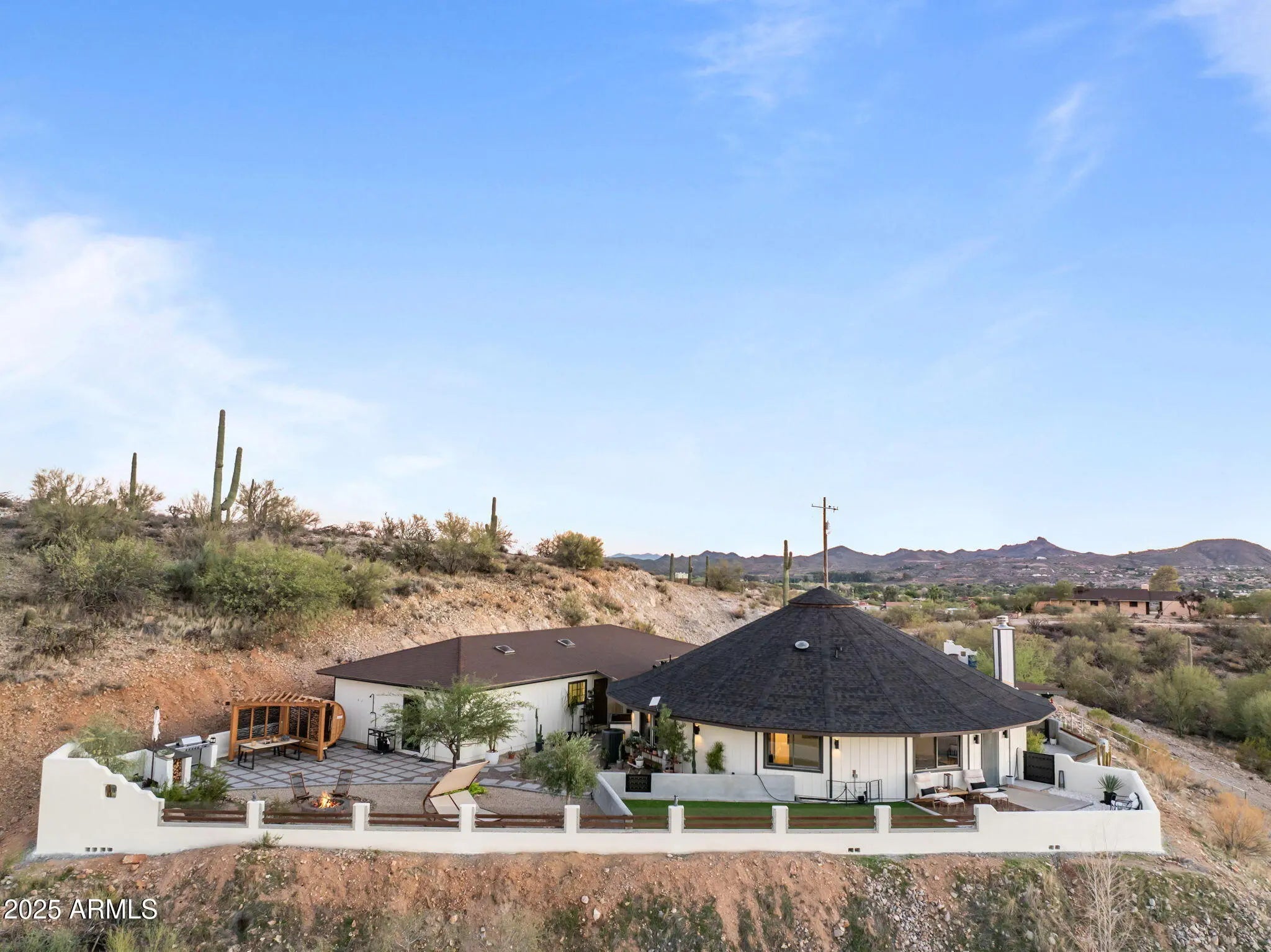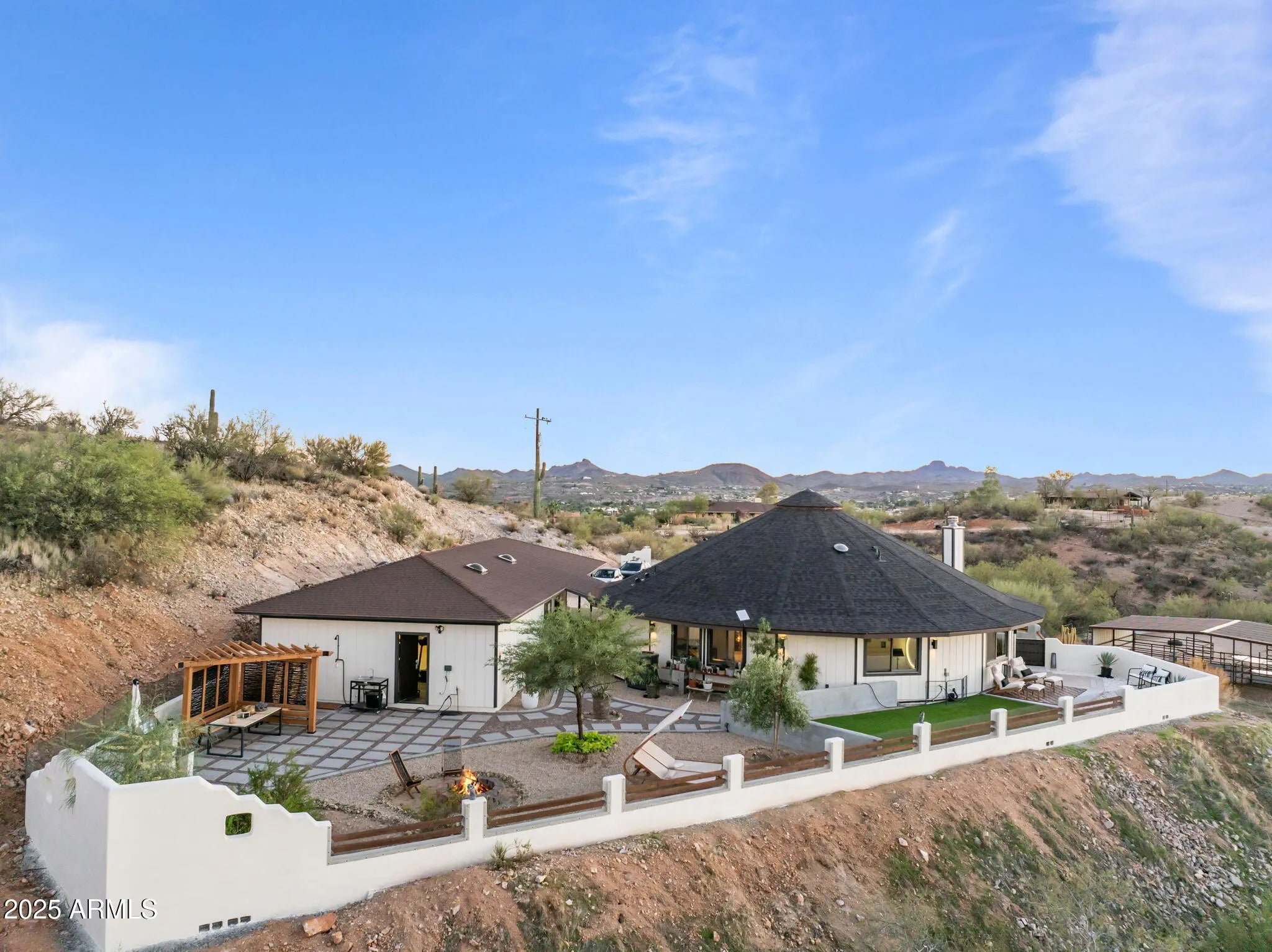 Experience the freedom of riding your horse straight off this stunning 2.1-acre property in Wickenburg, with direct access to the Hassayampa River, allowing you to ride down to Rancho Rio and its roping arena! This fully remodeled octagon-style home features modern upgrades and has undergone a thorough inspection and renovation, ensuring quality from top to bottom. A structural engineering assessment confirmed that only the outer perimeter walls are load-bearing, providing peace of mind. Enjoy the benefits of a new roof and a 5-ton HVAC system, both installed by licensed contractors and backed by warranties. The air ducts have been professionally cleaned, and the floors have been refinished with polished, sanitized, and sealed concrete. The private well has also been inspected and upgraded with a new pump box, which comes with a warranty. The home boasts all-new stainless steel appliances, including a refrigerator, range, microwave, dishwasher, water heater, washer, and dryer. The detached garage includes an additional refrigerator and freezer that will convey with the sale, along with a premium water filtration and softener system featuring UV sanitization. Inside, you'll find a complete update with new lighting, ceiling fans, recessed lights, door hardware, baseboards, and smoke/CO detectors. The original hardwood cabinets and doors have been beautifully refinished. Both bathrooms have been fully remodeledthe primary bath features slate tile and a custom poured concrete dual sink, while the guest bath showcases travertine and a granite vanity. The kitchen remodel includes granite countertops, a farmhouse sink, a rolling island, new plumbing fixtures, a garbage disposal, and a drinking water dispenser. The living room features a niche wall with built-in museum lighting and an electric fireplace. Exterior upgrades include fresh Dunn Edwards Evershield paint for both the home and garage, along with premium interior paint throughout (color information and extra paint are included). The septic system was inspected and pumped in August 2024. Step outside to enjoy a transformed backyard with new block fencing, turf, a front gated entry, and professional landscaping featuring marble and granite stonework, XL pavers, and four mature irrigated trees. The entire yard and fencing are rattlesnake-proofed, with a warranty from a licensed contractor. Relax under the pergola, which includes an outdoor counter, grill, shower/sink, and a 2-month-old sauna that transfers with the sale. Solar pathway and fence lights, potted plants, and turf cleaning service are also included. The garage/workshop comes equipped with a 100-amp subpanel, installed by a licensed contractor, along with shelving and gym flooring. The horse corral area has water access and is ready for electrical hookup. This exceptional property combines thoughtful craftsmanship, energy efficiency, and western charm, making it perfect for both year-round living or seasonal enjoyment in Wickenburg!