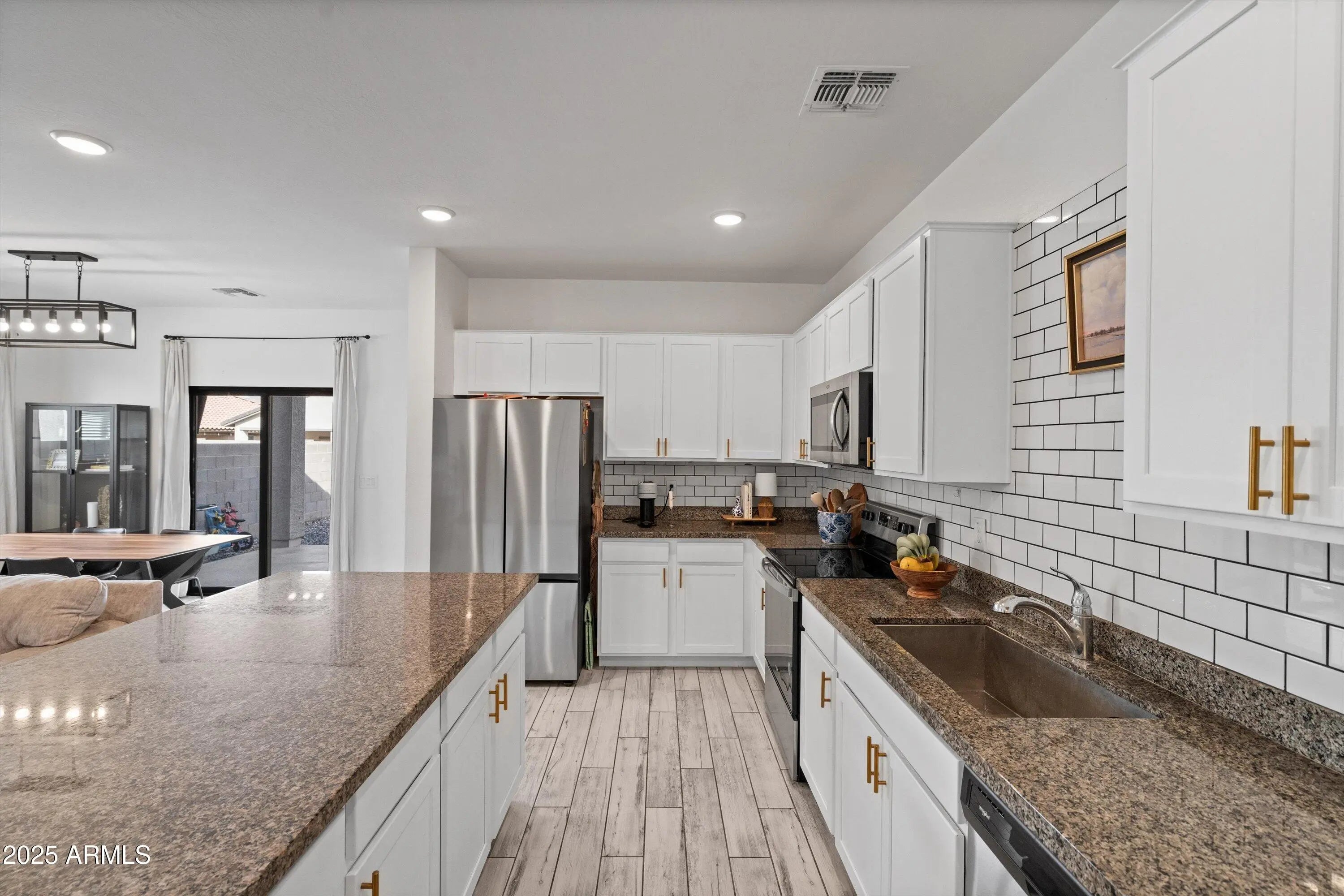 Welcome to this stunning 3-bedroom, 2-bath home built in 2022, offering the perfect mix of comfort and modern style. Step inside to a bright and open floor plan that's ideal for entertaining, featuring a beautiful kitchen with white cabinetry, granite countertops, and a designer backsplash. The flexible den is perfect for a home office or can easily be converted into a fourth bedroom. Tile flooring flows throughout the main living areas, while the bedrooms feature durable vinyl flooring installed in 2023 for a seamless, carpet-free look. The backyard offers low-maintenance gravel landscaping with paver accents, ready for your personal touch. Located in a fast-growing, family-friendly community close to schools, parks, and shopping!