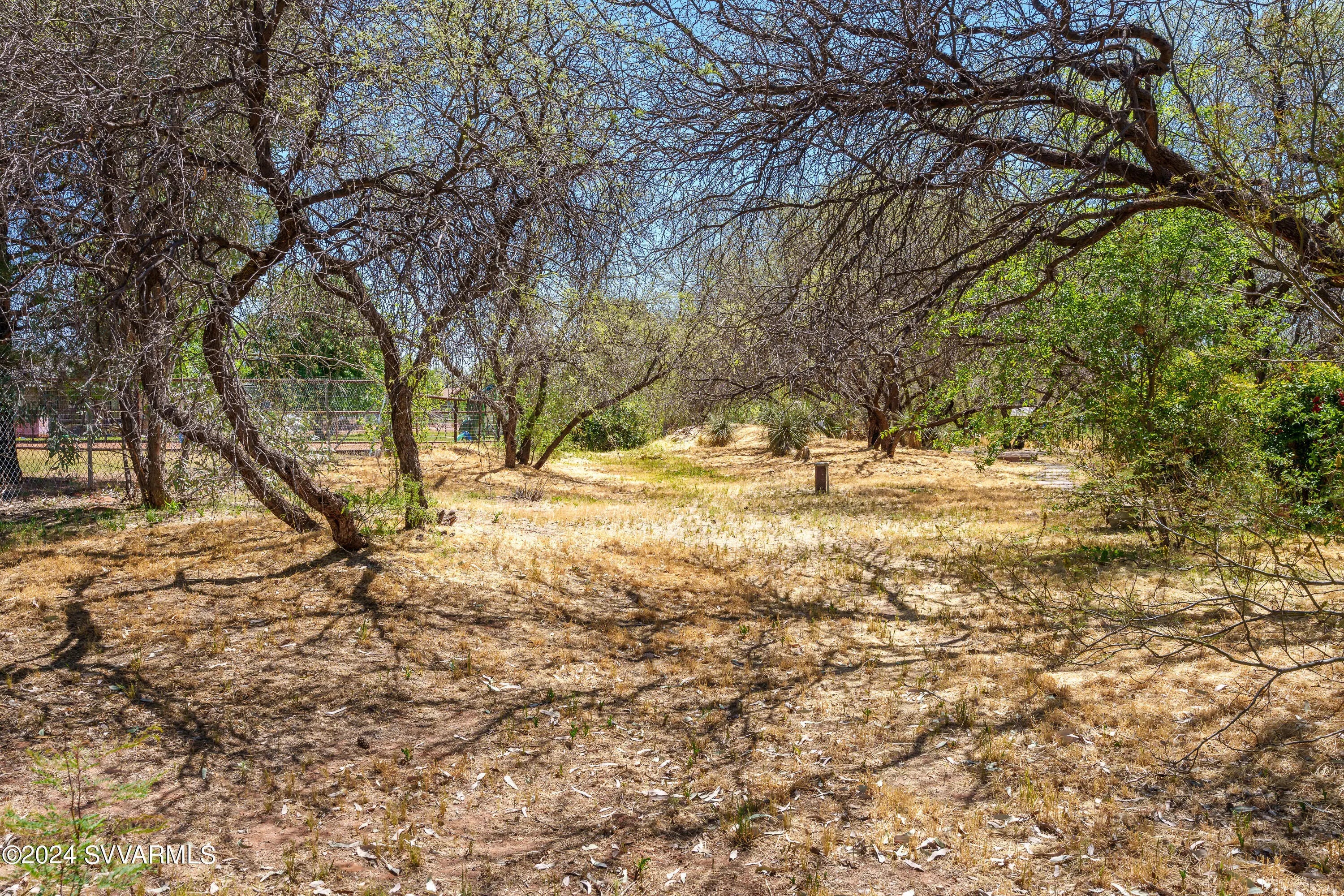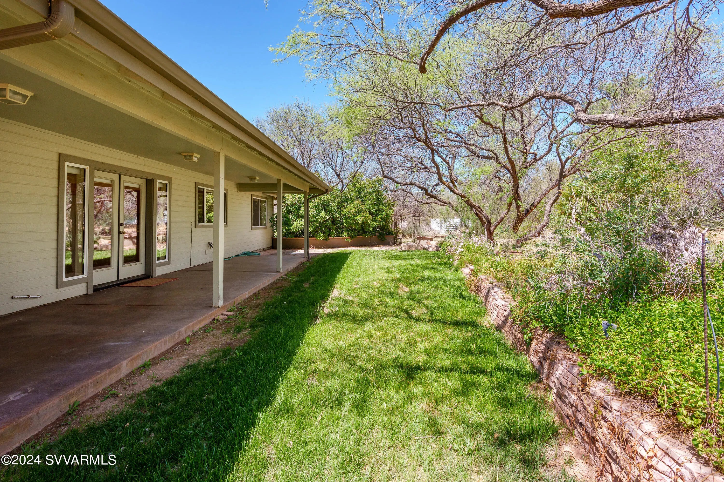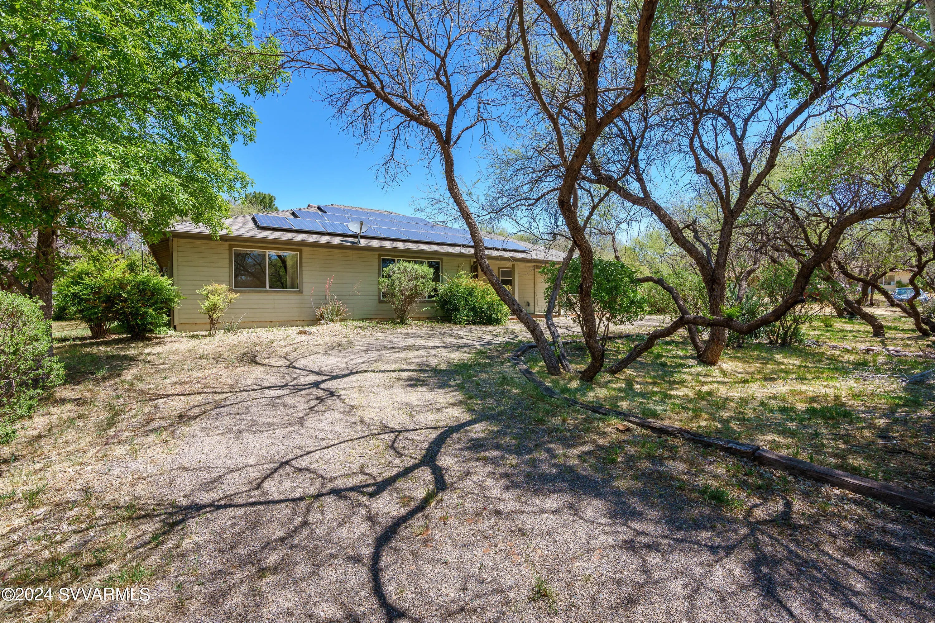 This lovely home is located in a desirable area of Camp Verde. The home is surrounded by mature mesquite trees, and interesting landscape which includes flagstone walkways and patios, and a screened-in porch adjoining an aromatic rose garden. A master gardener would have a field day with this lot! The floorplan is split with a potential for two master suites with a Jack and Jill bathroom arrangement for a secondary bedroom. The large kitchen has not one, but two pantries. The massive utility room has lots of cabinets. French doors from the dining room open to a nice covered patio. The great room has cathedral ceilings. The oversized garage contains a sink, and the home has solar panels to reduce your electric bills. Come put your personal touches on this wonderful home.