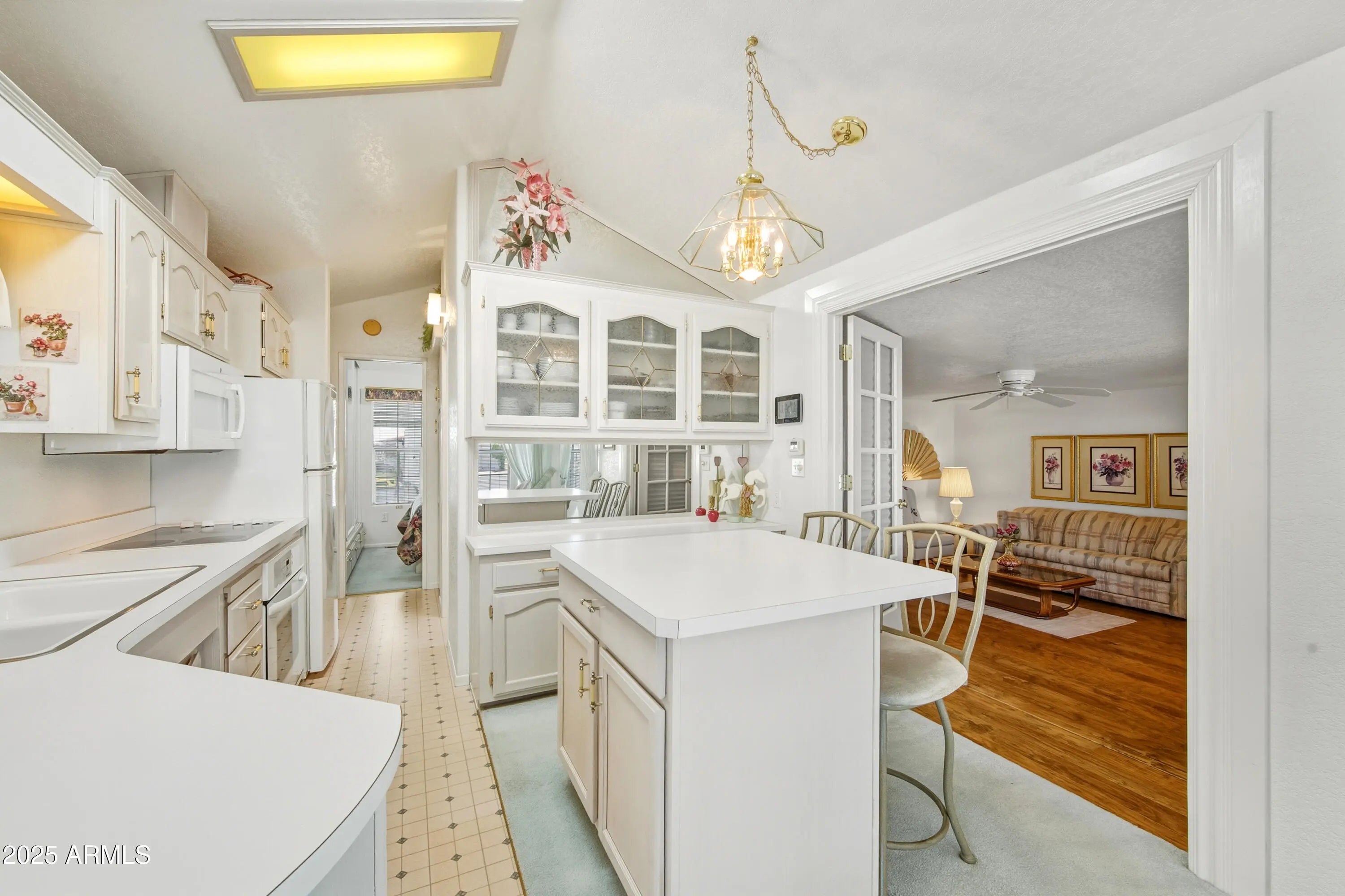 Fully furnished and full of charm, this 1997 Hallmark Alexa sits on two covered lots directly across from the clubhouse—no front neighbor, just sunshine and convenience! Enjoy a well-equipped kitchen, pantry with pull out drawers, Bathroom with dual access, and cozy master bedroom. The Arizona Room adds space, privacy, and its own bath, while a bonus room with closet is perfect for TV time or hobbies. Full laundry room, loads of storage, and a front porch made for sunsets and cocktails. Parking on both sides, workshop with tools, and golf cart included. New roof (2025), A/C (2019), and newer water heater. Move-in ready! Caliente Casa de Sol has lots of ammenities, Pickleball, Horseshoes, Woodworking, Ceramics, Workout Room, Clubhouse, Annex Building, lots of activites, dinners and much more!!