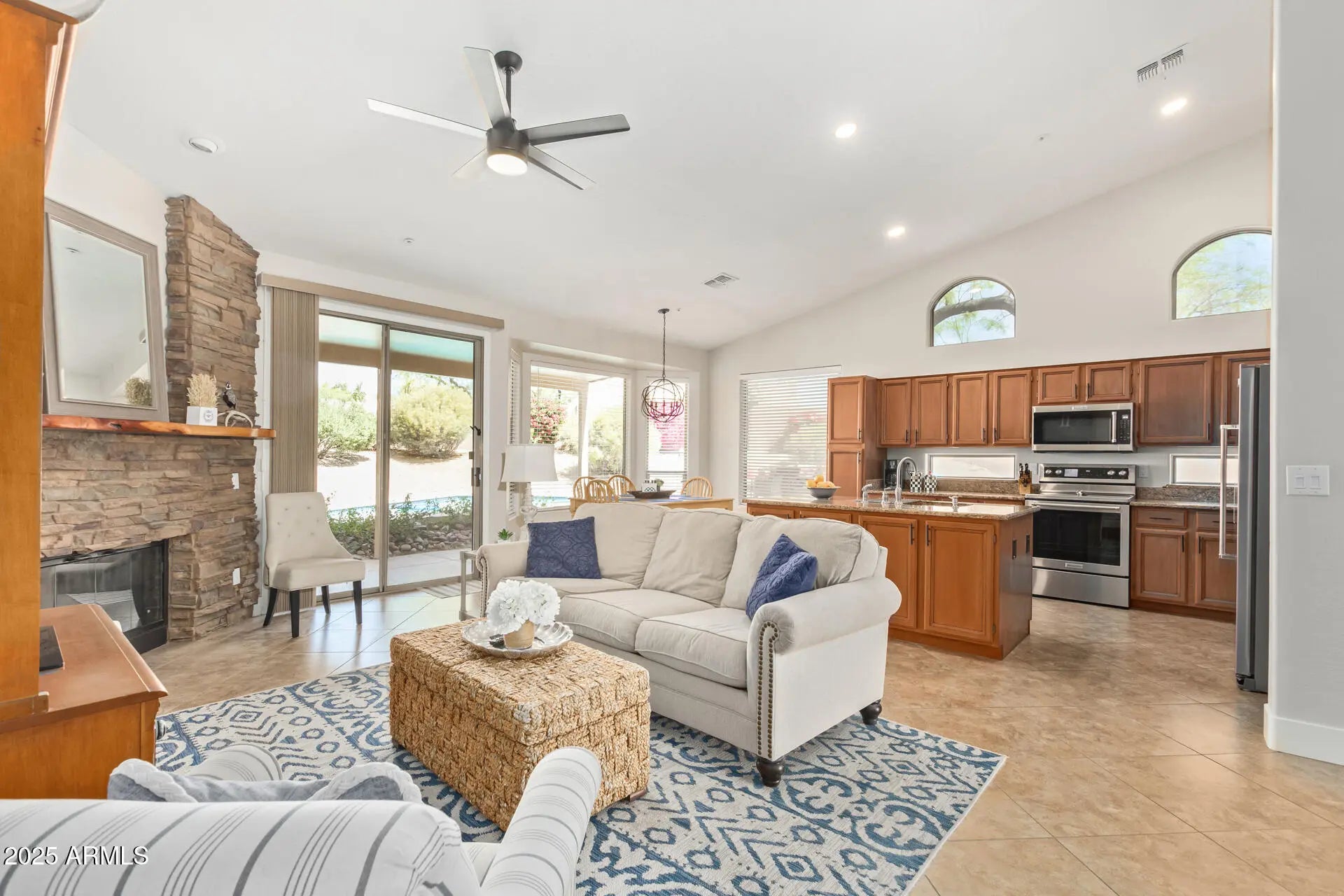 This gorgeous property sits on over a quarter acre featuring a spacious 3-car garage. Explore inside to discover fabulous living & dining areas offering vaulted ceilings, neutral tile floor, & bountiful natural light. Stone fireplace in the family room! The beautiful kitchen boasts wood cabinetry, granite counters, new Kitchen Aid SS appliances, backsplash windows, LED lighting, & a center island. Fiber optics throughout. Double doors open to the main retreat showcasing plush carpet, a private bathroom with granite dual sinks, a walk-in closet, & direct access to the back patio. Enjoy relaxing along with your loved ones in the wonderful backyard including a covered patio, a refreshing blue pool. Pool/Lanscaping included in lease price. Pool fence installed. HOA included in lease price