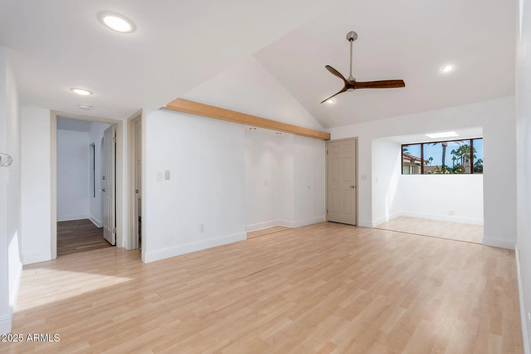 This amazing townhouse offers villa-style living within The Racquet Club; a gated community featuring resort-style amenities. The home showcases a dual primary bedroom floor plan with an upstairs entrance through a spacious front patio—perfect for relaxing or entertaining. Inside, the kitchen boasts dark wood cabinetry, stainless steel appliances, and a convenient breakfast bar. Elegant vinyl-wood flooring, vaulted ceilings, and skylights create a bright, open, and airy ambiance throughout. The primary suite includes an upstairs loft that opens to a private rooftop deck—ideal for enjoying extended views or peaceful outdoor lounging. Community amenities includes clubhouse, swimming pool & spa, tennis courts, pickleball, fitness center and more.