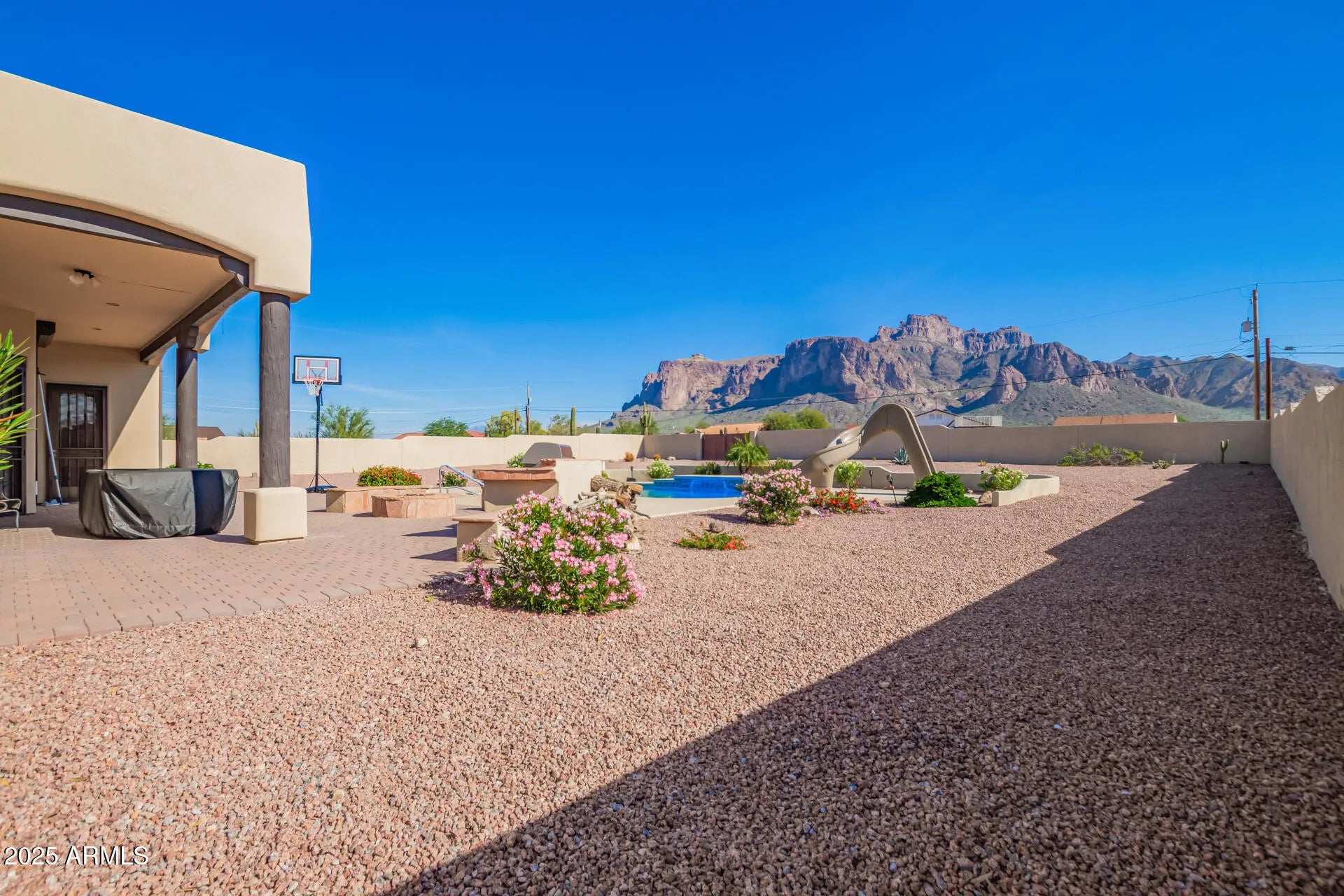 Seller offering $10,000 concessions to buyer for closing costs! Motivated Seller! Custom Territorial with Incredible Superstition Mountain Views with Cougar Shadow from your backyard! The beautiful residence offers 4 beds, 2.5 baths, desert landscape, excellent curb appeal, and an oversized 3-car garage w/circular paver driveway. Awesome Smooth Pebble Tech Play Pool Heated and Cooled with Custom Slide, Electronic Security Sun Screens. All Situated on a HUGE 1.14-acre lot! Interior exudes elegance with tall ceilings, abundant natural light, wood columns, Knotty Alder doors, archways, a neutral palette, tile & soft carpet throughout. Open Floor Plan with a fireplace and a media center. The impressive kitchen showcases stainless steel appliances, granite counters & backsplash, a pantry, Knotty Alder cabinetry, recessed & pendant lighting, curved island w/breakfast bar large owner's suite has patio access and a spa-like bathroom with dual granite sinks, a jetted tub, a tiled shower, & a custom walk-in closet. Double-door 4th bedroom can be an office. Laundry room with a sink & storage closet. But the true highlight is the expansive backyard oasis, perfect for relaxation and entertaining! It features an extended paver-covered patio, a built-in BBQ grill, benches, and a cozy fire pit. At its heart lies a sparkling pool with a slide, offering year-round fun. Added perks include an RV gate and a storage shed. All set against a stunning mountain backdrop that adds beauty and tranquility to the outdoor space. What's not to like? See it! Love it! Live it!