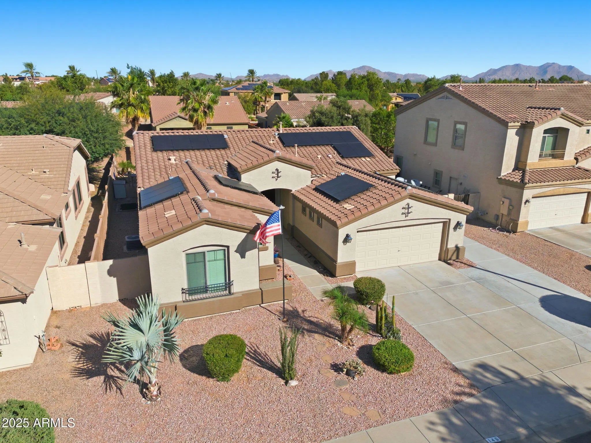 FREE SOLAR, SELLER WILL PAY OFF SOLAR LEASE AT CLOSING! You get the savings at no cost. This Arizona backyard will put a smile on your face! Sparkling heated pool, Spa/jacuzzi, built-in Gas BBQ, covered patio with misting system, and resort-style landscaping. You'll be in one of Casa Grande's most attractive neighborhoods - Villago - featuring a lake, fountains, walking/bike trails, lush greenery, and desert beauty. This 4-bedroom home has no carpet, except in the 3 guest bedrooms - any of which could be a perfect office. The split primary suite includes a separate tub and shower, private toilet room, and large walk-in closet. Guest bath has double sinks and a walk-in shower. Upgrades include new kitchen appliances, Nest thermostat, and new flooring in the living and primary bedrooms.