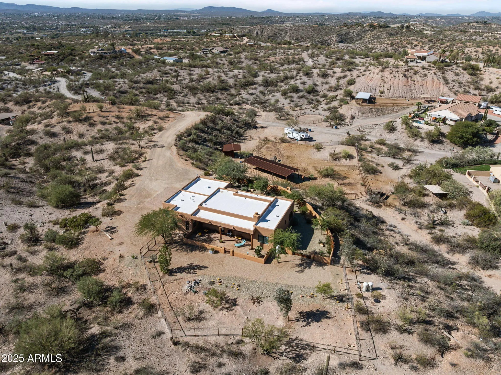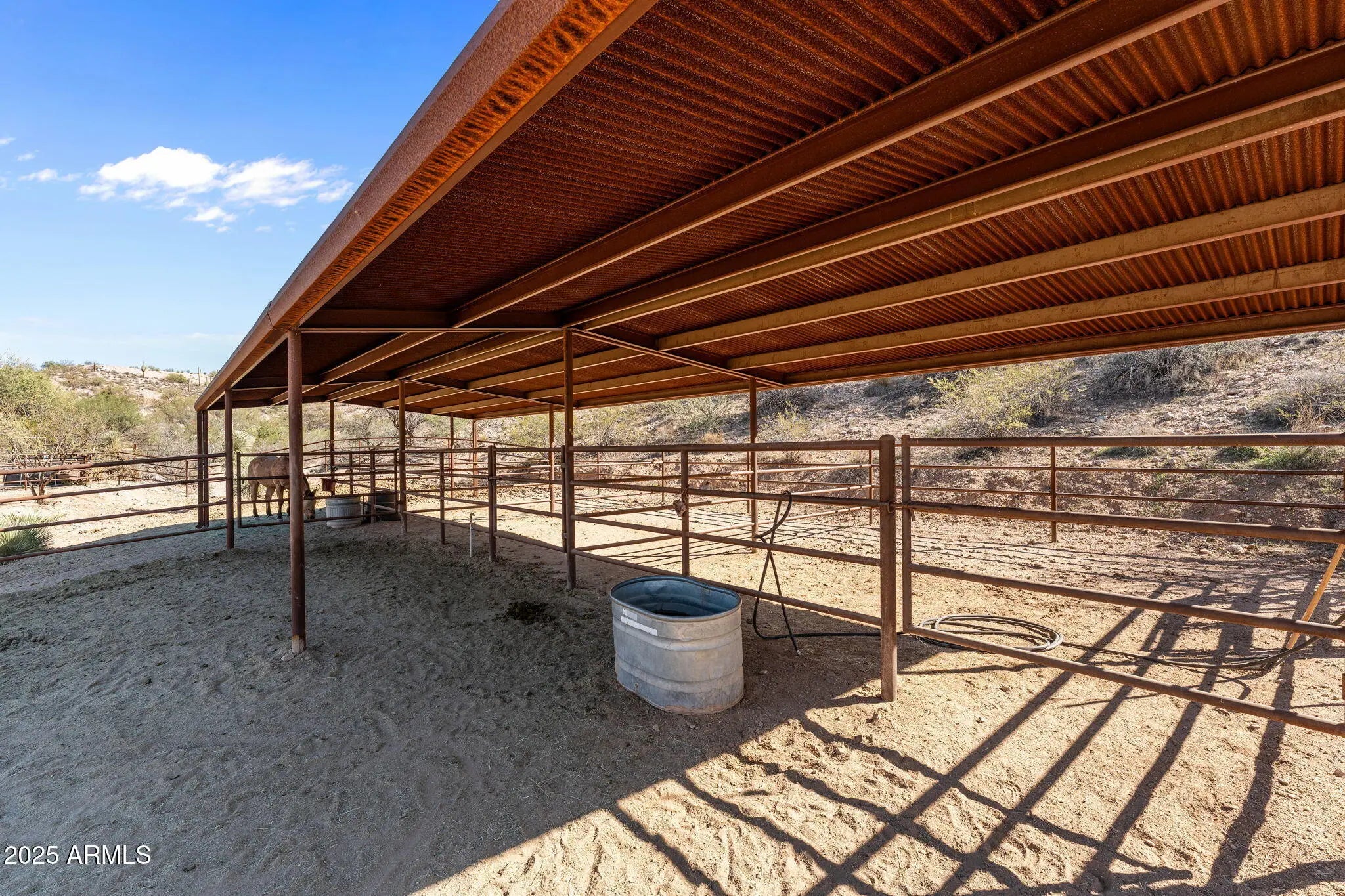 PRICE IMPROVEMENT! Beautiful 5-acre horse property surrounded by majestic saguaros and stunning desert views. Ride directly from your property to endless state land scenic trails and Rancho Rio! Features include 3 covered stalls, 2 turnouts, 4-rail pipe fencing by Grantham Fencing, covered hay storage, tack room, and hitching rail. Enjoy peaceful desert living with charming interiors, including authentic Mexican tile in both bathrooms. Perfect balance of function, comfort, and natural beauty for horse lovers seeking space, serenity, and adventure.