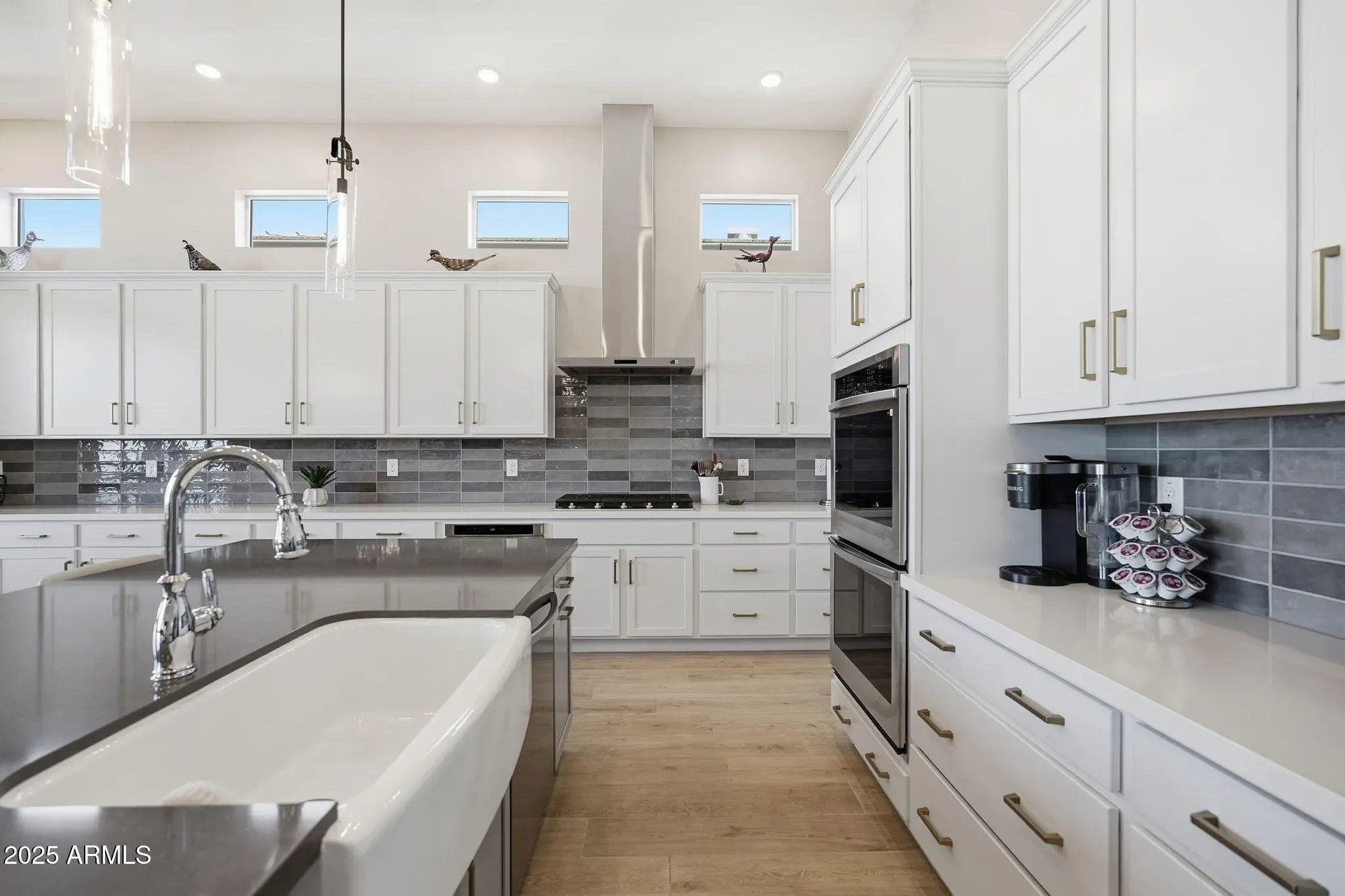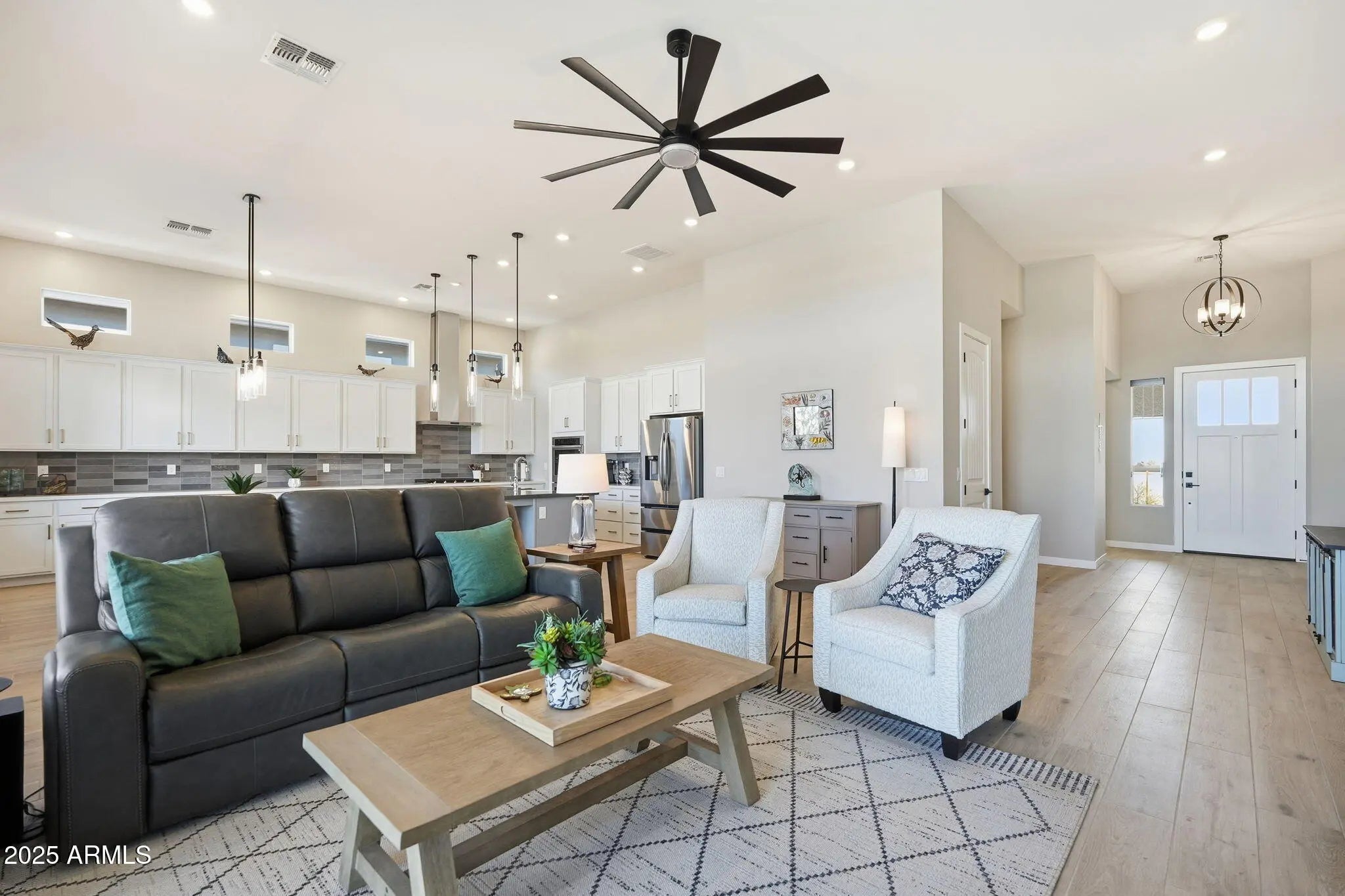 The seller's loss is your gain! Snap up this incredible one year old house complete with finished landscaping and 157k in upgrades for far less than comparable new builds are selling for! Set within a gated Peoria community, this 2024-built home combines modern style with thoughtful details designed for comfortable living. Desert landscaping and pavers in the front make a striking first impression, while gorgeous flooring flows seamlessly through open living spaces. The kitchen features custom cabinets, a large island, double ovens, Hinkley's custom lighting, and SW Blinds and Shutters throughout the home. The garage is fully equipped with epoxy flooring and A/C! Outside, two pergolas, backyard hardscaping, pavers, and low-maintenance artificial grass create the perfect space for relaxing, entertaining, or enjoying the nearby park. With a focus on both style and function, this home offers a seamless indoor-outdoor lifestyle, high-end finishes, and a location that makes everyday living effortless.