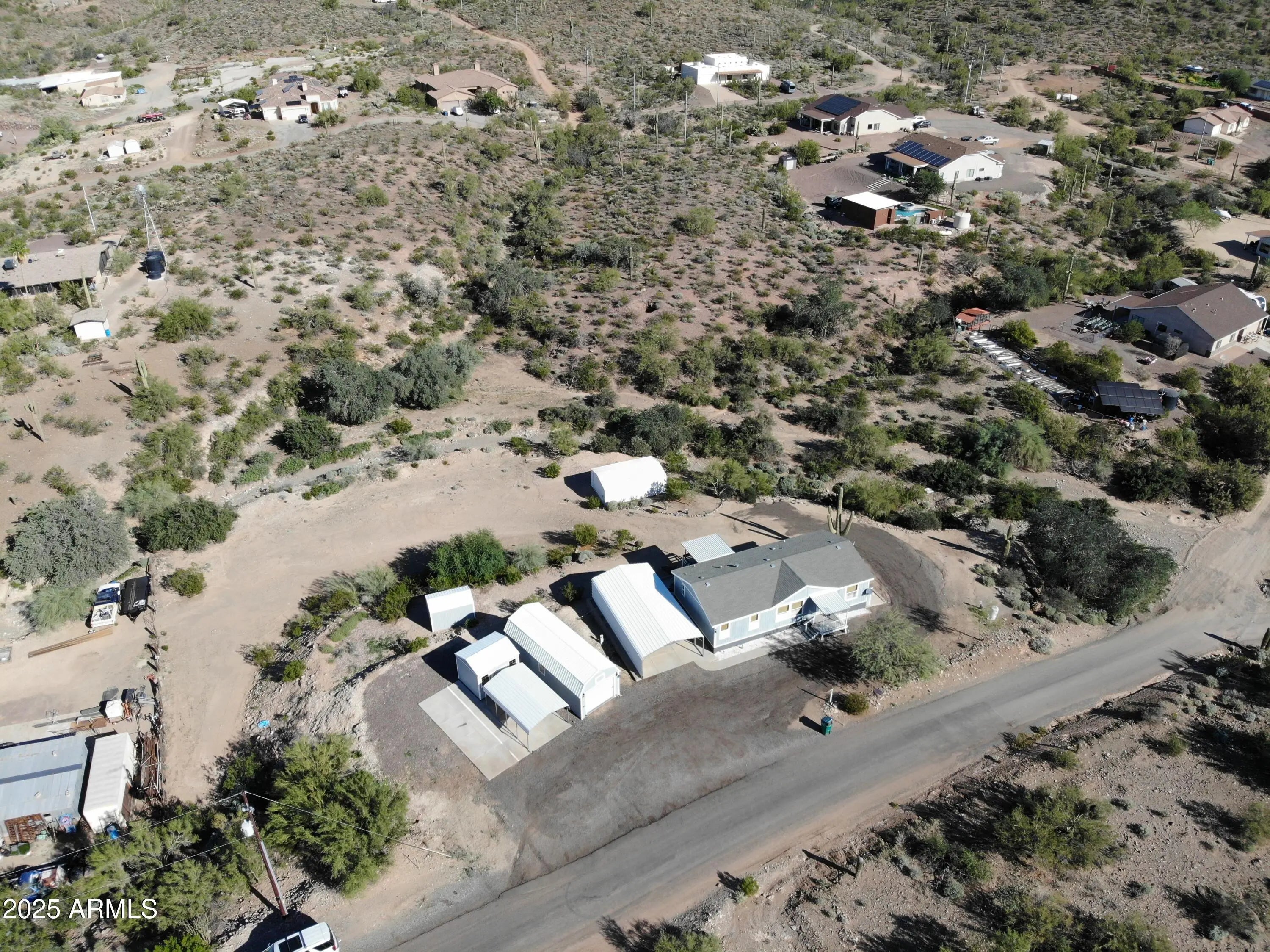 Discover unbeatable space, privacy, and panoramic scenery at this unique 3-bedroom, 2-bath home set on a 2-acre, expansive-view lot just below Gavilan Peak. This rare property offers true versatility with horse privileges, room to roam, and endless possibilities for outdoor living. Bring every toy you own—there's space for all of it. The property features seven outbuildings, including covered slab parking for at least eight vehicles, making it ideal for car collectors, RV owners, boat enthusiasts, and off-road adventurers. Whether you need workshop space, storage, or animal facilities, you'll have the freedom to create your perfect setup. Located on a paved/asphalt road, access is easy and convenient year-round, yet the setting feels peaceful and private with stunning natural surroundings and open views. This is the hard-to-find combination of land, functionality, and location you've been waiting for. Situated mid-way between Anthem and New River Road, just a few minutes from all the shopping, schools, and amenities that Anthem provides, but in a country setting. Don't miss this exceptional opportunity, properties like this don't come along often!