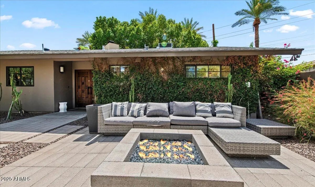 Sitting on the biggest lot in the highly coveted, prestigious Date Palm section of Arcadia, this mid-century modern home has a super cool vibe. As you arrive through the courtyard entry featuring a charming firepit, you'll appreciate the artistic ambience, and as you enter, you'll be treated to sleek, colorful design elements that create an eclectic atmosphere. The island kitchen has white custom cabinetry, chic quartz countertops and gold accents. The family room has a unique brick fireplace and floor to ceiling built-in cabinetry, the living room is another great looking space, and the bonus room is perfect for a playroom, teen room or home office. The grounds are especially beautiful with cactus gardens, an elevated pool, and a huge grassy yard offering tons of space to add on. This is a great opportunity in the Date Palm where homes are rarely for sale, and this one has endless potential!