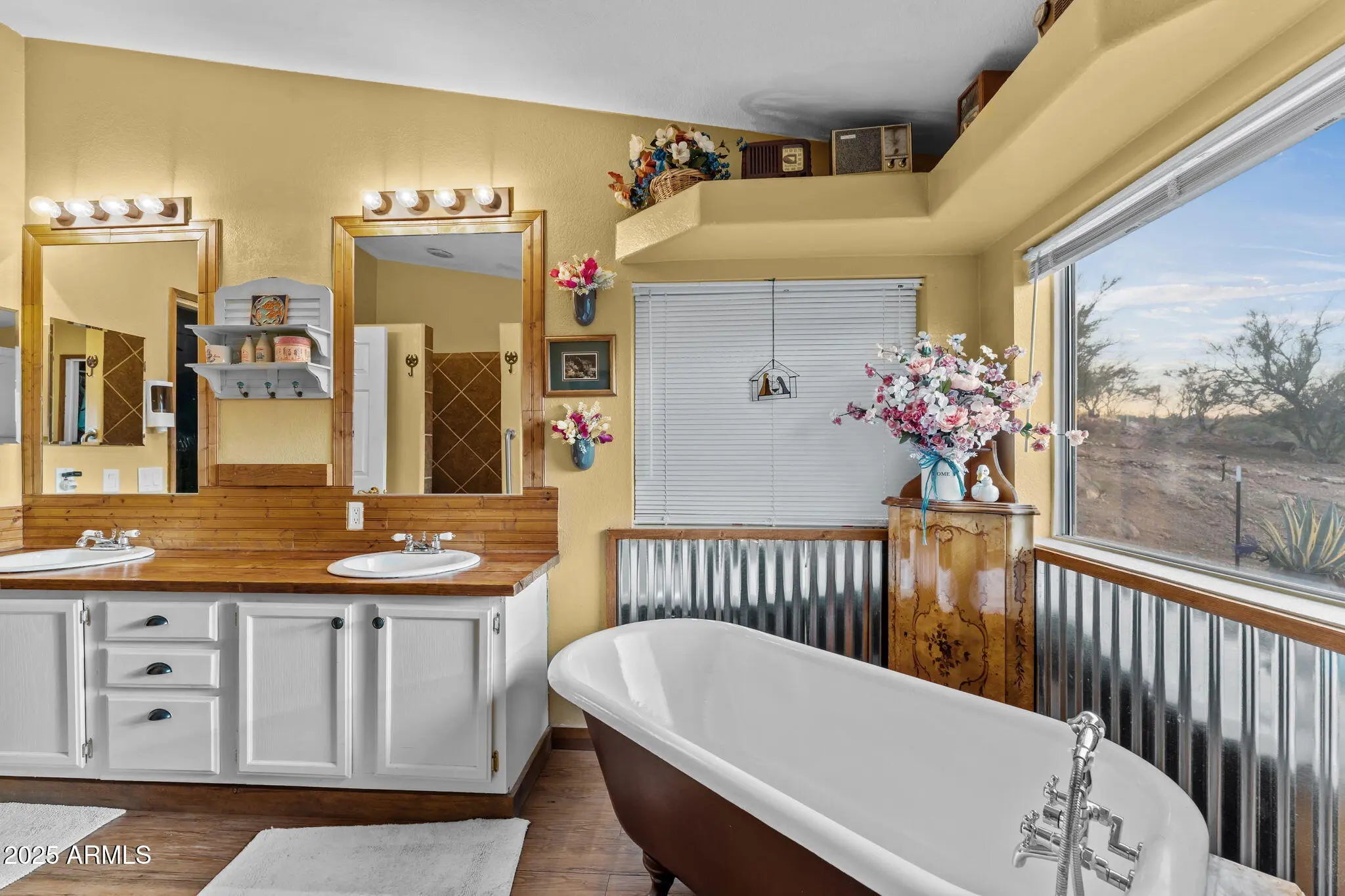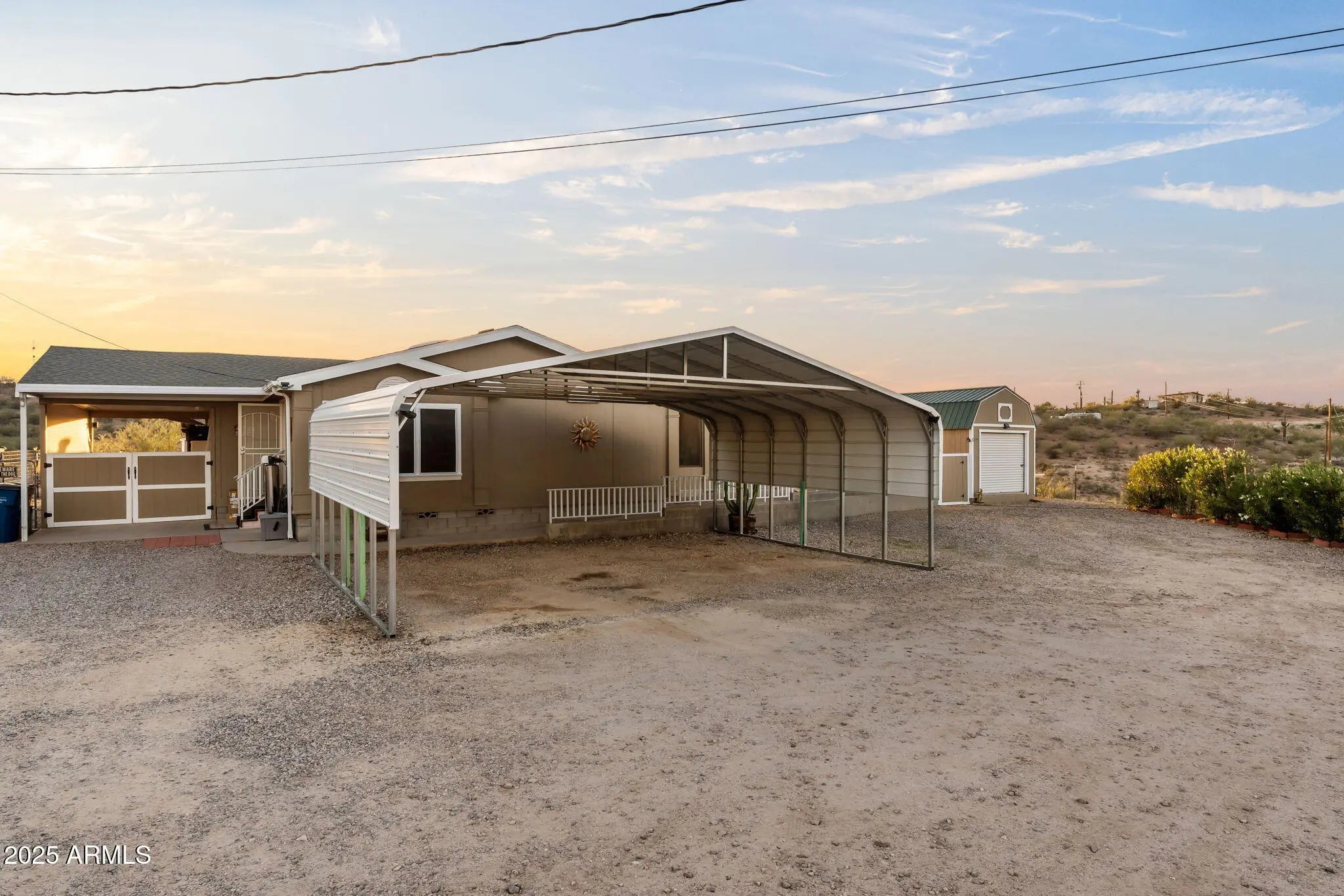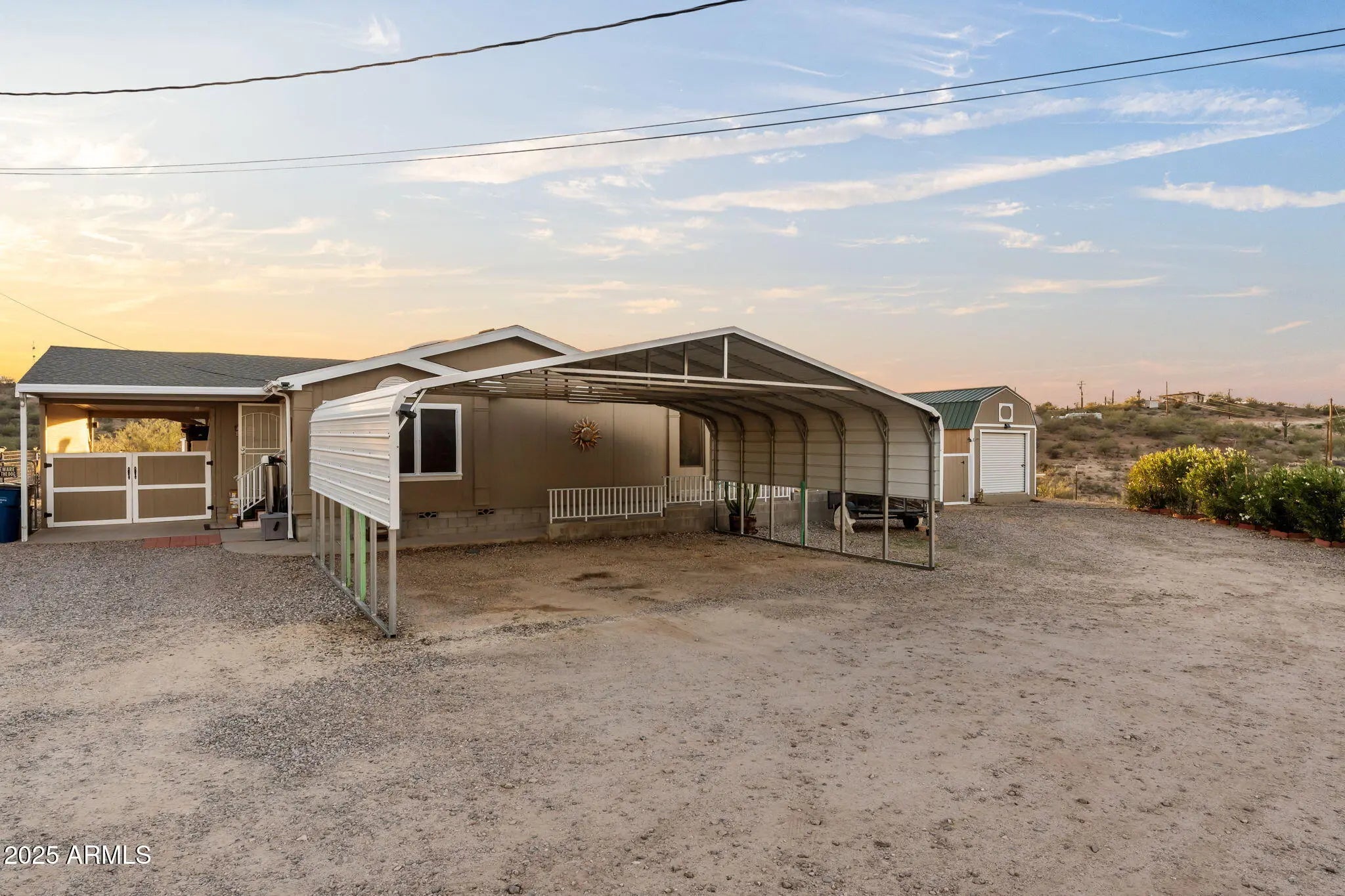 Welcome to this warm and inviting 2002 sq ft home set on 1.6 peaceful acres in the heart of Wickenburg. Bring your horses and saddle up. This property, blends comfort, charm, and wide-open desert living. Step inside to a bright, cheerful interior featuring vaulted ceilings, skylights, and laminate wood-style floors that flow throughout the main living spaces. The kitchen is light and open - perfect for everyday living or entertaining. The spacious primary suite includes a beautifully restored claw-foot soaking tub, a large walk-in closet, and a relaxing atmosphere that feels like your own private retreat. Two additional bedrooms provide flexibility for guests, an office, or hobbies. Outside, enjoy the true Arizona lifestyle. The property features fruit trees, cacti, a covered patio and porch, all spaces for taking in the views, and plenty of room to roam. With RV and car carports, storage sheds, and room for your toys, tools, or even small livestock, this property offers the versatility Wickenburg living is known for. No HOA - just open space, blue skies, and the freedom to make this charming desert home your own.