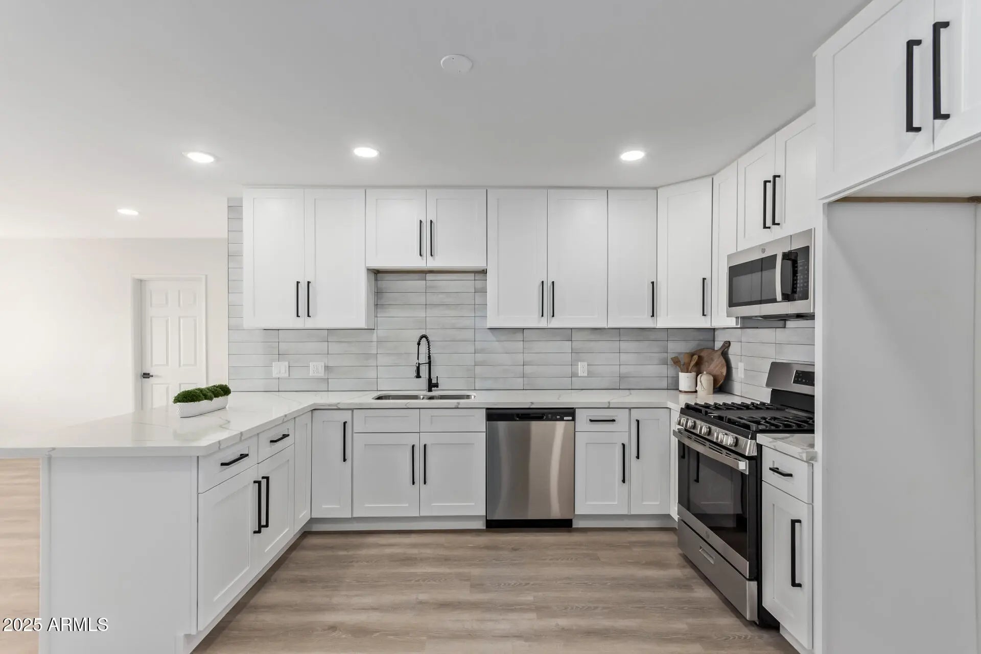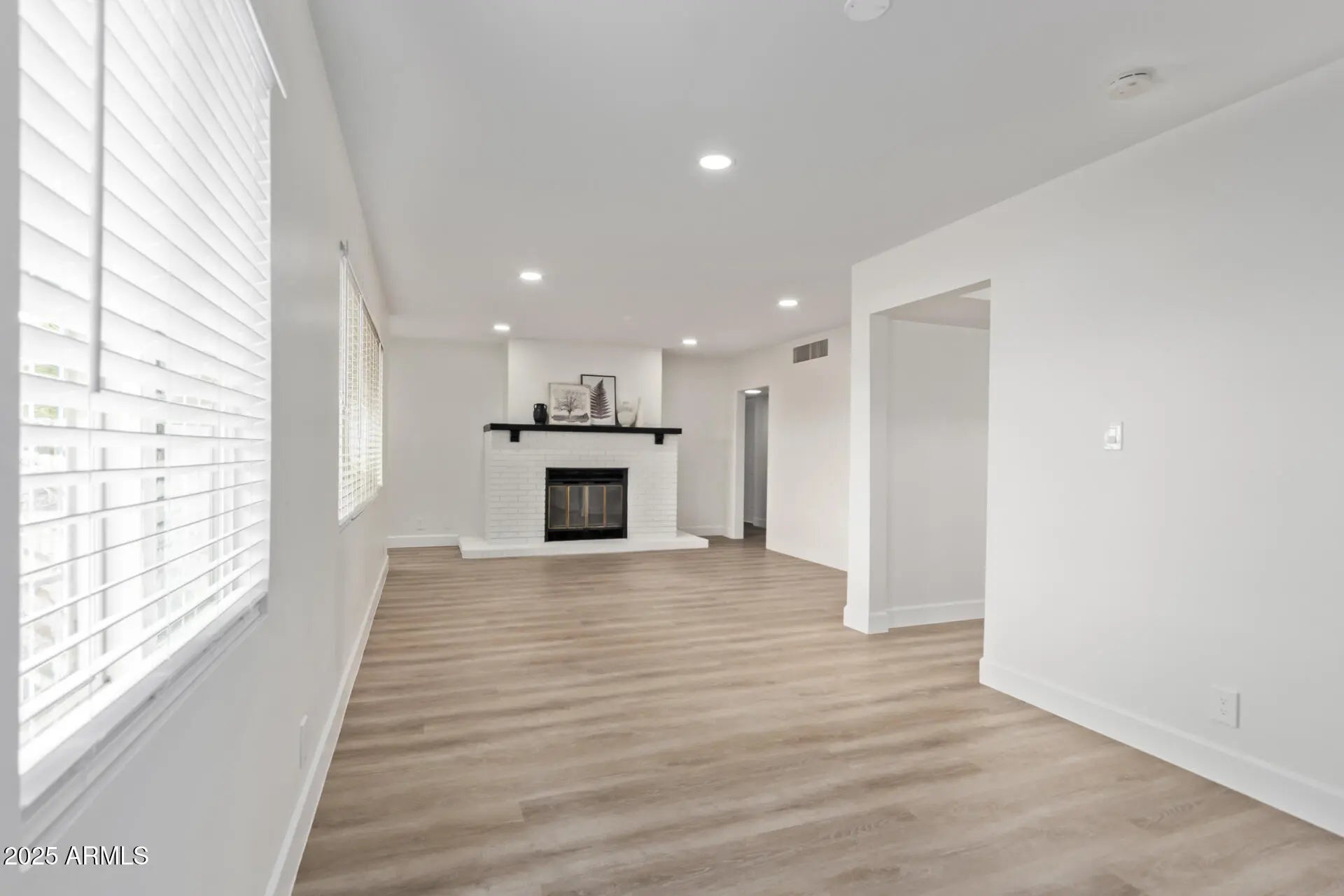 Newly remodeled home, Move-in ready! The warm & inviting living spaces showcase wood-look flooring, recessed lighting, a brick fireplace to add ambiance to your gatherings, and neutral paint that complements any décor. The pristine kitchen is ready for your culinary adventures, equipped with shaker cabinets, tile backsplash, quartz counters, and stainless steel appliances. The primary suite features a large closet and beautifully done bathroom. This home offers an AZ room perfect for entertaining or relaxing. Low maintenance backyard with artificial grass. A large storage shed, 2 car garage, and a spacious laundry room. come and see for yourself.