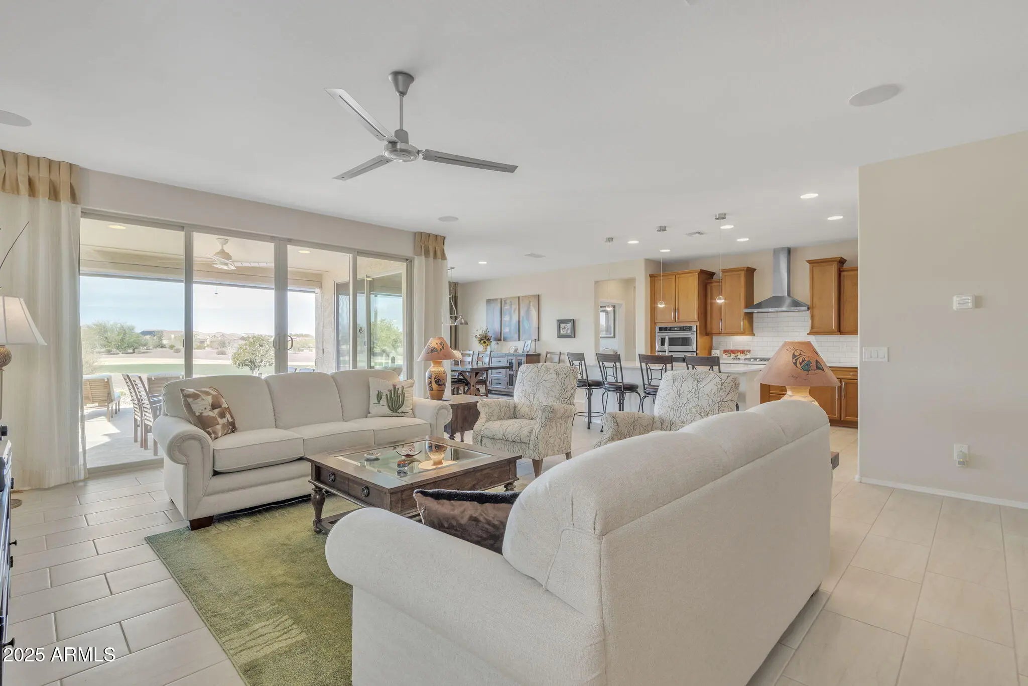 Incredible Opportunity on One of Anthem's Best Golf Lots Set on the 9th hole near the green, this beautifully maintained home offers sweeping fairway views and a layout built for easy indoor-outdoor living. From peaceful mornings to golden hour evenings, the covered patio and in-ground hot tub are perfect spots to take in the view while golfers roll in. Inside, a wall of oversized windows and multi-panel sliding glass doors fill the home with natural light. The gourmet kitchen features a spacious island, gas cooktop, stainless steel appliances, and walk-in pantry, all thoughtfully placed to enjoy the stunning backdrop. The open concept layout flows seamlessly from the kitchen into the dining and living areas. The split bedroom floor plan adds extra privacy. The spacious primary suite features dual sinks, a tiled walk-in shower, and a generous closet. A separate den or home office adds flexibility, and the inviting front courtyard offers an additional space to relax or entertain. " Solar lease is 100% paid for long-term energy savings " Unforgettable sunsets from your private In-ground hot tub " Home is sold fully furnished, including all décor and appliances " Premium golf views and move-in convenience Enjoy world-class amenities in Sun City Anthem at Merrill Ranch, a vibrant 55+ community offering championship golf, a 48,000 sq. ft. rec center, pools, fitness studios, pickleball, tennis, on-site dining, and a packed event calendar. This move-in-ready home offers the ideal blend of comfort, convenience, and location.