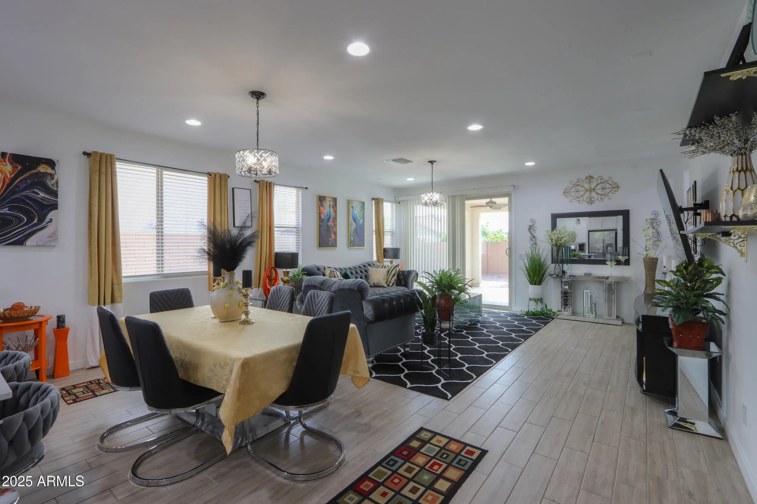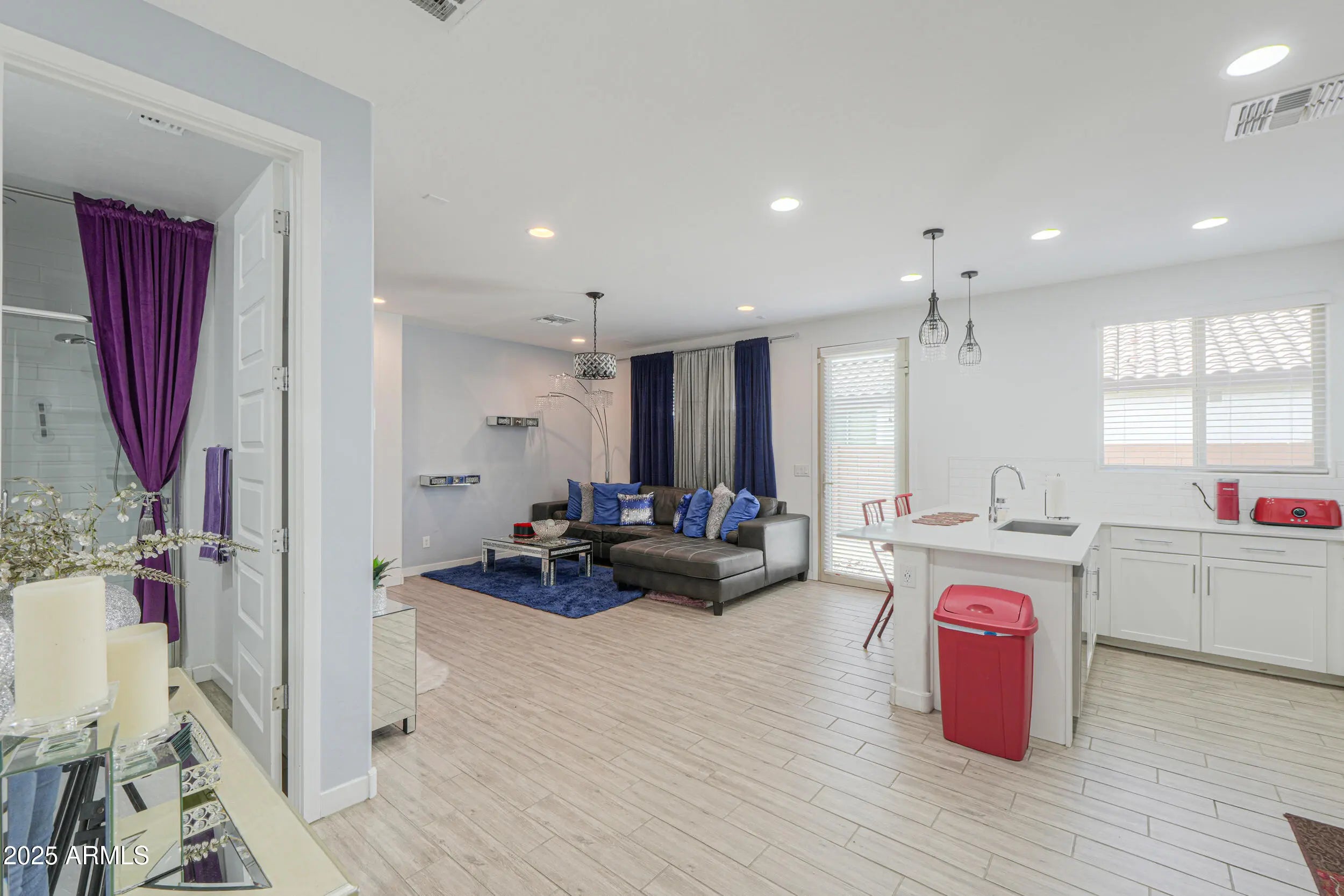 Welcome to this move-in ready Revolution-style residence offering 4 bedrooms, 3 bathrooms & two fully functional living quarters, perfect for multi-generational living or extended-stay guests. The main home features 3 bedrooms and 2 bathrooms, while the private in-law suite includes its own bedroom, bathroom, kitchen & separate exterior entry. Step inside the main living area to find wood-look tile flooring, plush carpeted bedrooms, recessed lighting & ceiling fans throughout. The spacious great room seamlessly opens to the dining area & eat in kitchen, complete with all stainless steel appliances, modern white cabinetry with sleek pulls, engineered stone countertops & a stylish tiled backsplash. The primary suite offers ample space with a walk-in closet, dual-sink vanity, large tiled shower & skylights for abundant natural light. The impressive in-law suite mirrors the same modern design aesthetic, featuring wood-look tile, a carpeted bedroom, recessed lighting & upgraded 6-panel doors. Its fully equipped private kitchen includes stainless steel appliances, gas stove, refrigerator, dishwasher & microwave, along with white cabinetry & contemporary finishes. Outside, the covered patio overlooks a backyard that is a true blank canvas, ready for you to design the outdoor oasis of your dreams. This exceptional home blends style, flexibility, and comfort.