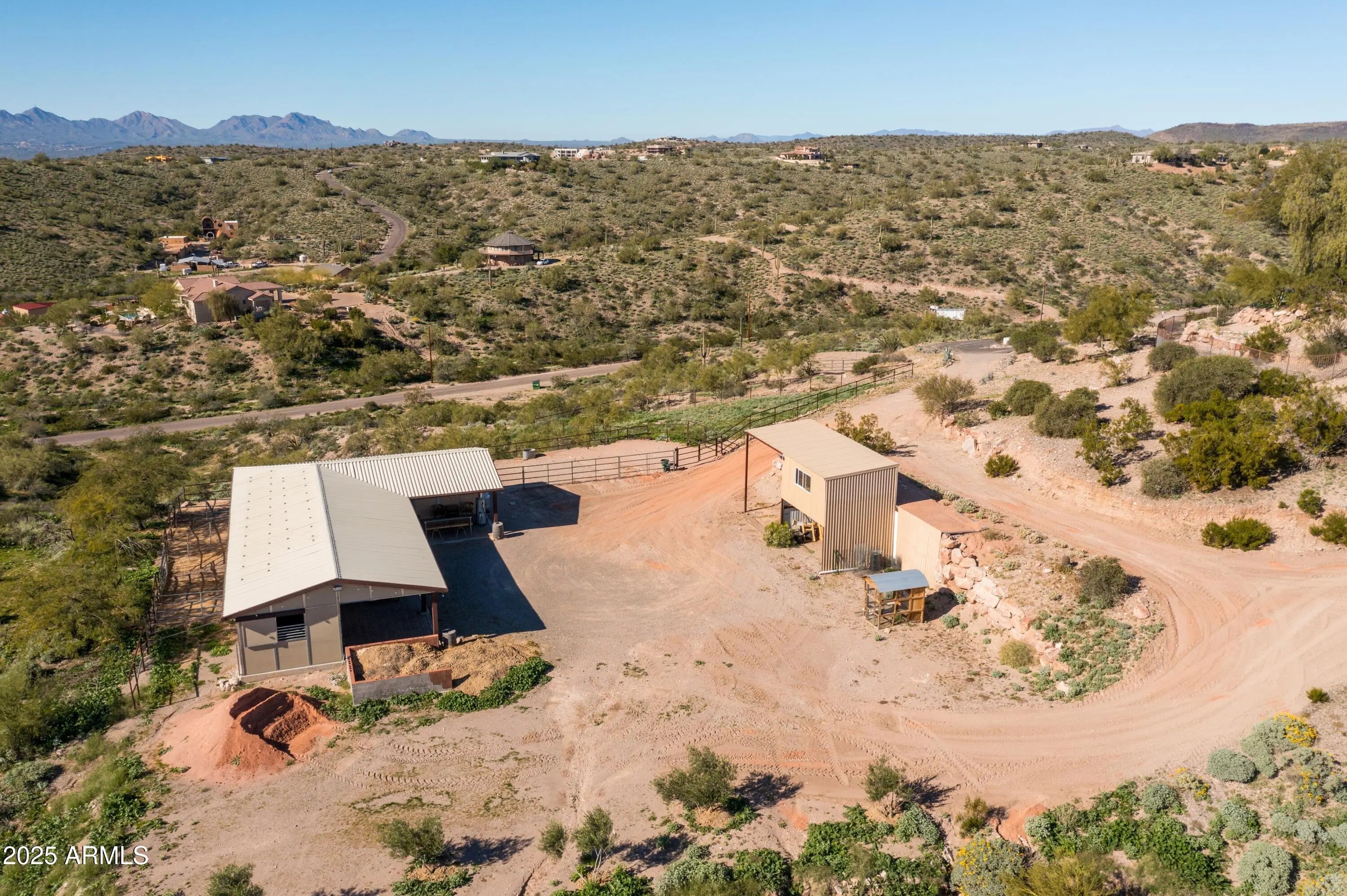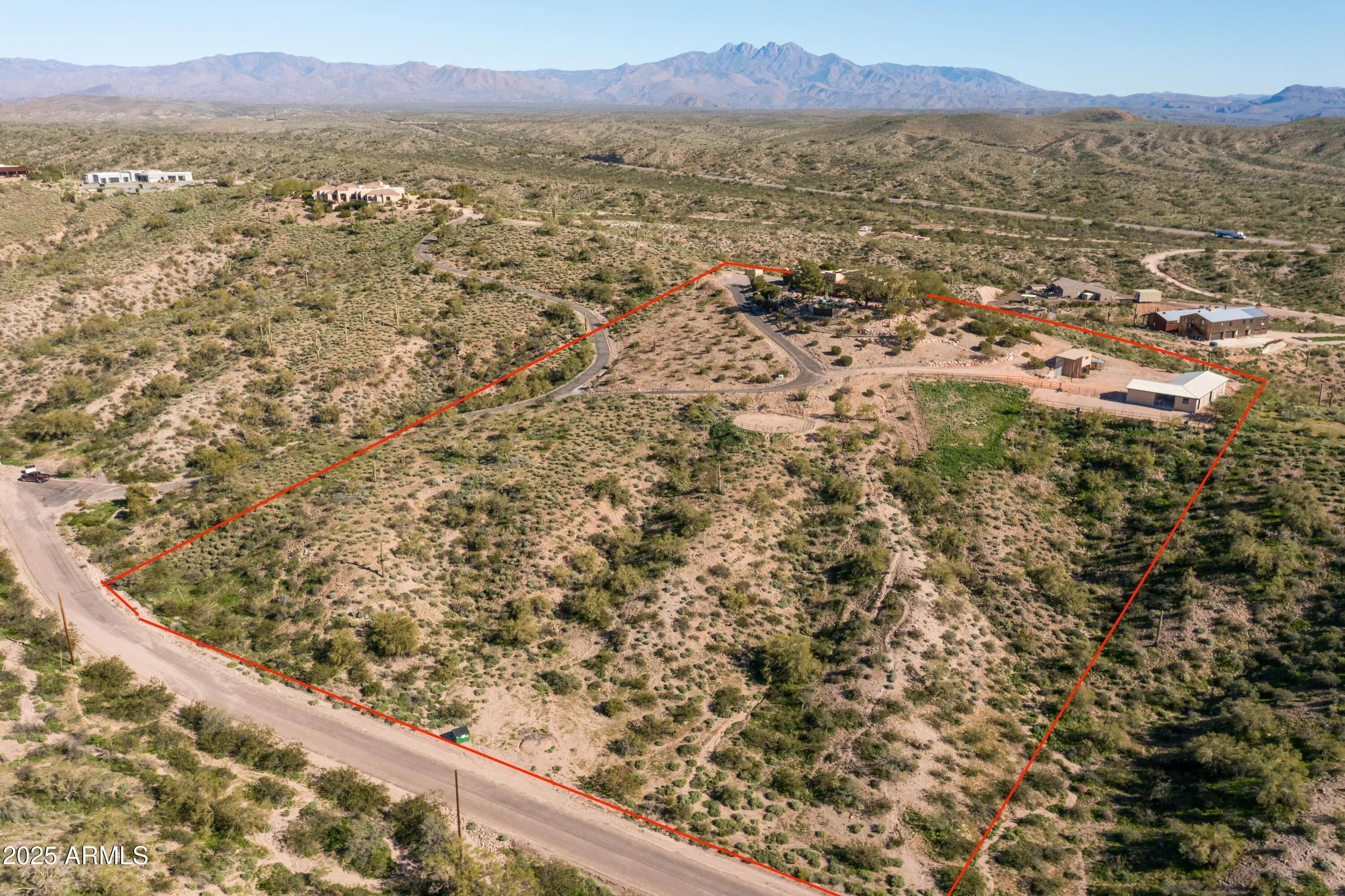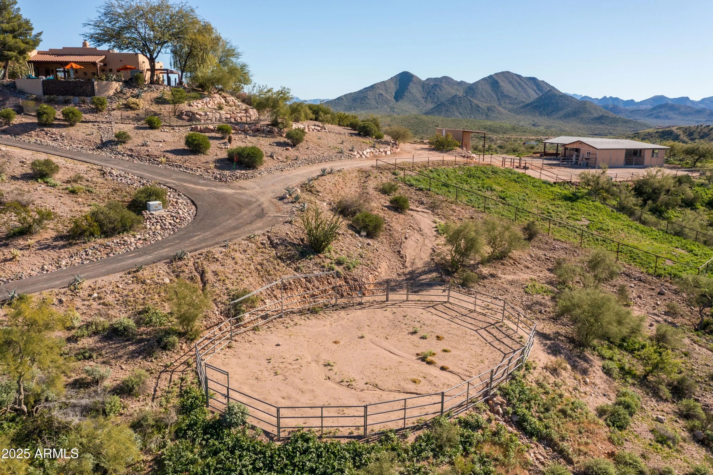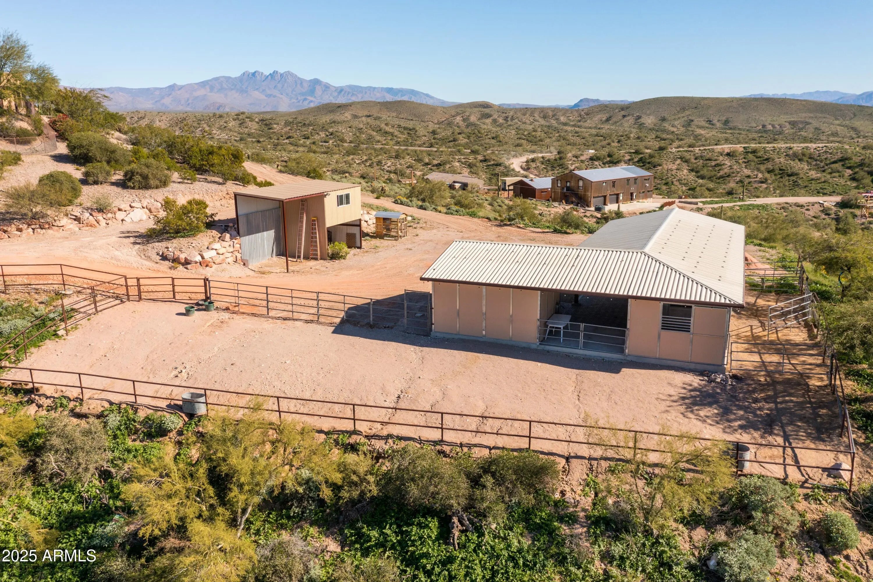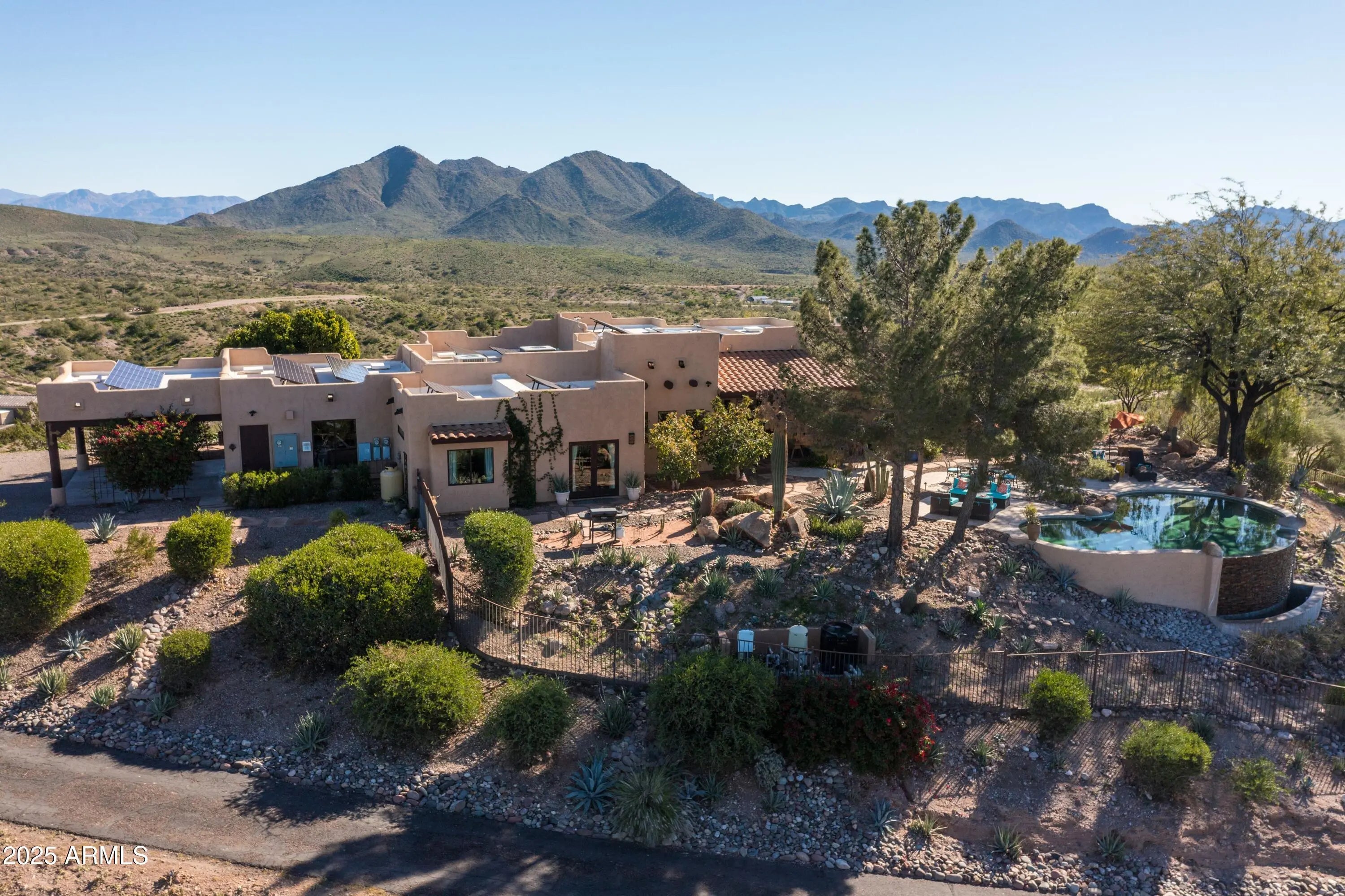 Welcome to Hummingbird Hill in scenic Goldfield Ranch. At 2,000 feet elevation, Mountain Views, Sunrises and Sunsets Galore! Ranch-style living without any steps. Only 35 min from Sky Harbor, yet a world away! Experience the best of Sonoran Desert living on your 6+ acre oasis; relax in your Pebbletec negative edge pool overlooking rolling hills of saguaro cactus and desert wildlife; Goldwater pine, mesquite and palo verde trees provide plenty of shade from the afternoon sun. Upgrades include solar panels on flat roof, 3 Tesla back up batteries, EV charging and AC in garage, new HVAC in primary suite (2025), 3,000 gallon cistern and new well pumps (2023); House interior painted neutral color palette and exterior painted with 25 yr warrantied Rhino Shield to complement the territorial architecture; Snake fence installed around perimeter of backyard to keep pets safe. Your horses will be at home in the 6-stall metal barn with tack room, paddock, round pen and hay storage area. The Tonto National Forest is a short horseback ride away. You can watch the Salt River band of wild horses from your front courtyard. Beautiful Saguaro Lake is only 15 min away! All new exterior Southwest lighting fixtures, patio lighting and matching custom security door. Two car garage and 2 car carport with a large parking area convenient when entertaining. World-Class Golf and Fine Dining only 10 min away at We-Ko-Pa Casino Resort. If you enjoy bird watching or stargazing, this home is for you!