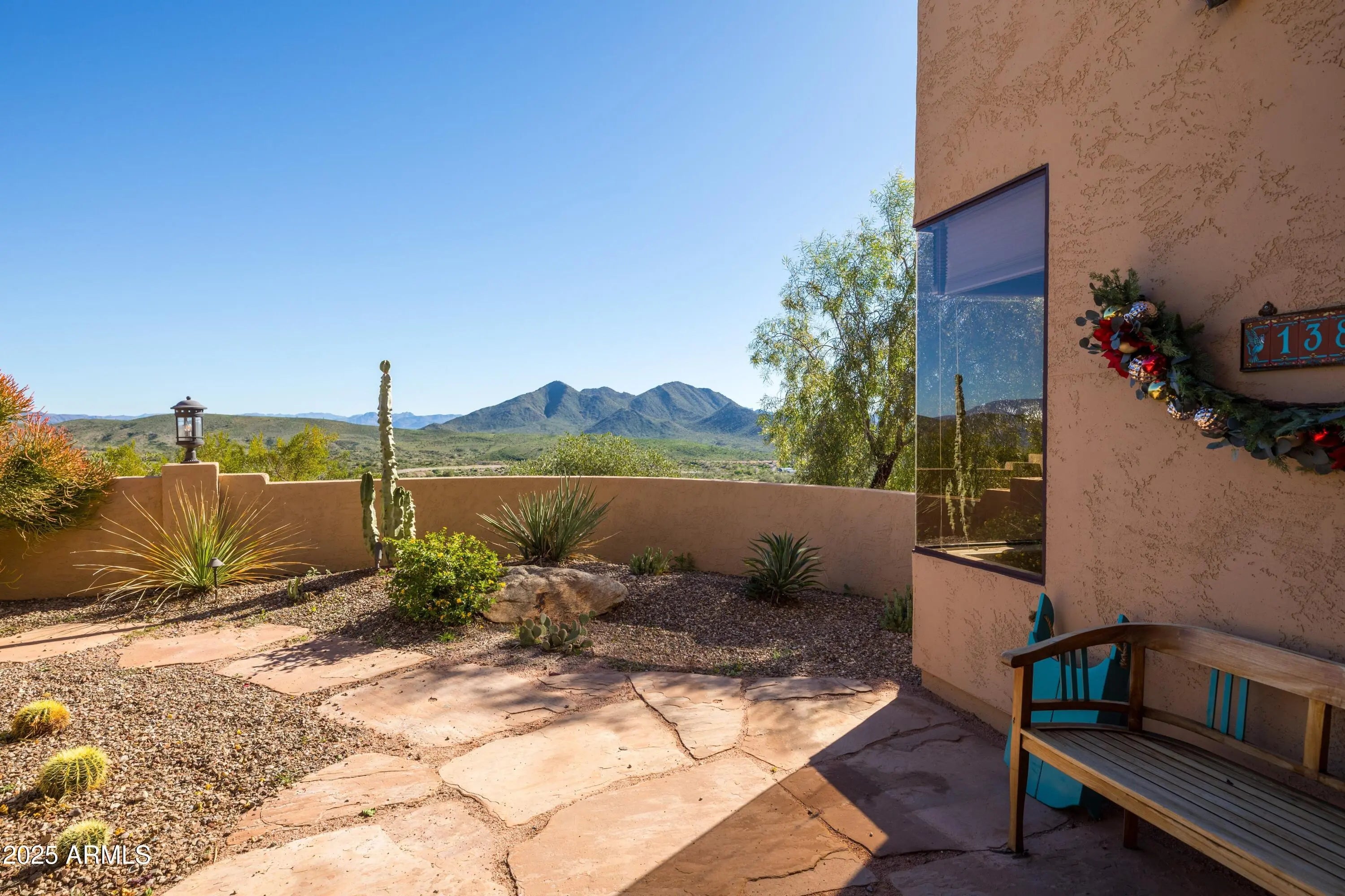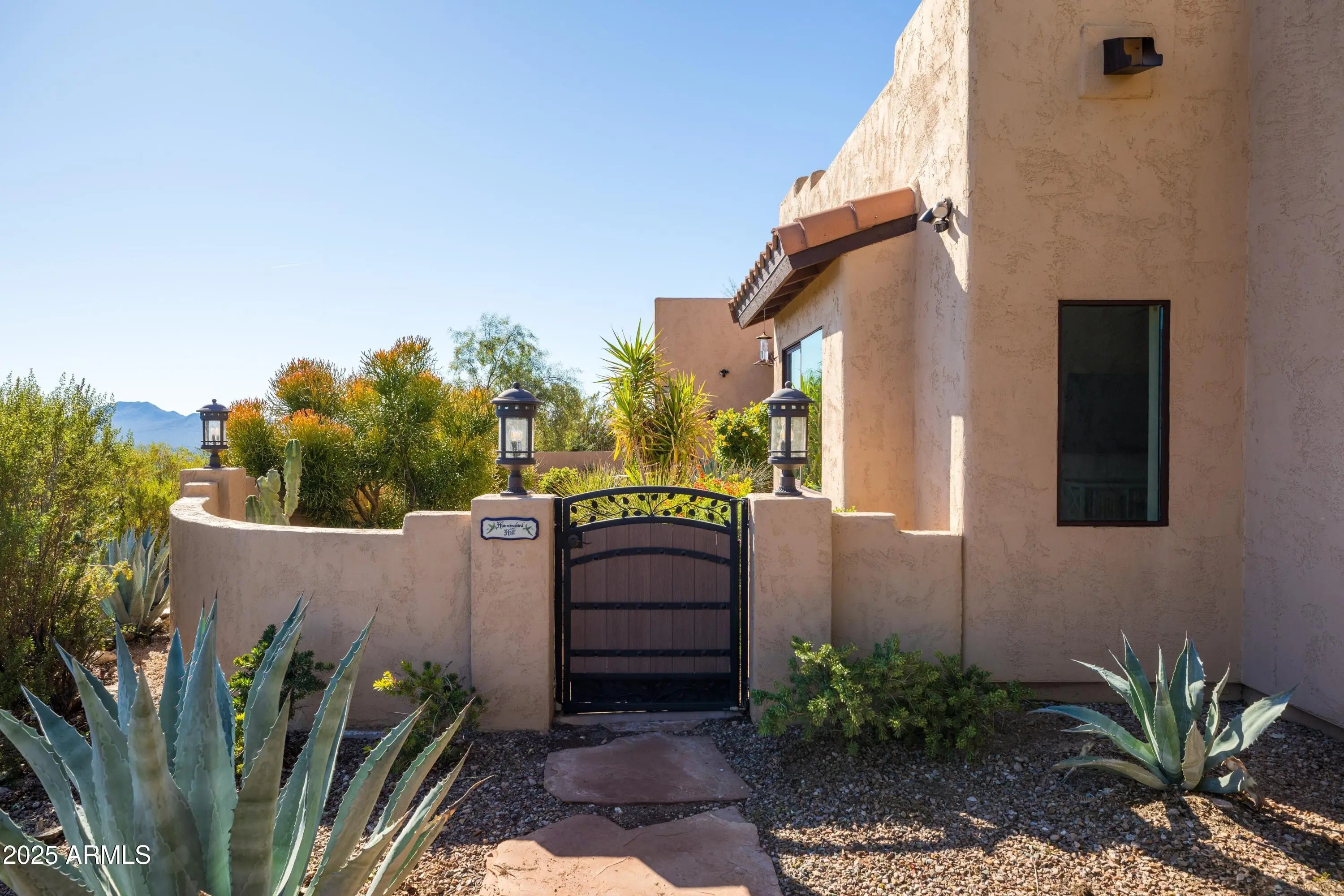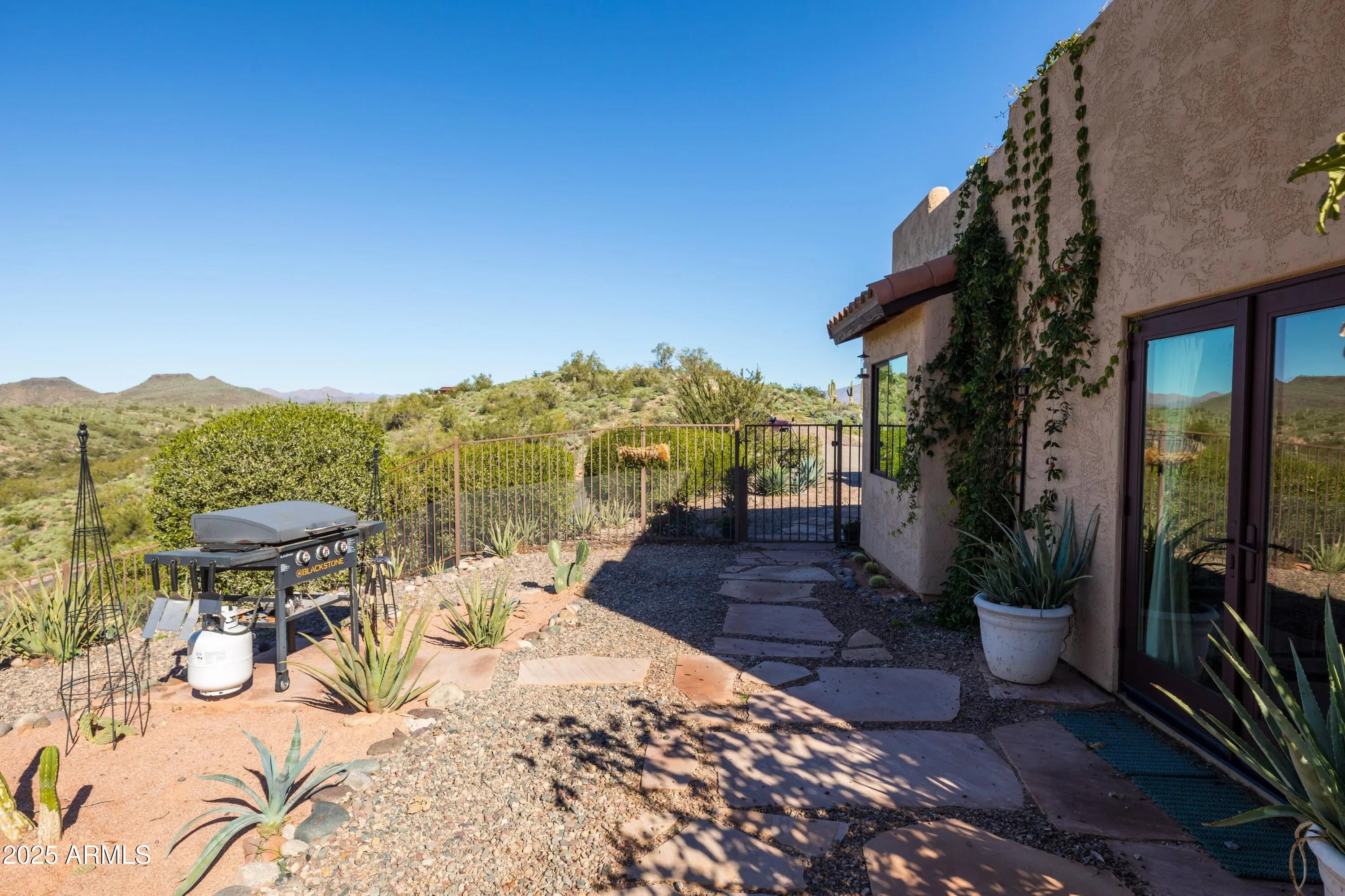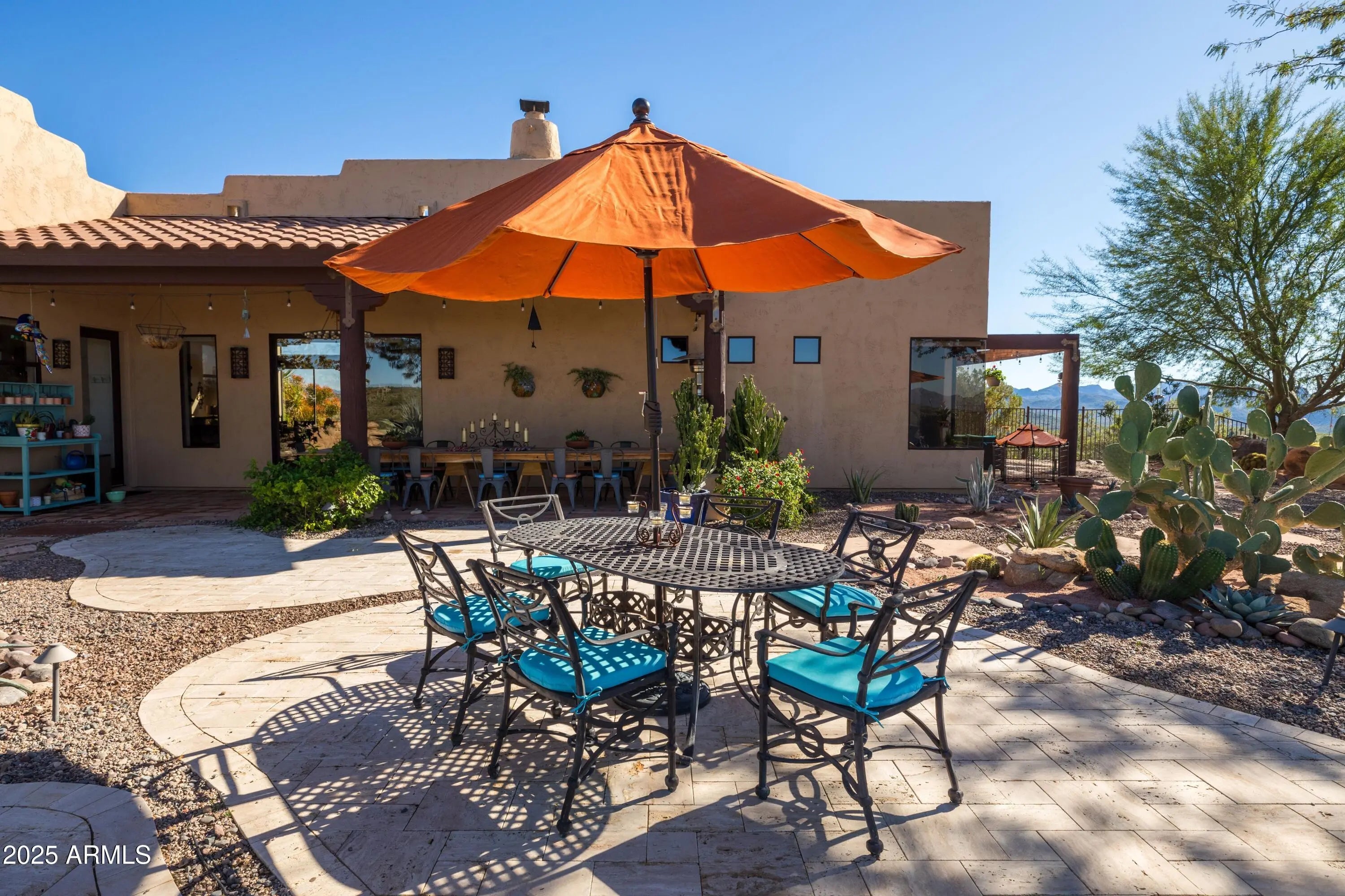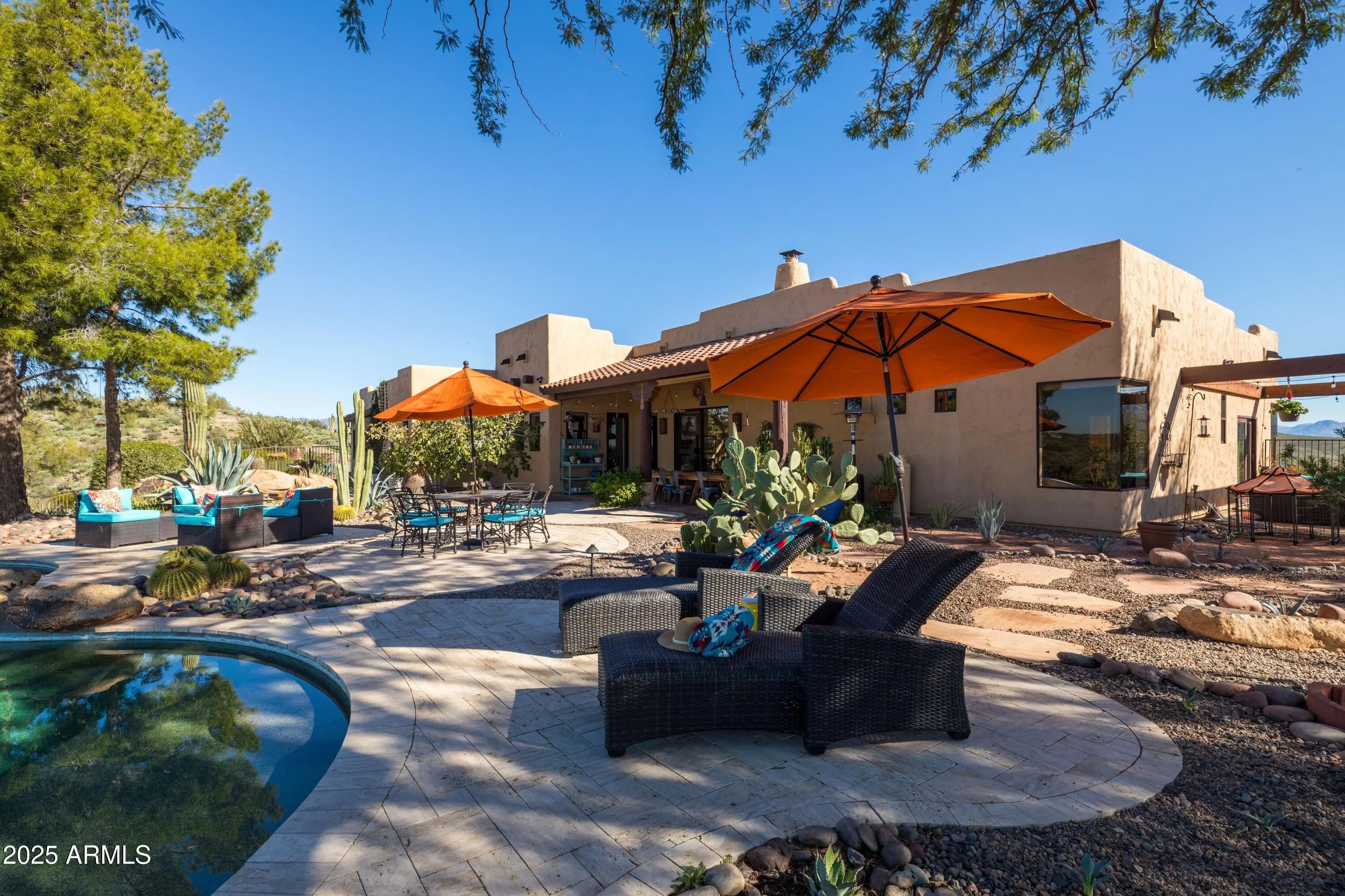 Welcome to Hummingbird Hill in scenic Goldfield Ranch. At 2,000 feet elevation, Mountain Views, Sunrises and Sunsets Galore! Ranch-style living without any steps. Only 35 min from Sky Harbor, yet a world away! Experience the best of Sonoran Desert living on your 6+ acre oasis; relax in your Pebbletec negative edge pool overlooking rolling hills of saguaro cactus and desert wildlife; Goldwater pine, mesquite and palo verde trees provide plenty of shade from the afternoon sun. Upgrades include solar panels on flat roof, 3 Tesla back up batteries, EV charging and AC in garage, new HVAC in primary suite (2025), 3,000 gallon cistern and new well pumps (2023); House interior painted neutral color palette and exterior painted with 25 yr warrantied Rhino Shield to complement the territorial architecture; Snake fence installed around perimeter of backyard to keep pets safe. Your horses will be at home in the 6-stall metal barn with tack room, paddock, round pen and hay storage area. The Tonto National Forest is a short horseback ride away. You can watch the Salt River band of wild horses from your front courtyard. Beautiful Saguaro Lake is only 15 min away! All new exterior Southwest lighting fixtures, patio lighting and matching custom security door. Two car garage and 2 car carport with a large parking area convenient when entertaining. World-Class Golf and Fine Dining only 10 min away at We-Ko-Pa Casino Resort. If you enjoy bird watching or stargazing, this home is for you!
