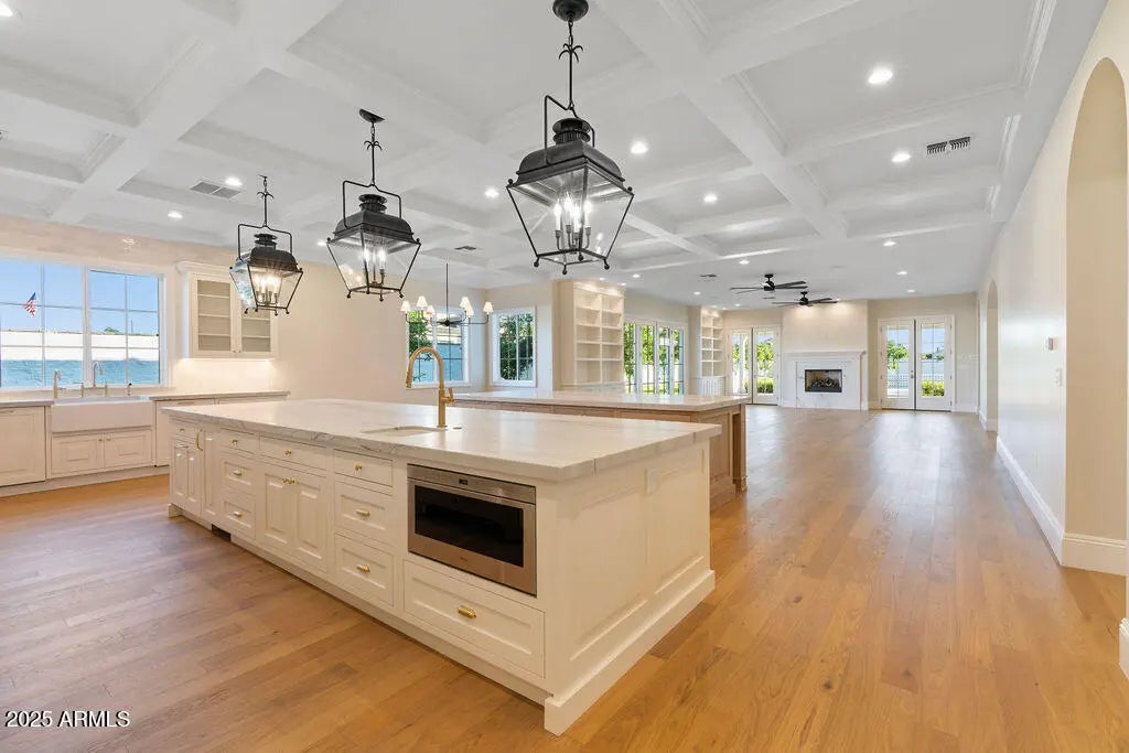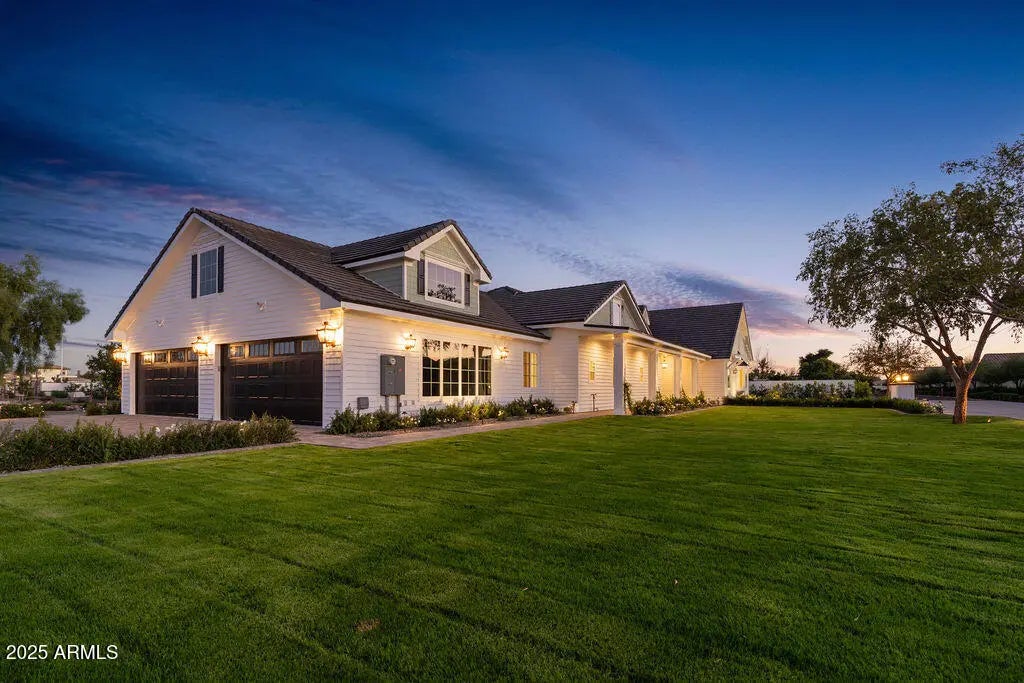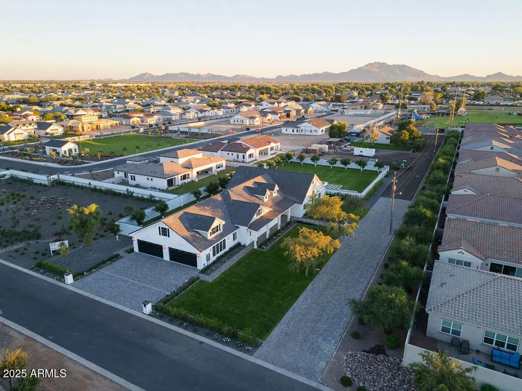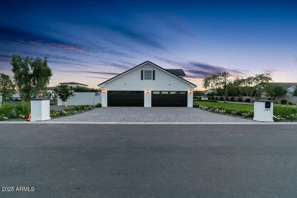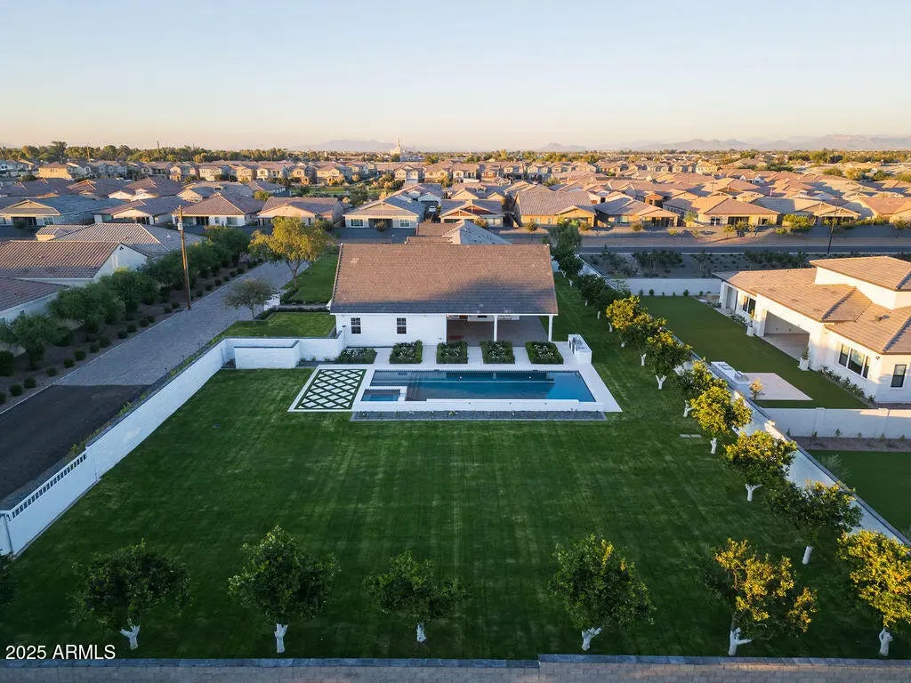 Step inside this luxurious, fully custom cottage-core new build: 4 bed, 3.5 bath, 4,172 sqft wrapped head-to-toe in James Hardie Artisan concrete board siding on a 43,223 sqft fully landscaped lot with mature citrus trees. Pre-wired Cox Wi-Fi, Netgear data ports, Wi-Fi boosters included. Built-in 8K security cameras. An arched black solid-wood door opens to a checkered gray/white tile foyer with an oval window. Great room with 10-ft ceilings, 6 channel surround sound, marble fireplace, two built-in shelves, and natural light pouring in from floor-to-ceiling glass doors that open to the integrated kitchen: quartz double islands, recessed lighting, ivory custom cabinetry, ILVE 48" range + hood, Sub-Zero fridge/freezer, Scotsman pebble ice, Wolf drawer microwave, prep sink, reverse osmosis, two Cove dishwashers on each side of the oversized main sink in front of a large window. Cozy table nook crowned by a gorgeous chandelier. Double doors lead to a sage-green prep kitchen/walk-in pantry: Wolf convection steam oven, beverage fridge, deep sink in front of a large window, prep counter, and ample cabinet space. Primary suite: dedicated thermostat (one in each bedroom), patio access, 5-channel surround sound. Primary bath: freestanding tub beneath a chandelier, glass shower with bench + 3 heads + digital thermostat/controls, dual vanity with makeup station, and private toilet room. His closet: bluish-gray custom cabinetry, shoe wall, quartz counters, built-in laundry hampers. Her closet: built-in bench under a massive window, ivory custom cabinetry, shoe wall, quartz counters, built-in laundry hampers. Bedroom 2: walk-in closet, en-suite bath with digital thermostat/controls, frosted window. Bedrooms 3 & 4: large windows, recessed closets. Baby-blue Jack-and-Jill bath with split vanity + tub/shower. Laundry/mudroom: utility sink, quartz counter over washer/dryer, floor-to-ceiling cubbies, abundant cabinet space. 4-car garage: epoxy floors, ceiling speakers, security cameras, large windows for natural light, and an attached flex room (office/storage). Backyard: covered patio with fireplace, dual fans, ceiling speakers, private pool/spa, citrus tree perimeter, built-in grill station with gas stove, grill, True mini fridge, sink, and counter space. RV gate with space for future garage/casita.
