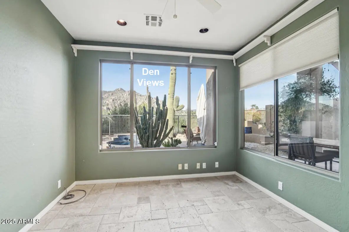 PRIVATE BACKYARD WITH HUGE BLACK MOUNTAIN VIEWS AND ZERO WASTED SPACE in this popular 2 bed, 2 baths GREAT ROOM home that backs to ACRES OF LUSH NATURAL PRESERVE and is located in a cul du sac just steps from the Terravita Clubhouse and Marketplace. Terravita's most popular & award-winning floorplan an open great room with 3 bedrooms that all have a walk-in closet,3 baths + Den AND the guest casita creates a fantastic courtyard in front. ROOF AND MAIN HVAC HAVE BEEN REPLACED and the roof has a full 10 year warranty! Appliances 6 months old and under warranty. This home is reconfigured to have a private den with INCREDIBLE VIEWS. Here are some of the features: Most p popular greatroom floorplan, Huge Mountain Views, Close To clubhouse & Market Center, Updated, HVAC & Roof Replaced, Brand new Stainless steel appliances, Brand New Roof with Full 10 year Warranty Kitchen Updated cabinets and flooring Solid wood, honey-finished vertical-slat cabinetry Pantry-height cabinetry for a clean, built-in look Stainless-steel French-door refrigerator (6 months old, under warranty) Stainless-steel gas range with double oven Stainless-steel microwave Deep stainless-steel sink with sleek modern faucet Gorgeous marble slab countertops with generous prep space Black tile backsplash for warm modern contrast Under-cabinet glass-block windows for natural light Tumbled-travertine stone flooring Curved peninsula with breakfast-bar seating Open sightline toward the great room Neutral paint and recessed lighting Interior Features Cabinets and floors updated; primary bath recently refreshed Tumbled travertine flooring laid in a Versailles pattern Wall of glass from primary bedroom overlooking the backyard Glass door from second bedroom opening to private courtyard Custom storage additions throughout New Toto toilets throughout Neutral, light-filled interiors Primary Suite Custom carved wood vanity with ornate detailing Dual sinks with oil-rubbed bronze faucets Rich stone countertop with natural veining Two framed mirrors and three decorative light fixtures Travertine tile flooring Walk-in shower with travertine surround and glass panel Large privacy-shaded window for natural light Recessed lighting and textured walls Outdoor Living & Backyard Oversized backyard designed for year-round enjoyment Spectacular mountain views with The Boulders prominently visible Huge mountain views from all rear windows Large heated spool (spa + small pool combo) Built-in outdoor kiva fireplace with blue-tile accents Extended flagstone patio blending into the desert landscape Multiple seating and gathering areas Desert-friendly landscaping with cactus, boulders, and gravel Three mature saguaros as dramatic landscape focal points West-facing orientation for stunning sunset views Open-view wrought-iron fencing for unobstructed vistas Courtyard Flagstone front courtyard Private custom gate Direct access from second bedroom Front Yard Lush desert-botanical landscaping Mature shade tree providing filtered light Multiple barrel cacti (Golden Barrels) Tall columnar cacti including additional saguaros Large architectural agave Euphorbia/candelabra-style cactus adding vertical interest Natural boulders and low-maintenance gravel Extended driveway leading to two-car garage Clean desert-tone stucco exterior Garage Epoxied garage floor Extensive built-in storage Additional custom shelving and organization Welcome to Terravita - Where Lifestyle is the True Luxury Dear Prospective Homebuyer, If you're considering making Terravita your home, know that you're not just buying a property; you're embracing a lifestyle that's rich, engaging, and brimming with opportunities. Terravita stands as a testament to a community that values experiences, relationships, and personal growth over mere bricks and mortar. Here, the house you buy is simply a gateway to the life you desire. A visit to Terravita's clubhouse and a brief tour of the amenities is essential - it's not just recommended; it's crucial. It is literally what you are buying. If you are just looking for a house, this is likely not the place for you. Dialing 480-488- 3456 can set you on a path to discovering a world where every day is a new adventure. This initial tour is more than just a walkthrough; it's an eye-opener to the vibrant, active lifestyle that awaits you. Many have said that understanding the depth and breadth of Terravita's amenities was a pivotal moment in their decision to join our community. We invite you to take the first step towards discovering if Terravita is the right fit for you. It's not just about finding a home; it's about finding a place where you can live your life to the fullest. The lifestyle you've dreamed of is here, waiting for you to embrace it. Remember, exploring Terravita starts with a tour of our clubhouse and amenities. Make that choice today and open the door to a world where life is rich, full, and wonderfully yours. Terravita is a guard gated 823 acre planned community which consists of many amenities including an 18 hole championship golf course, a 39,000 square foot newly remodeled clubhouse facility with 2 dining areas, a heated 25 meter pool with easy beach front entrance and hot tub, 6 tennis courts and a full-time tennis pro, a 13,000 square foot health and fitness center, community-wide 6 mile long walking and jogging trails, and extensive event calendar with fun-filled events for the dozens of social organizations. Terravita Golf and Country Club has been voted Best Master Planned Community and Best Private Golf Club numerous times by Ranking Arizona. Terravita was created by Del Webb and was their first non-age restricted community. Terravita golf course was created by PGA Hall of Fame member Billy Casper and designer Greg Nash. Terravita golf amenities include a pro shop, a large driving range, and four separate areas to practice chipping and putting.