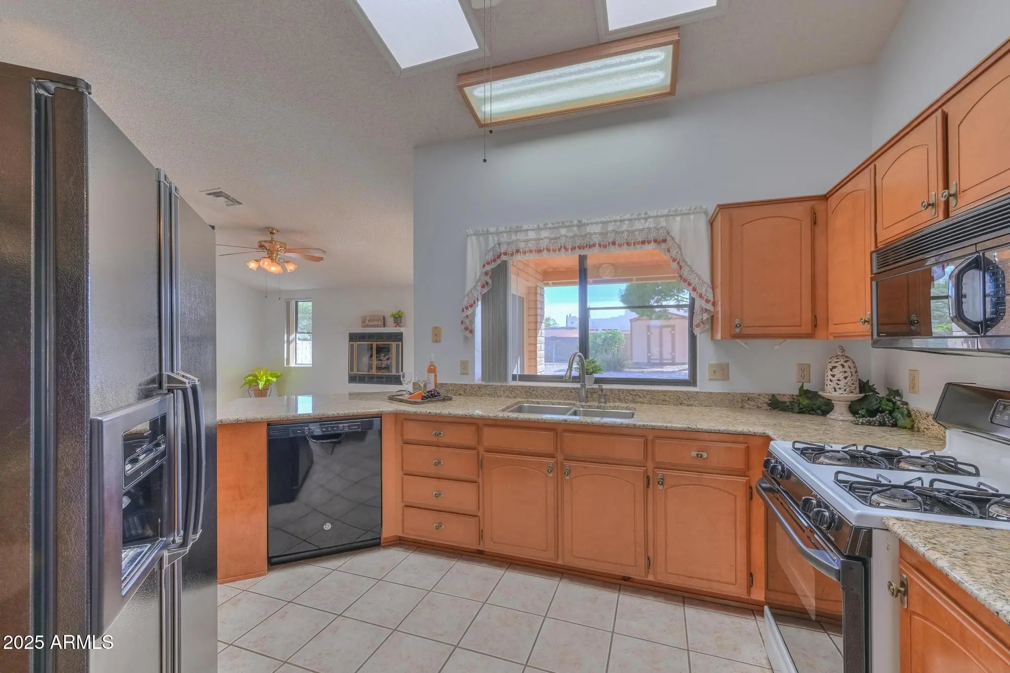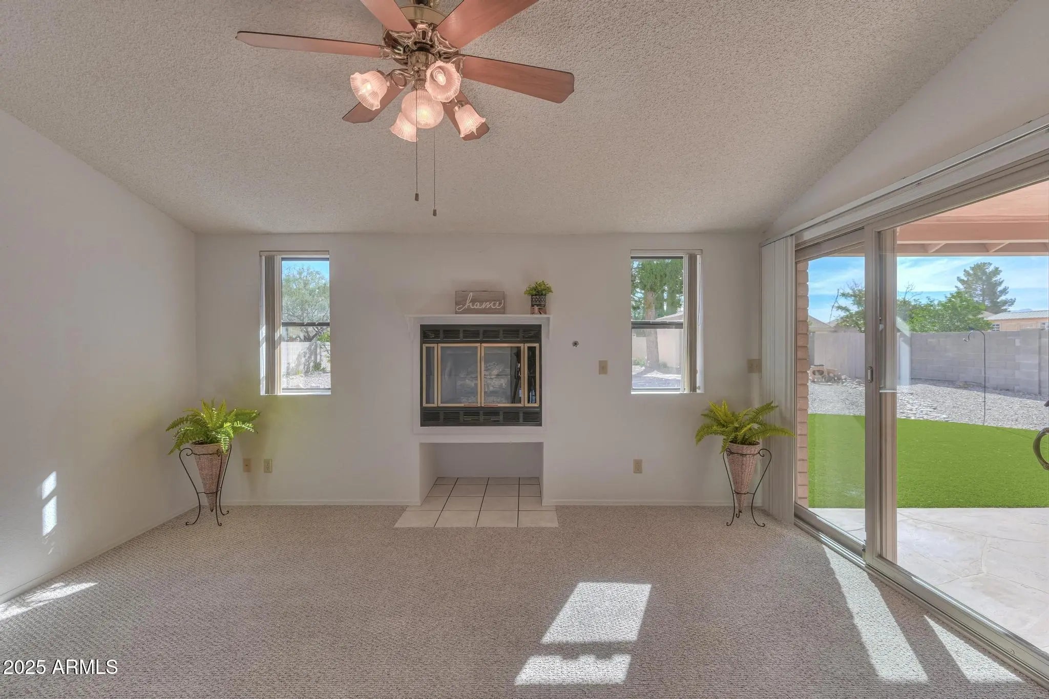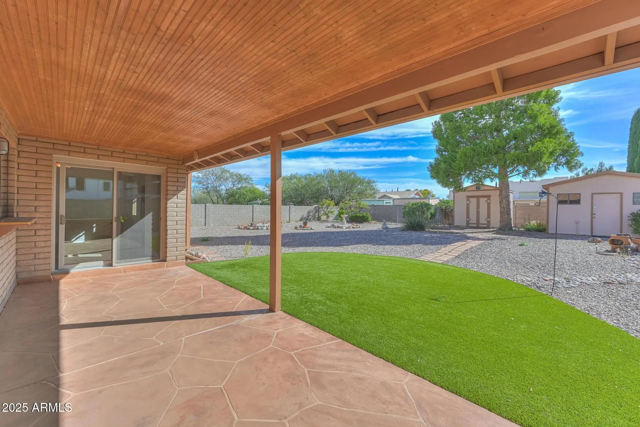 Beautifully maintained and move-in ready! This spacious 3 bedroom, 2 bath home offers 1,866 sq. ft. of comfort and style. The open kitchen features granite countertops, wood cabinetry, black appliances, and a pantry closet, flowing seamlessly into both the family and dining spaces. Enjoy a cozy gas fireplace in the family room and a bay window with storage in front living room. Vaulted ceilings, tile and carpet throughout. A split floor plan with a spacious primary suite, bay window with built-ins and walk-in shower and closet. Outdoors, relax under a huge covered patio with flagstone and turf, surrounded by mature, low-maintenance landscaping, dual RV gates, two storage sheds, and block wall fencing, in a fantastic central location close to shopping, dining, schools, and Fort Huachuca.