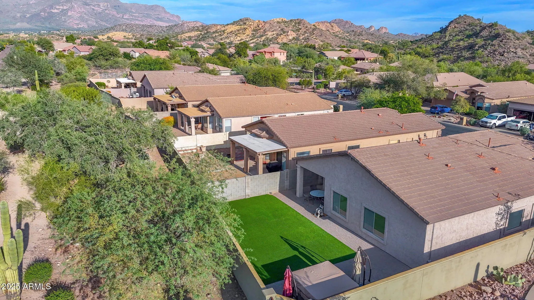 Welcome to your desert retreat in the heart of Gold Canyon! This beautifully maintained 3-bedroom, 2-bath home offers a spacious split floor plan and a flexible bonus space within the owner's suite—perfect for a nursery, office, or private sitting area. The light and bright eat-in kitchen features freshly painted interiors, new stainless steel appliances, and ample cabinet space for the home chef. Step outside to a private backyard designed for relaxation with low-maintenance turf, a soothing hot tub, and stunning mountain views that capture the essence of Arizona living. Enjoy the resort-style amenities of this beautiful community, including a sparkling pool and well-kept common areas. With its peaceful setting, updated finishes, and inviting layout, this home combines comfort, function, and beautyready for you to move in and enjoy.